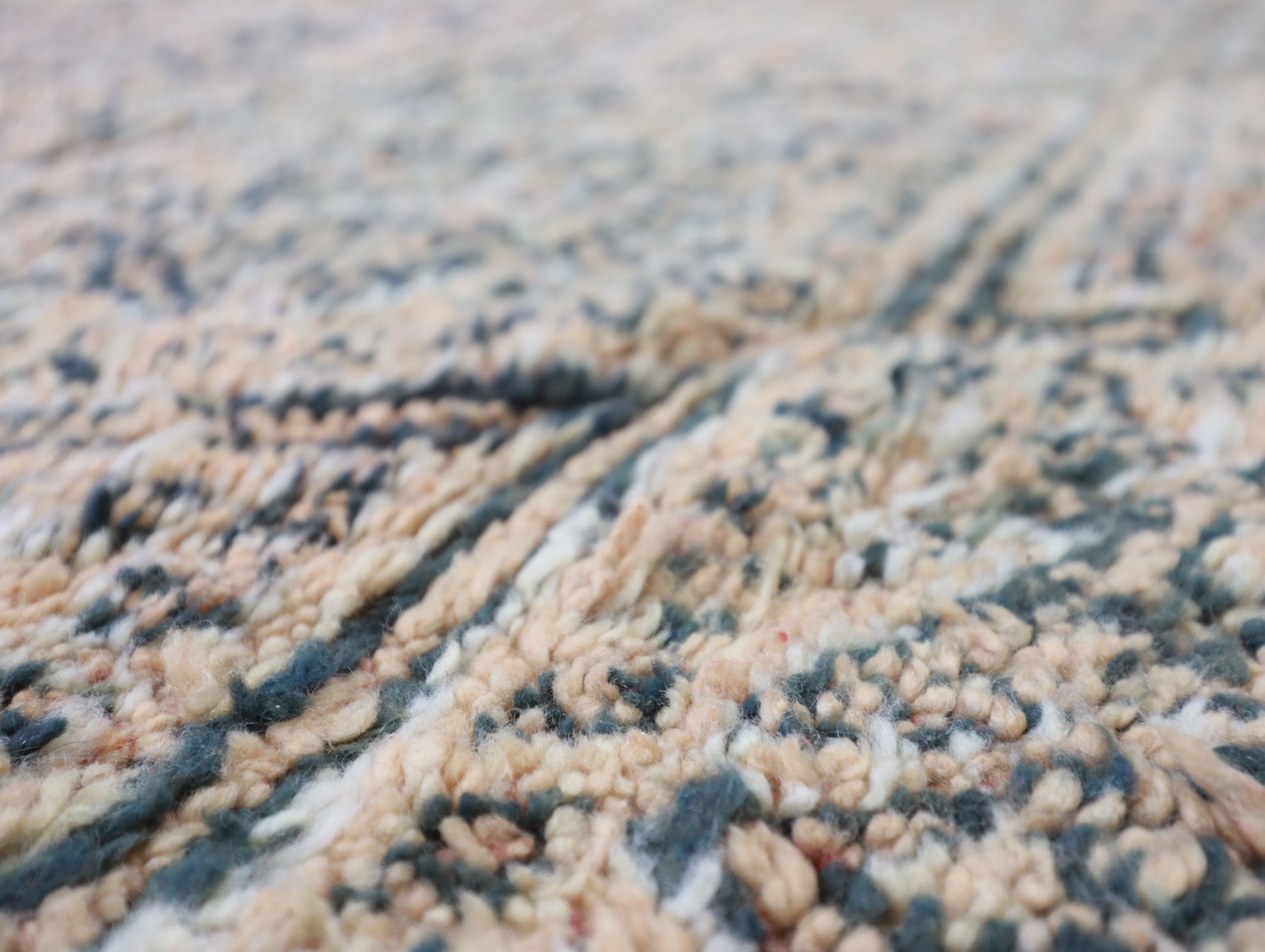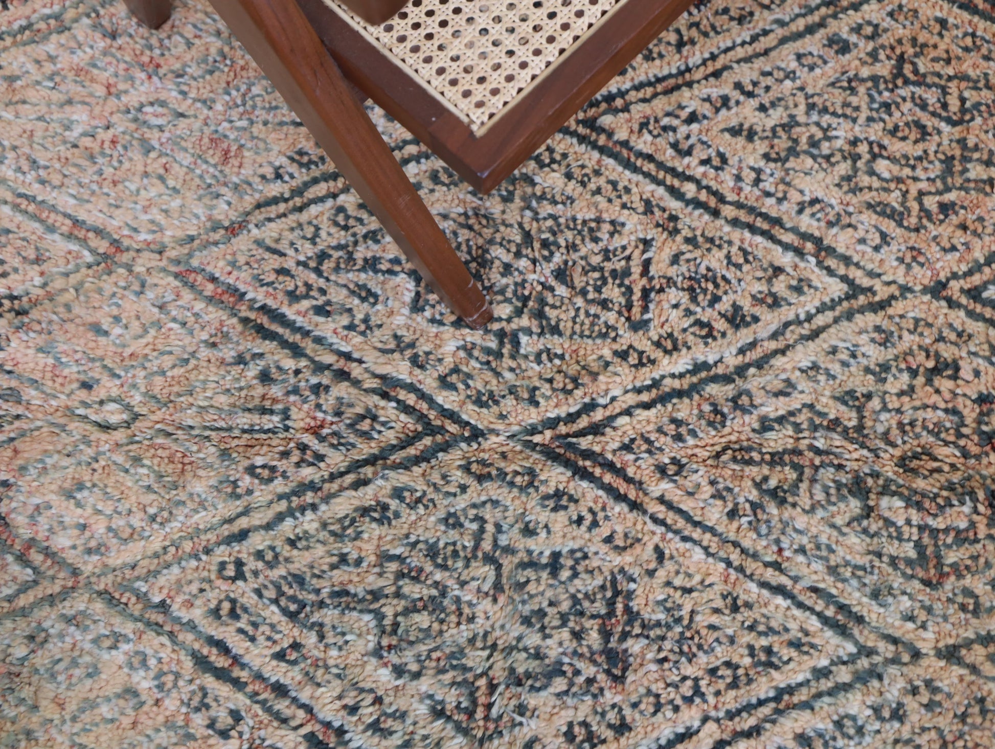 Wool, a sacred material for the Amazigh (Berber) people, forms the cornerstone of Moroccan rug design. Durable, long-lasting, and soft underfoot, wool is both functional and comfortable. In this piece, the wool pile is expertly knotted onto a wool foundation, adding substance and allowing it to gracefully embrace the floor.