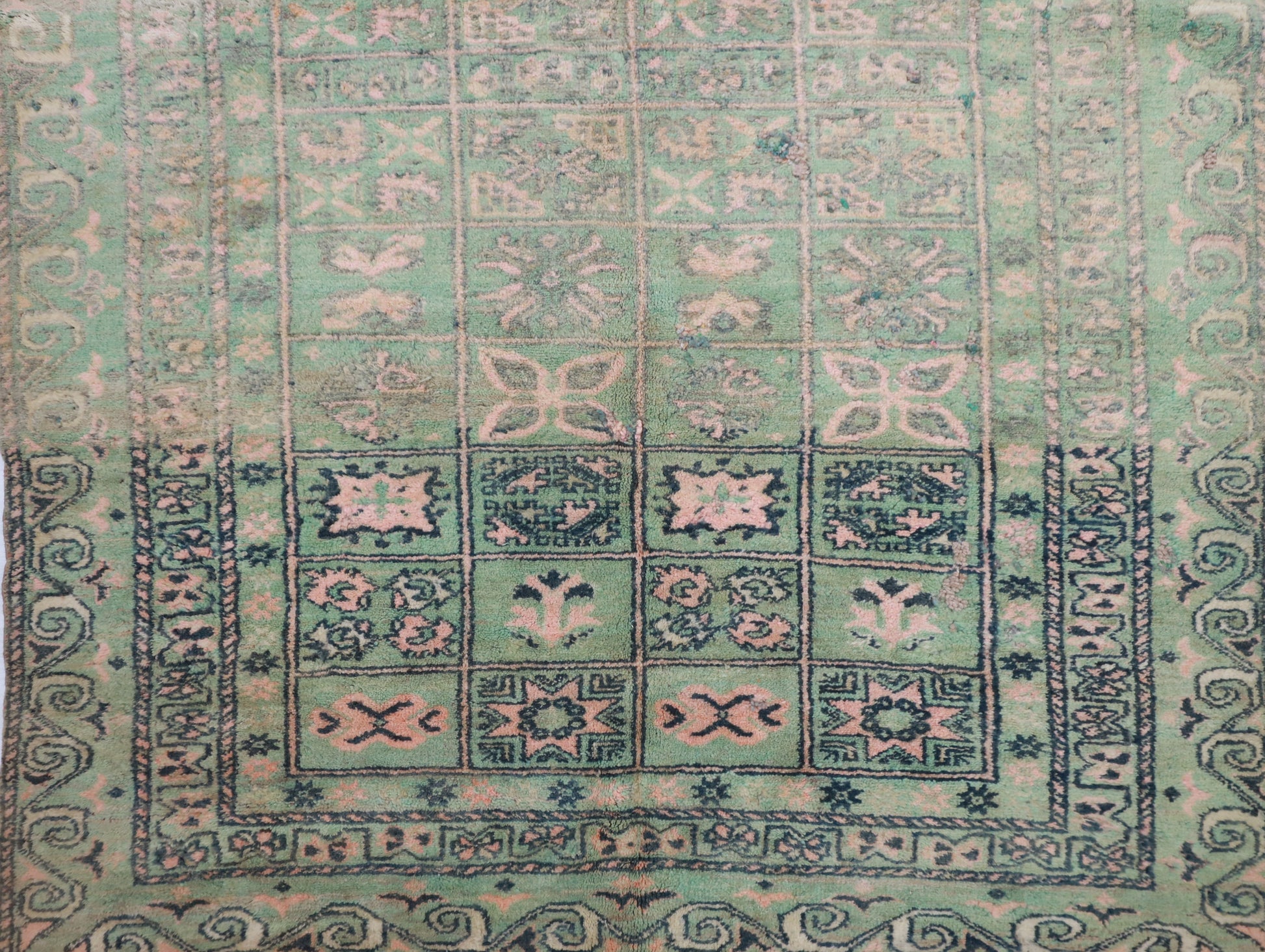 Though this rug has undergone professional cleaning, its age has imparted characteristic wear. Such natural variations and imperfections are expected in these handcrafted vintage treasures.