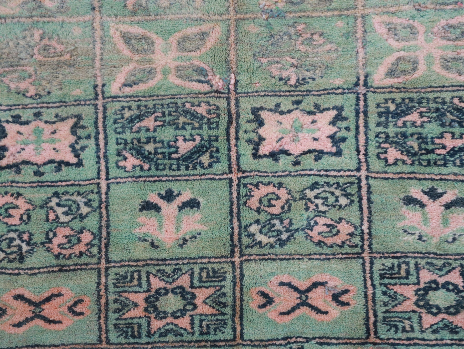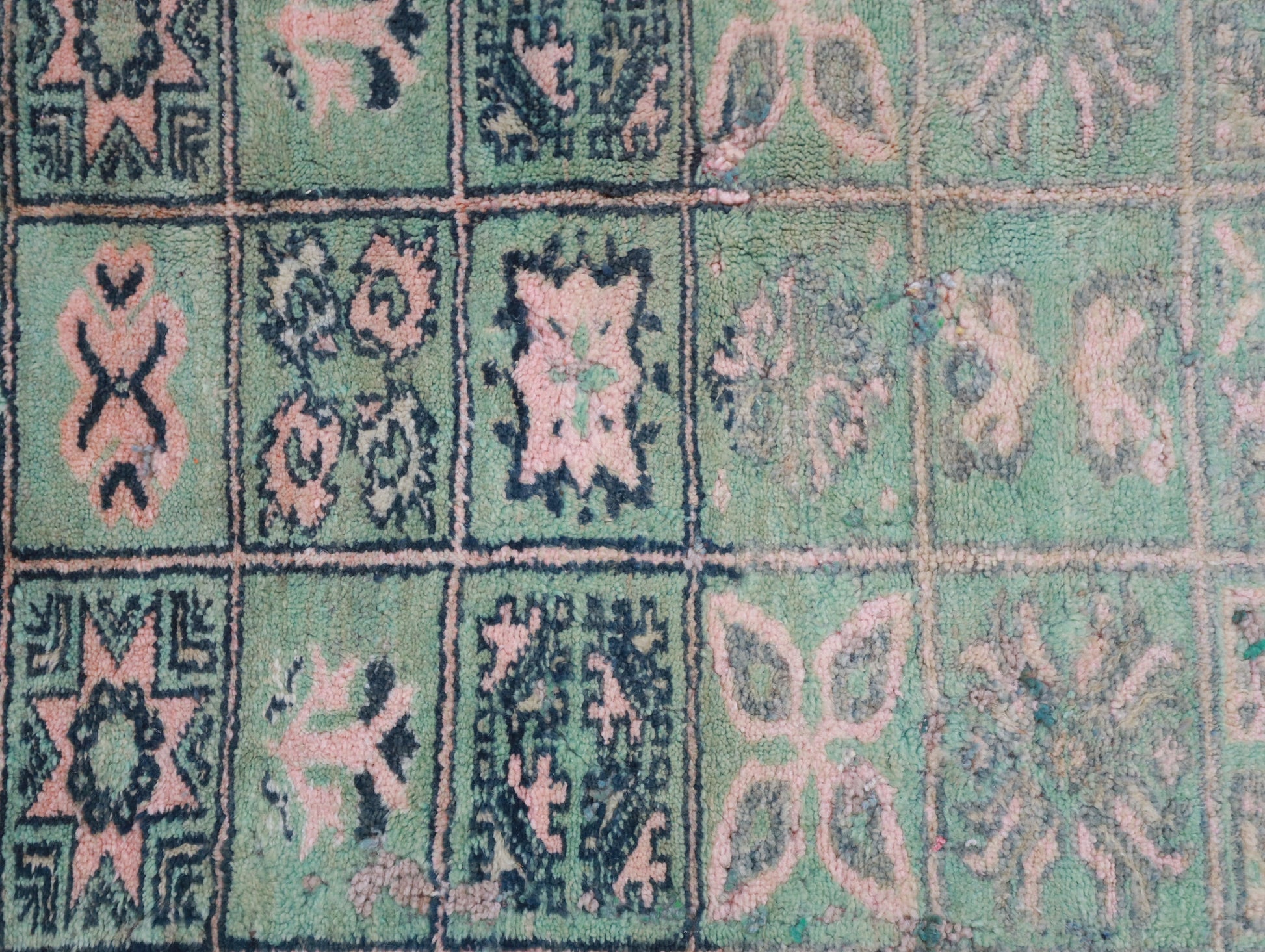 Wool, a sacred material for the Amazigh (Berber) people, forms the cornerstone of Moroccan rug design. Durable, long-lasting, and soft underfoot, wool is both functional and comfortable. In this piece, the wool pile is expertly knotted onto a wool foundation, adding substance and allowing it to gracefully embrace the floor.