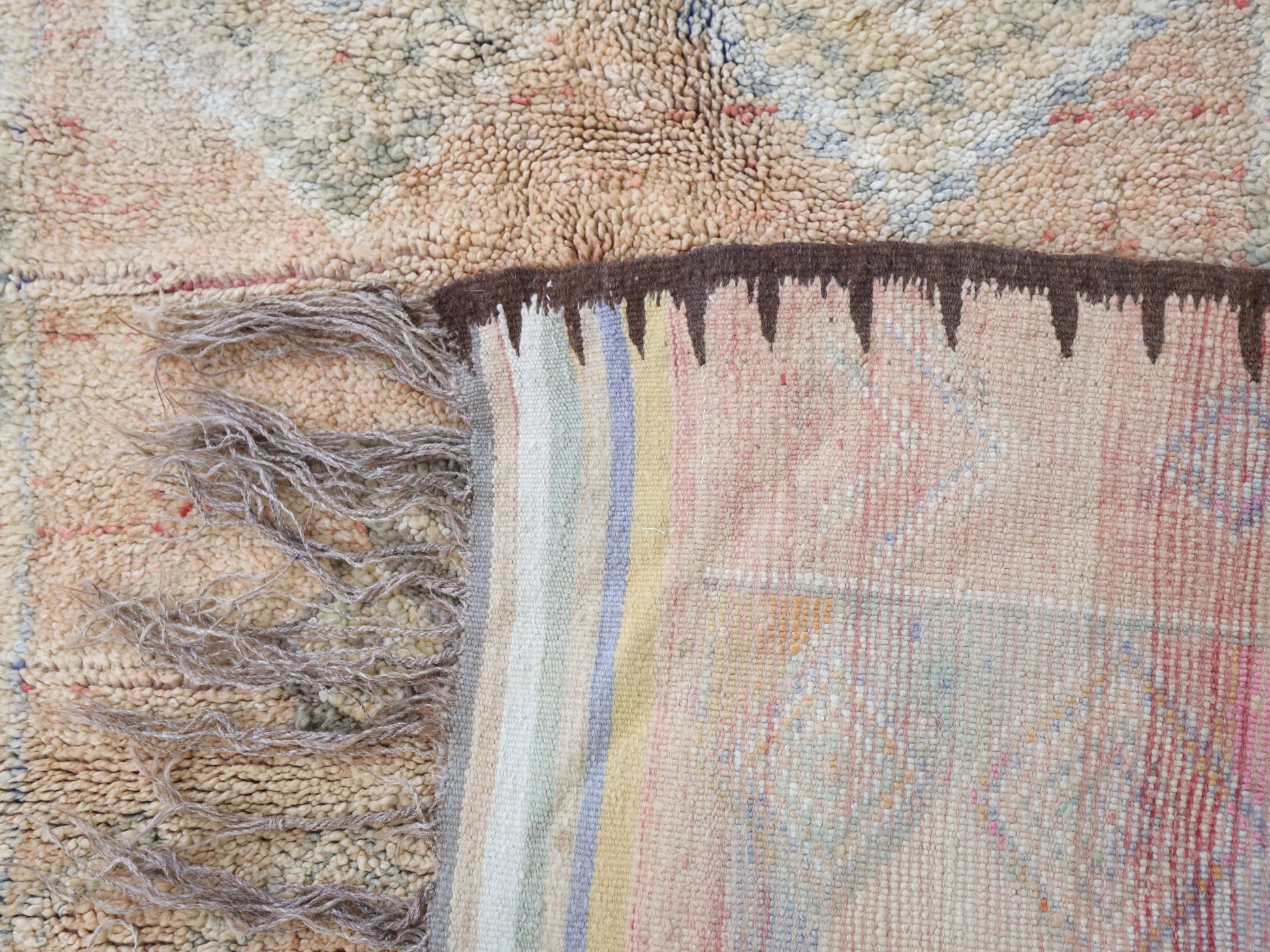 Originating in the Holy town of Boujad, these rugs, woven by diverse tribes, exhibit a wide spectrum of color, composition, and weave. Described as surreal, mystic, and mesmerizing, Boujad rugs transport us to a world beyond reality. Their construction, with twice as many horizontal as vertical knots, renders them floppy and easy to move.