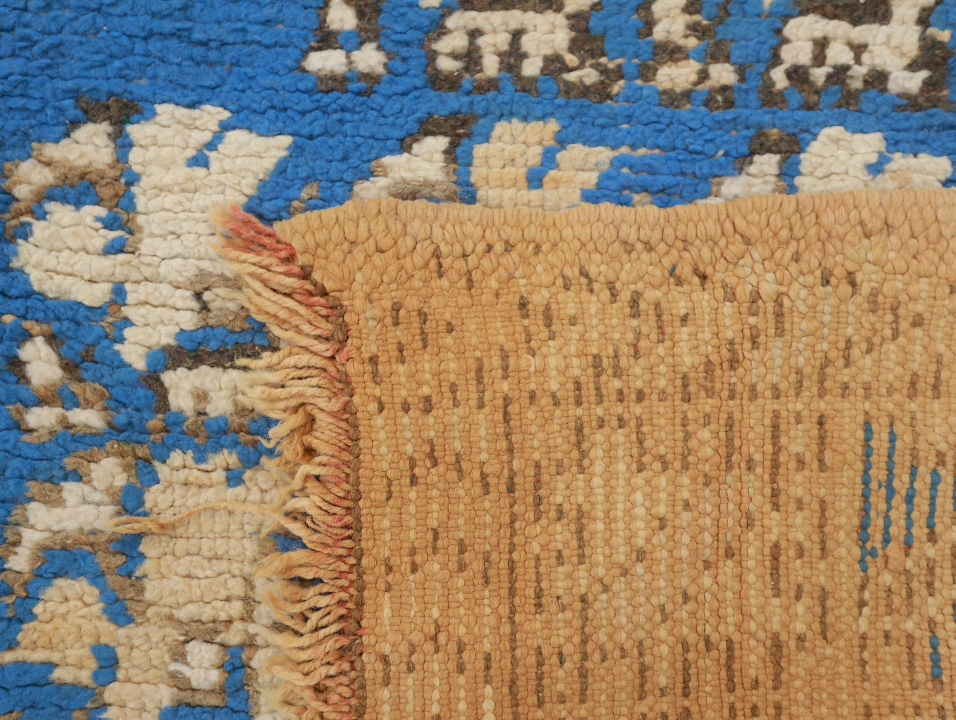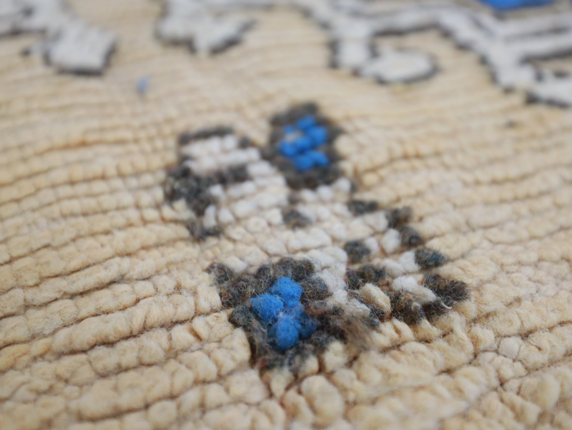 Wool, a sacred material for the Amazigh (Berber) people, forms the cornerstone of Moroccan rug design. Durable, long-lasting, and soft underfoot, wool is both functional and comfortable. In this piece, the wool pile is expertly knotted onto a wool foundation, adding substance and allowing it to gracefully embrace the floor.