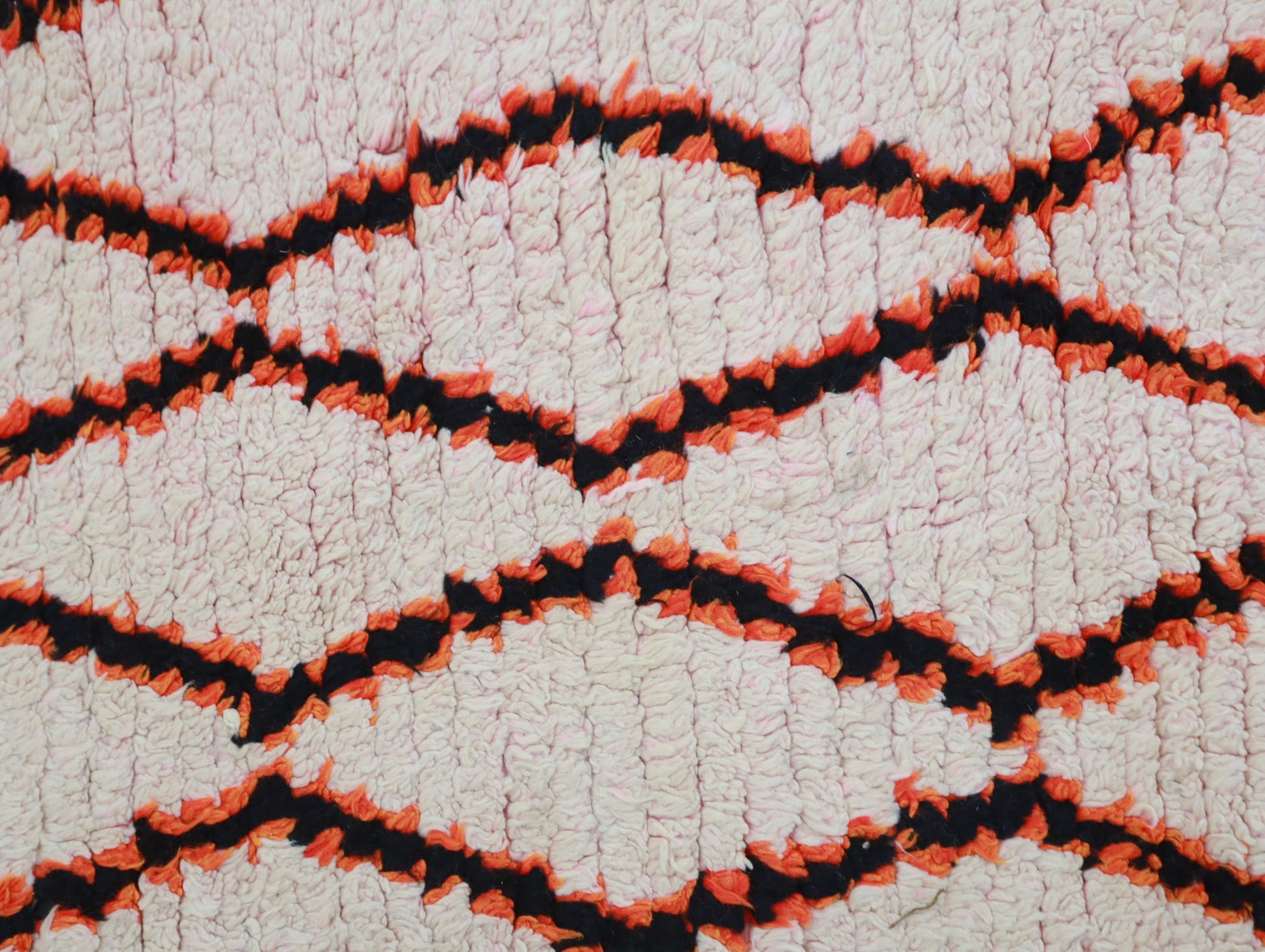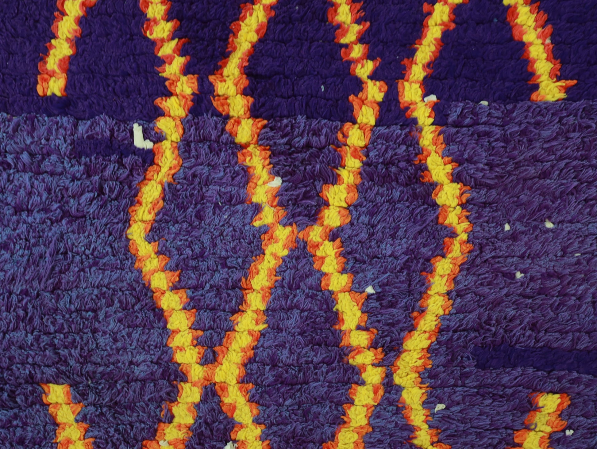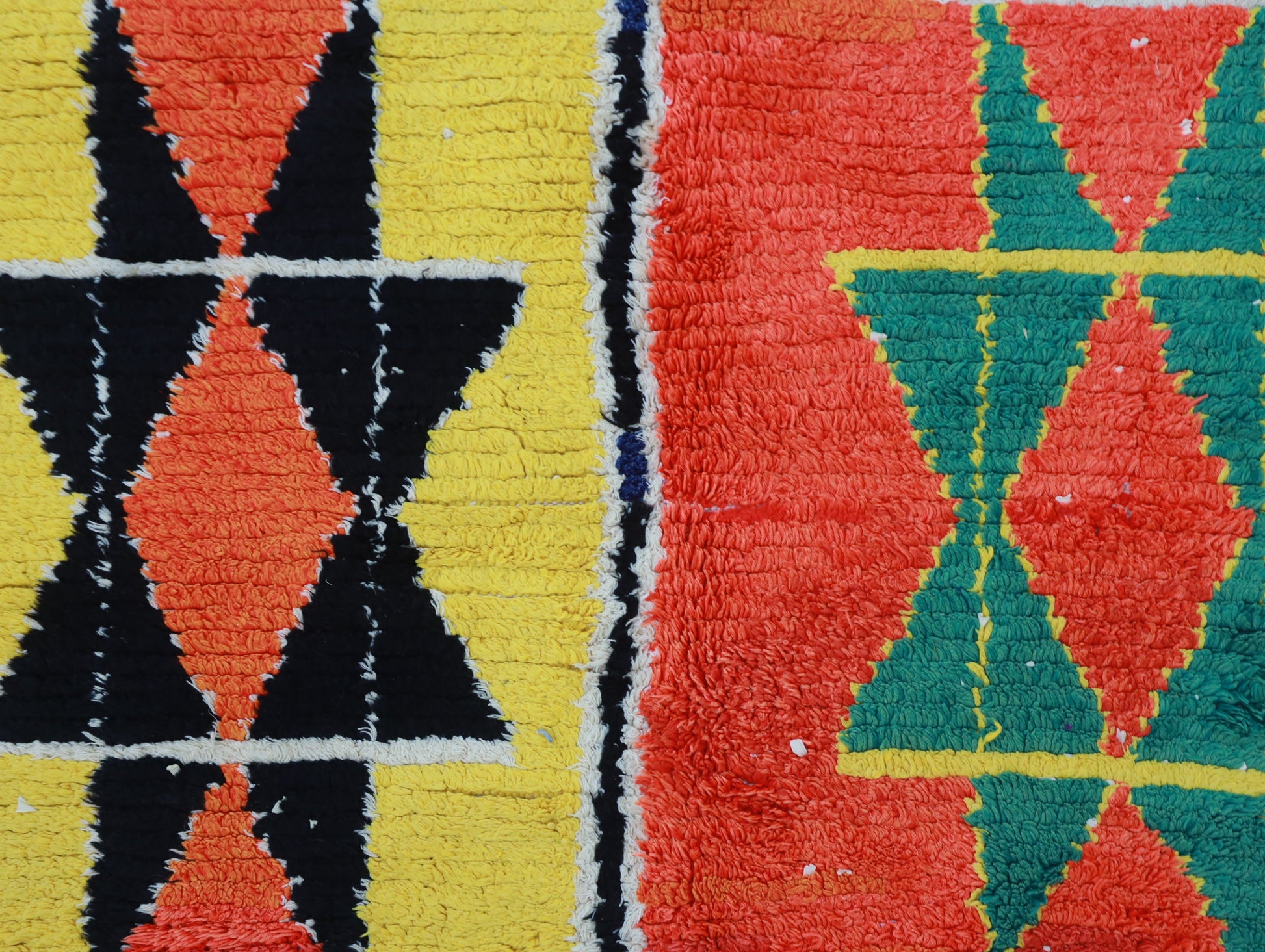 Azilal rugs boast abstract, painterly designs reminiscent of rugs from Ourika. What sets them apart is a vibrant color palette, achieved through the incorporation of cotton alongside wool..