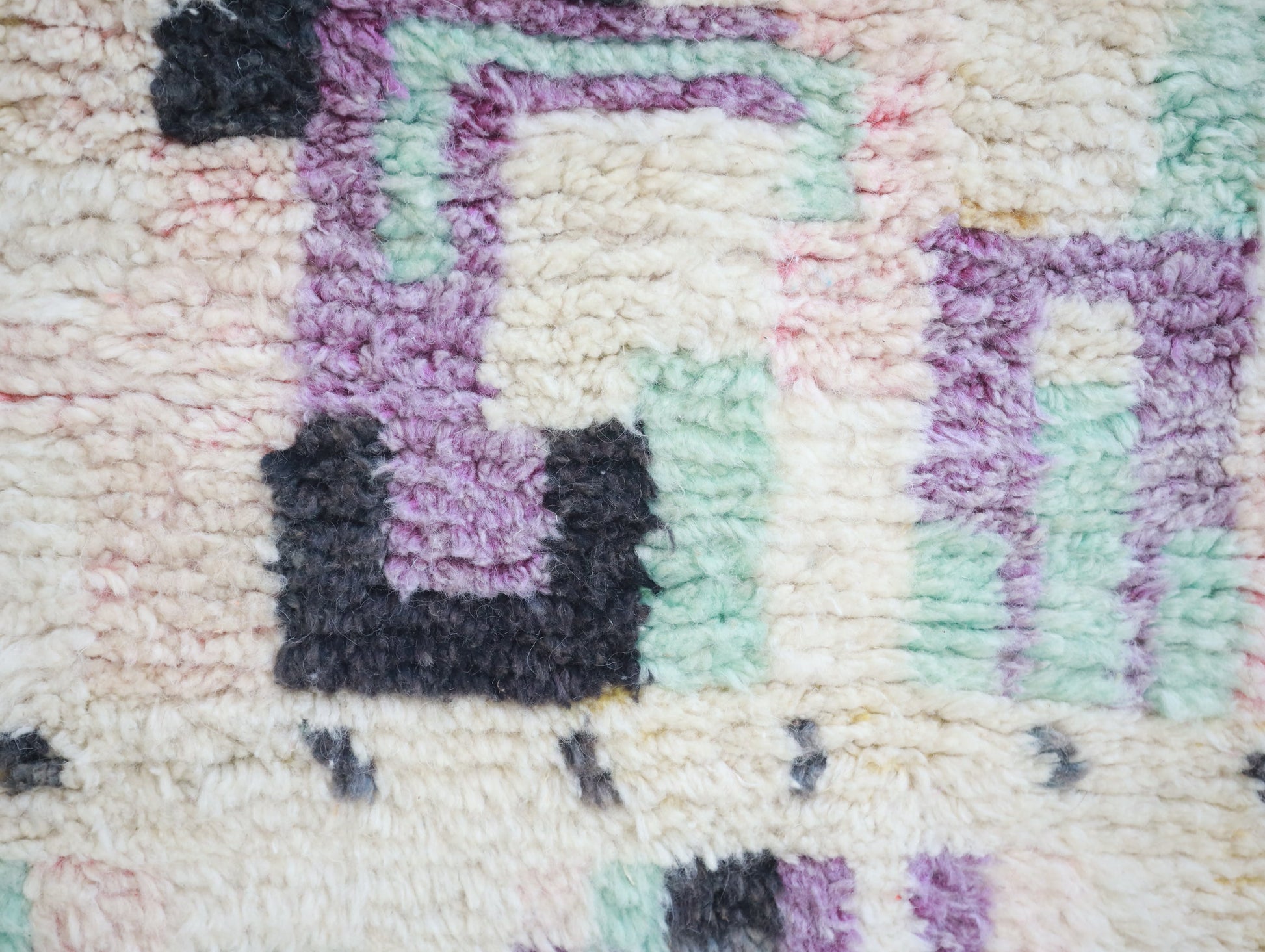 Wool, a sacred material for the Amazigh (Berber) people, forms the cornerstone of Moroccan rug design. Durable, long-lasting, and soft underfoot, wool is both functional and comfortable. In this piece, the wool pile is expertly knotted onto a wool foundation, adding substance and allowing it to gracefully embrace the floor.