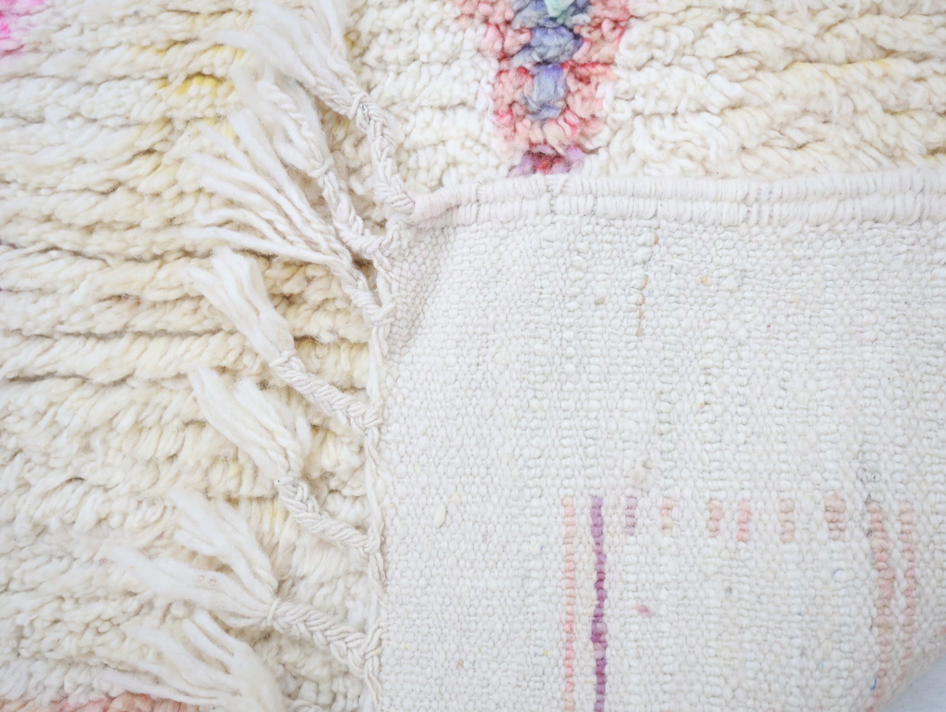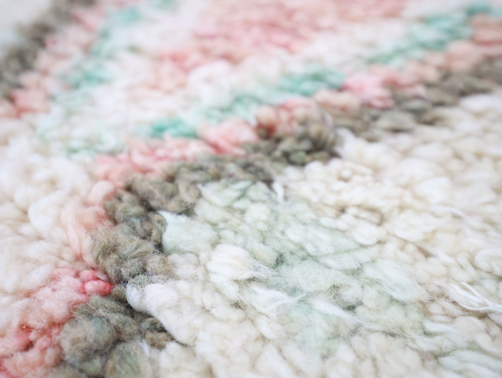 Wool, a sacred material for the Amazigh (Berber) people, forms the cornerstone of Moroccan rug design. Durable, long-lasting, and soft underfoot, wool is both functional and comfortable. In this piece, the wool pile is expertly knotted onto a wool foundation, adding substance and allowing it to gracefully embrace the floor.