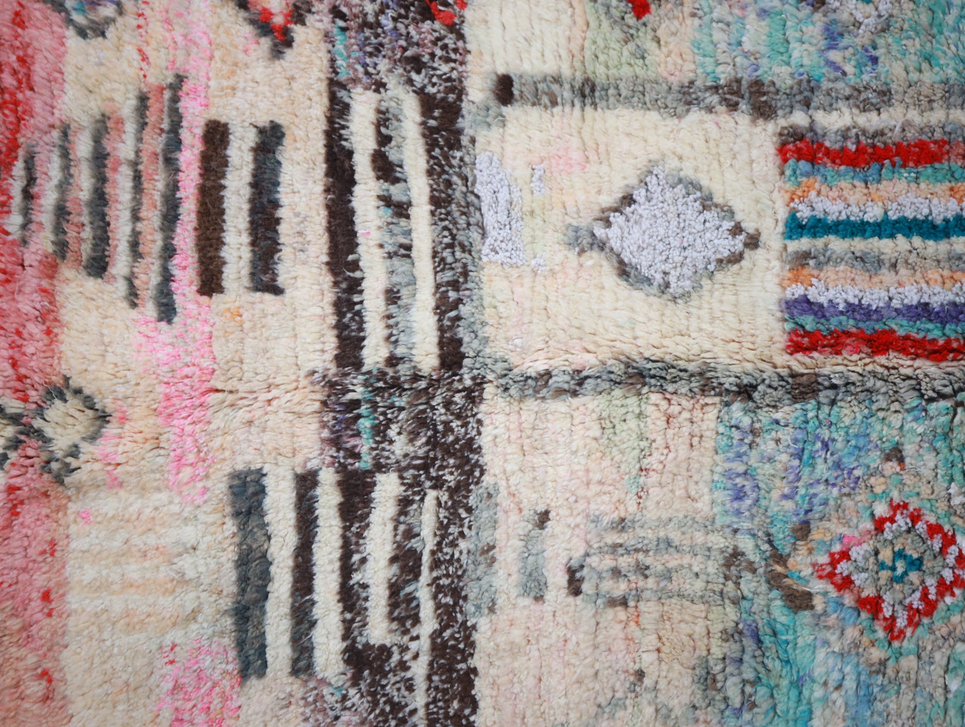 Originating in the Holy town of Boujad, these rugs, woven by diverse tribes, exhibit a wide spectrum of color, composition, and weave. Described as surreal, mystic, and mesmerizing, Boujad rugs transport us to a world beyond reality. Their construction, with twice as many horizontal as vertical knots, renders them floppy and easy to move.