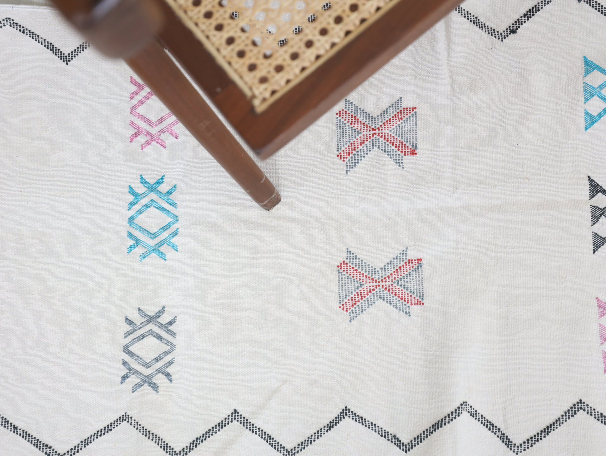Cactus silk rugs boast abstract, painterly designs reminiscent of rugs from Ourika. What sets them apart is a vibrant color palette, achieved through the incorporation of cotton alongside wool..