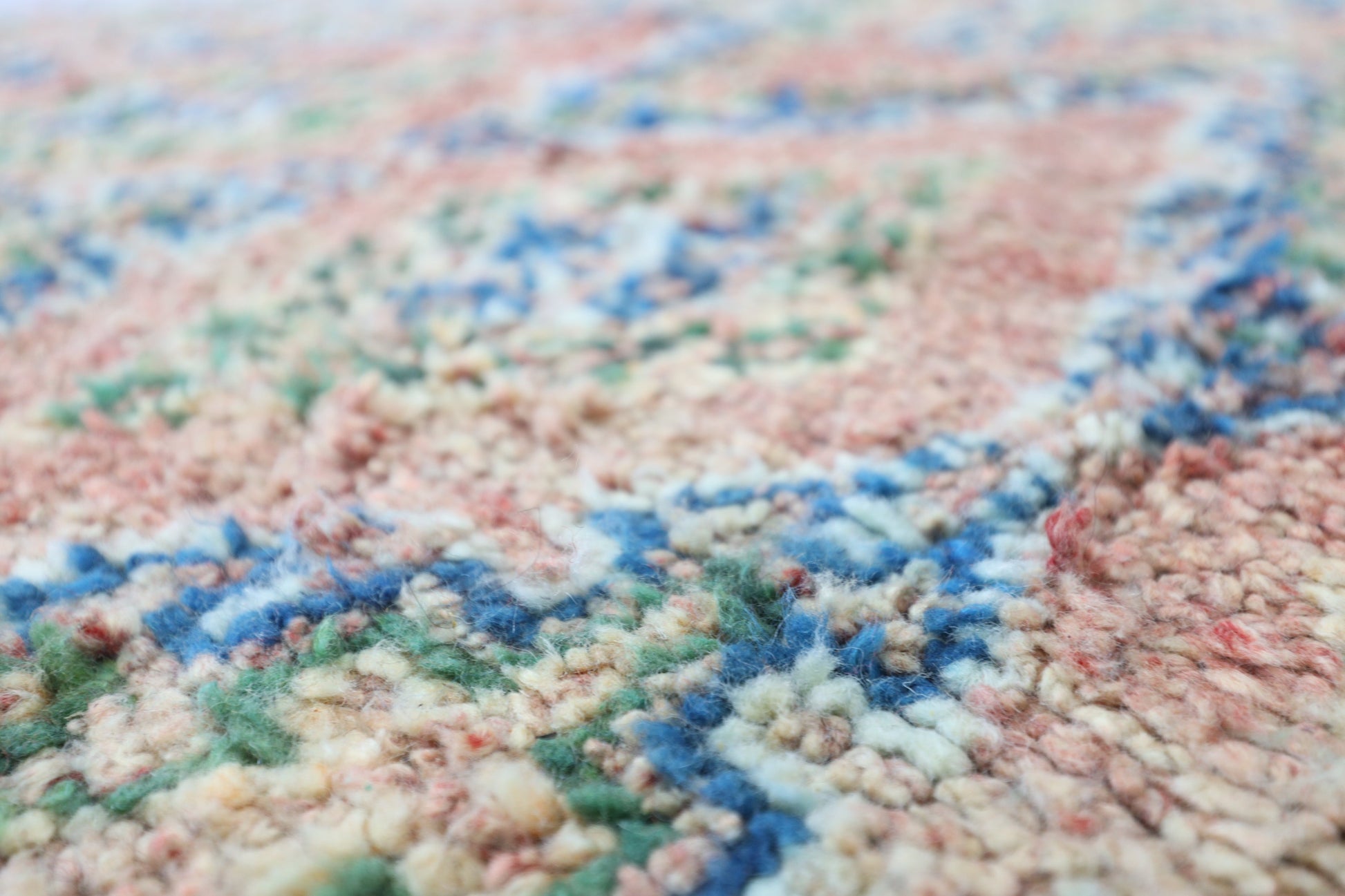 Originating in the Holy town of Boujad, these rugs, woven by diverse tribes, exhibit a wide spectrum of color, composition, and weave. Described as surreal, mystic, and mesmerizing, Boujad rugs transport us to a world beyond reality. Their construction, with twice as many horizontal as vertical knots, renders them floppy and easy to move.
