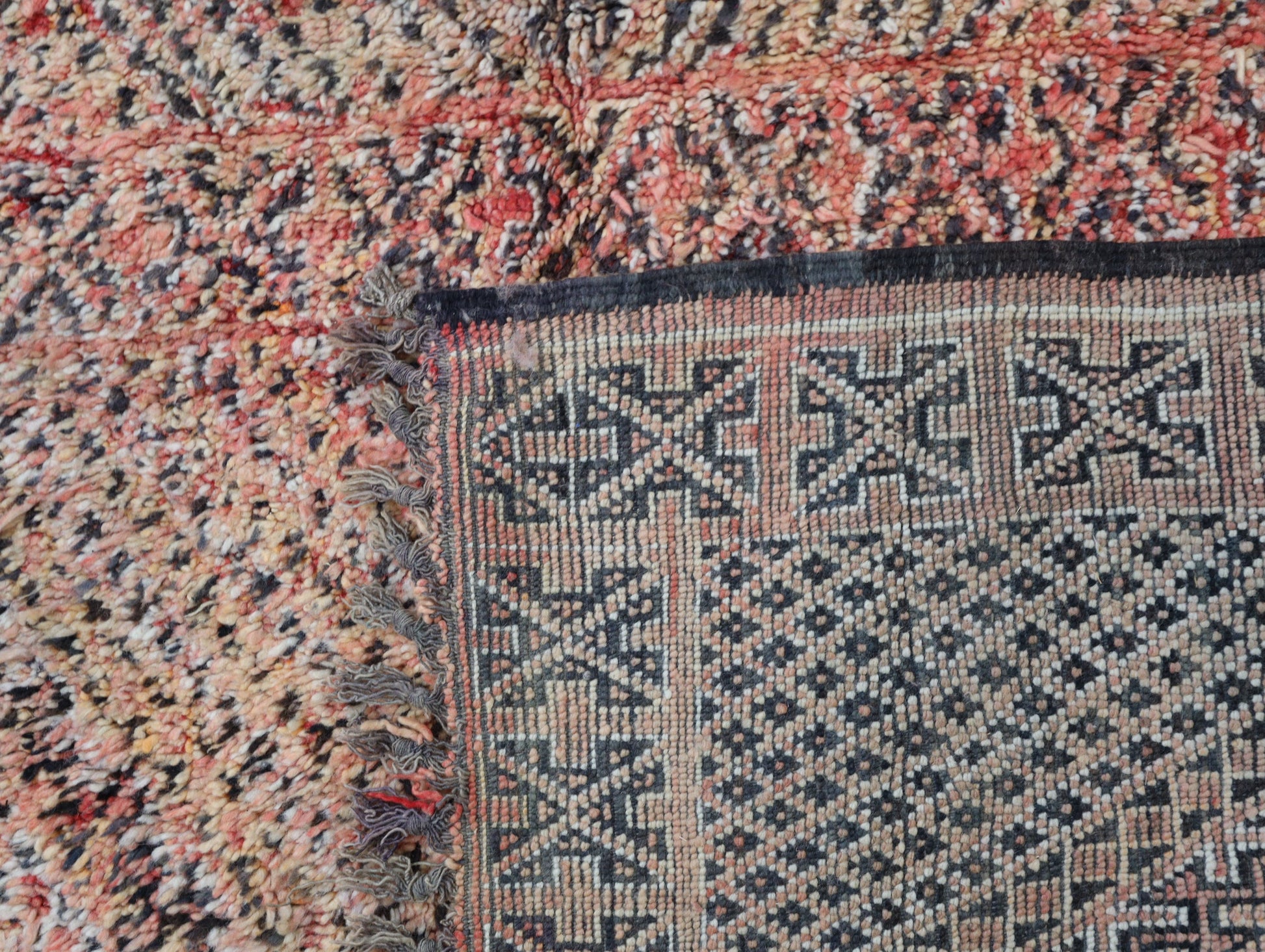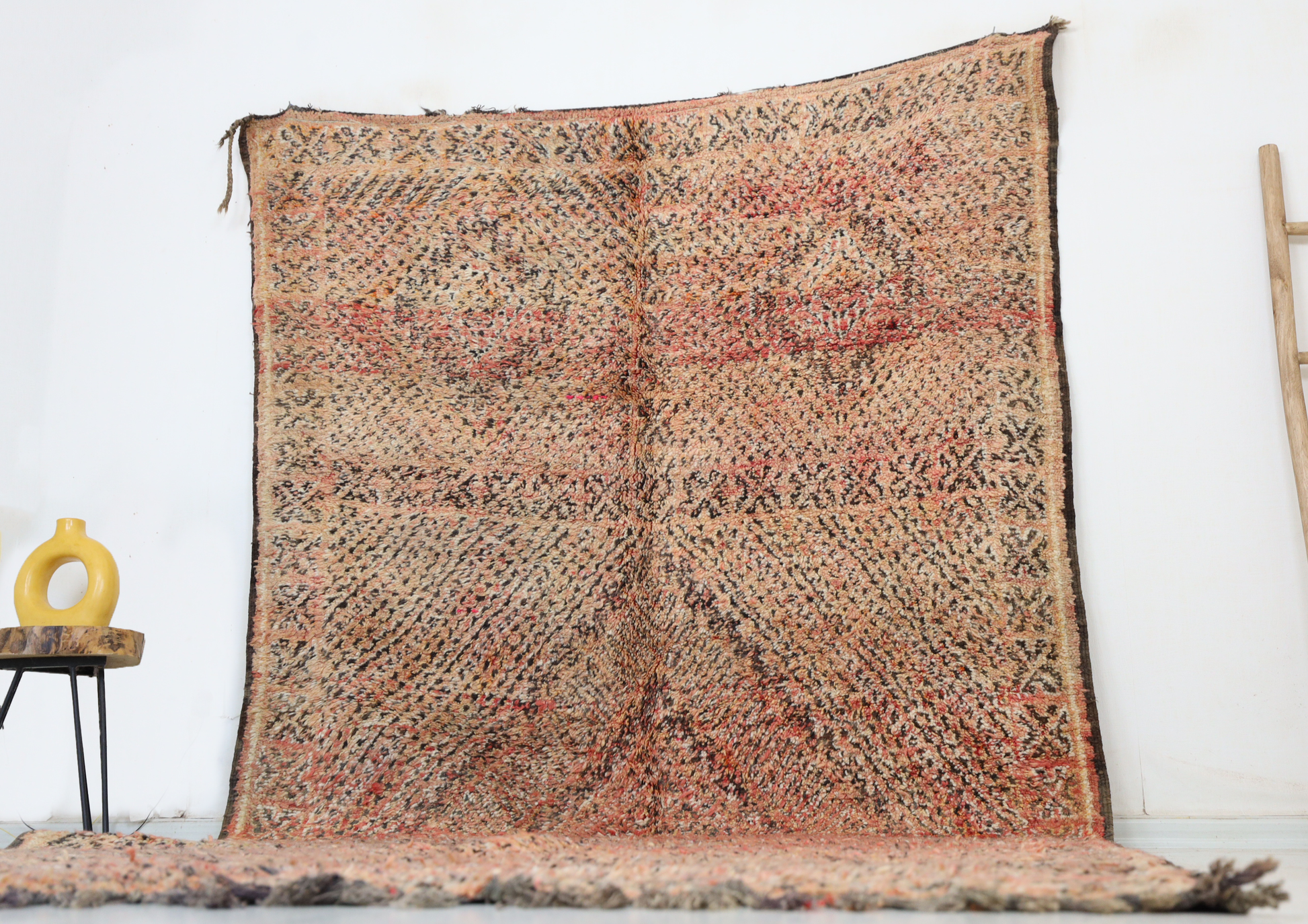 Wool, a sacred material for the Amazigh (Berber) people, forms the cornerstone of Moroccan rug design. Durable, long-lasting, and soft underfoot, wool is both functional and comfortable. In this piece, the wool pile is expertly knotted onto a wool foundation, adding substance and allowing it to gracefully embrace the floor.