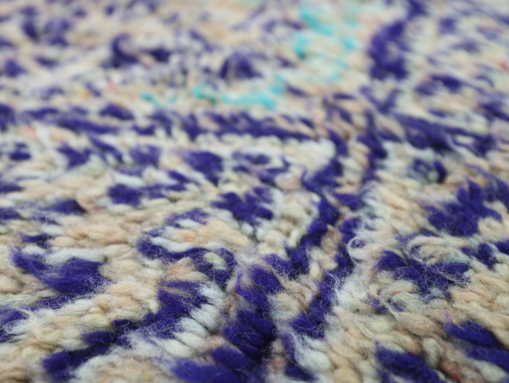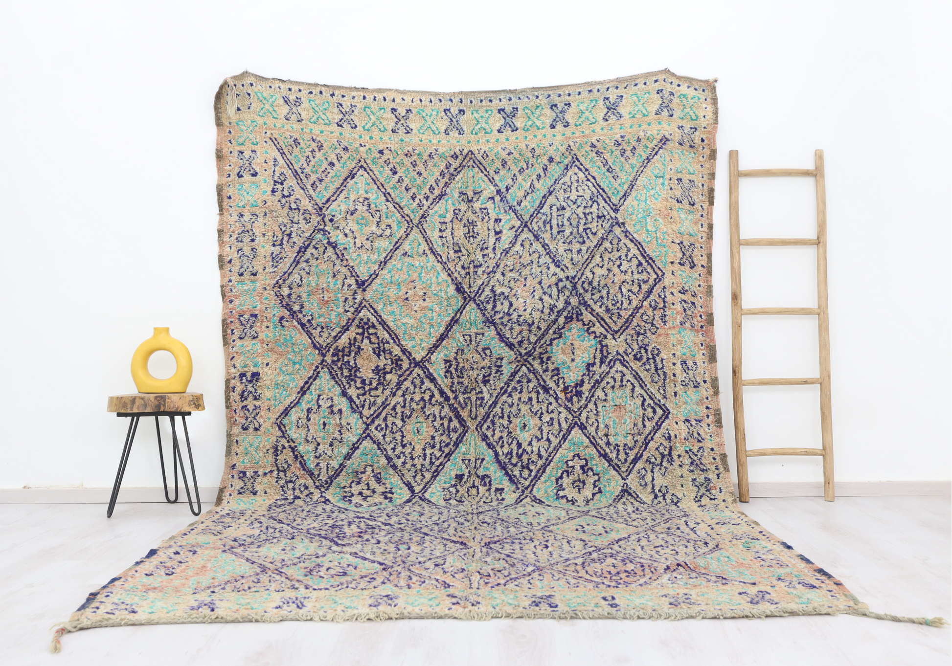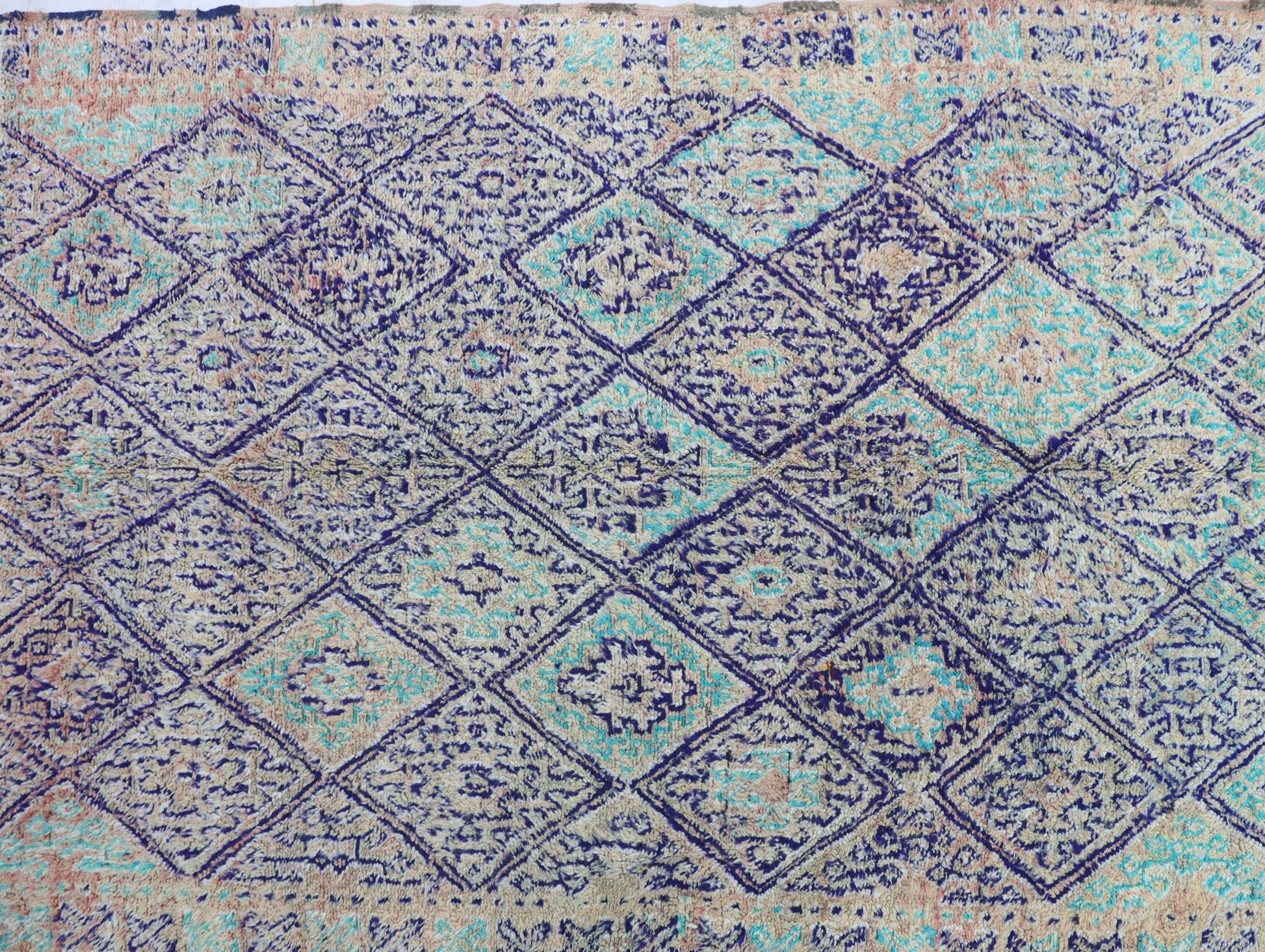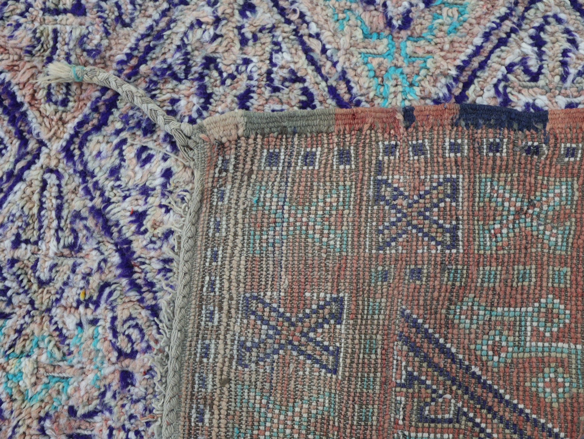 Originating in the Holy town of Boujad, these rugs, woven by diverse tribes, exhibit a wide spectrum of color, composition, and weave. Described as surreal, mystic, and mesmerizing, Boujad rugs transport us to a world beyond reality. Their construction, with twice as many horizontal as vertical knots, renders them floppy and easy to move.