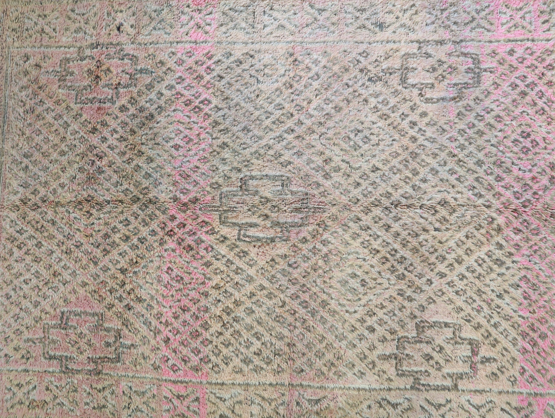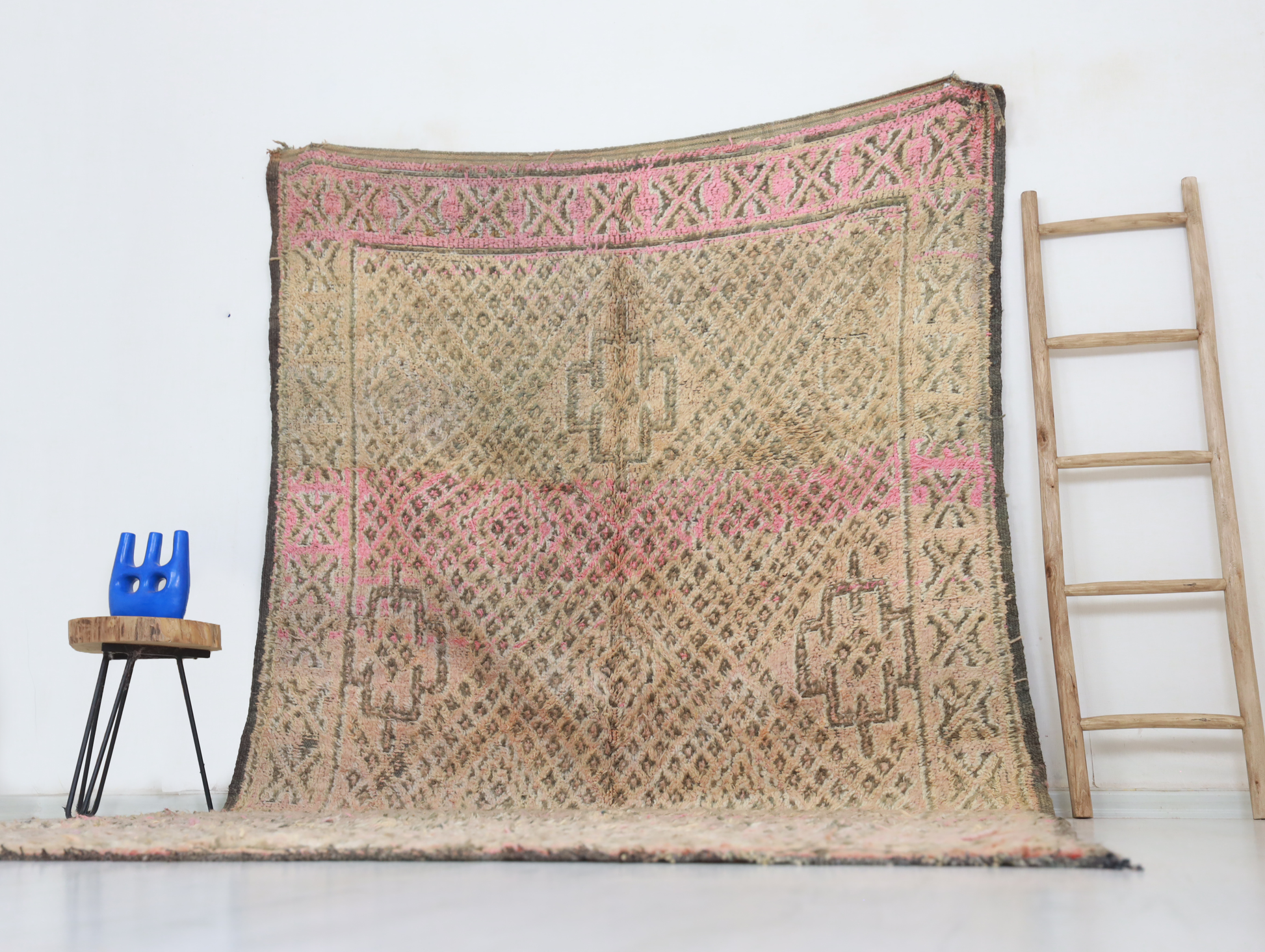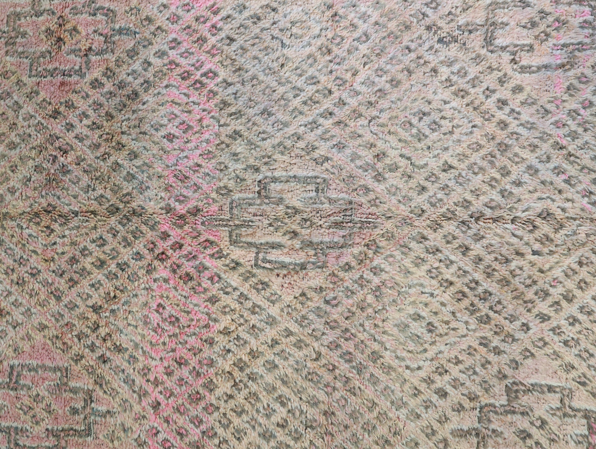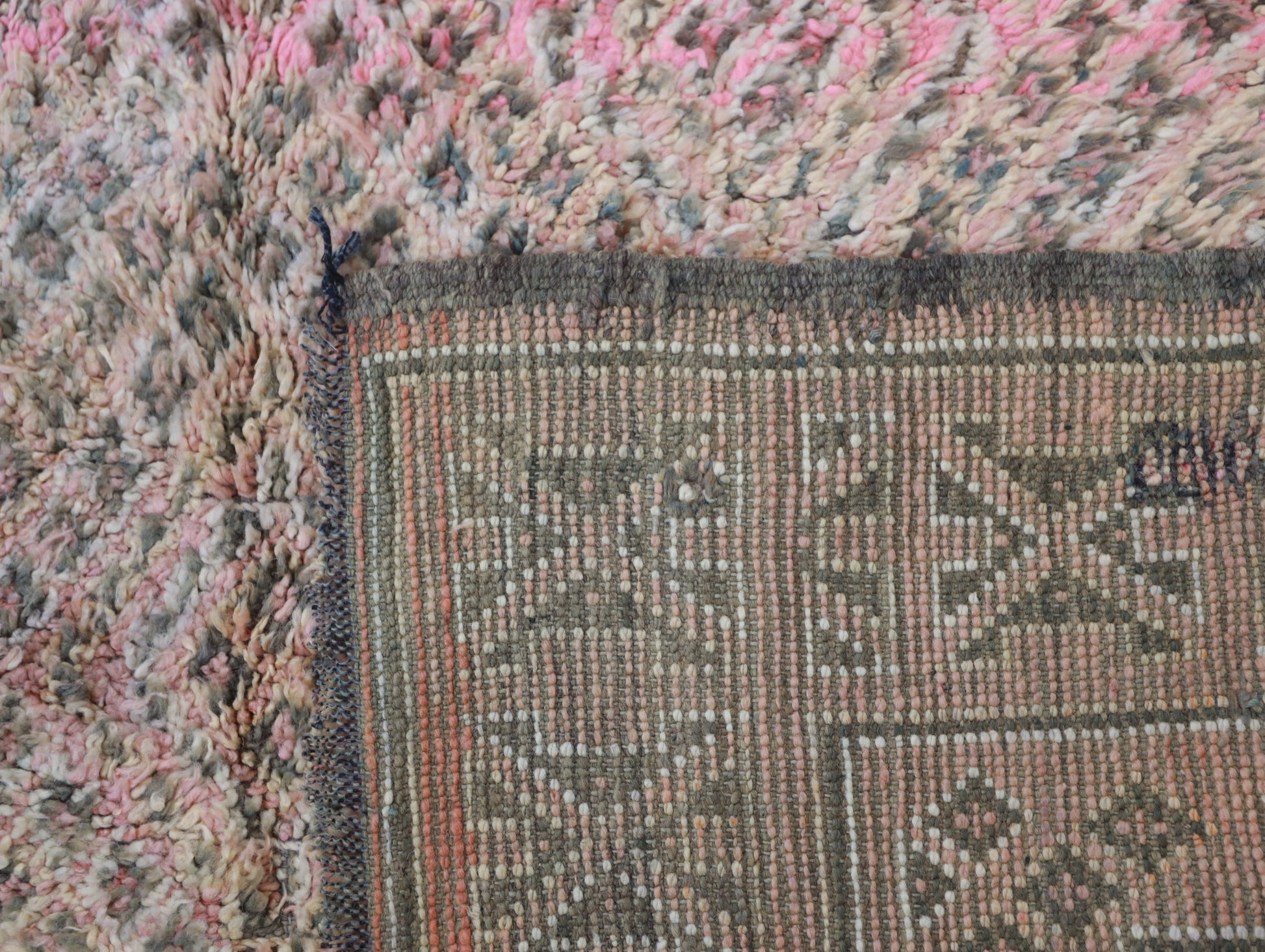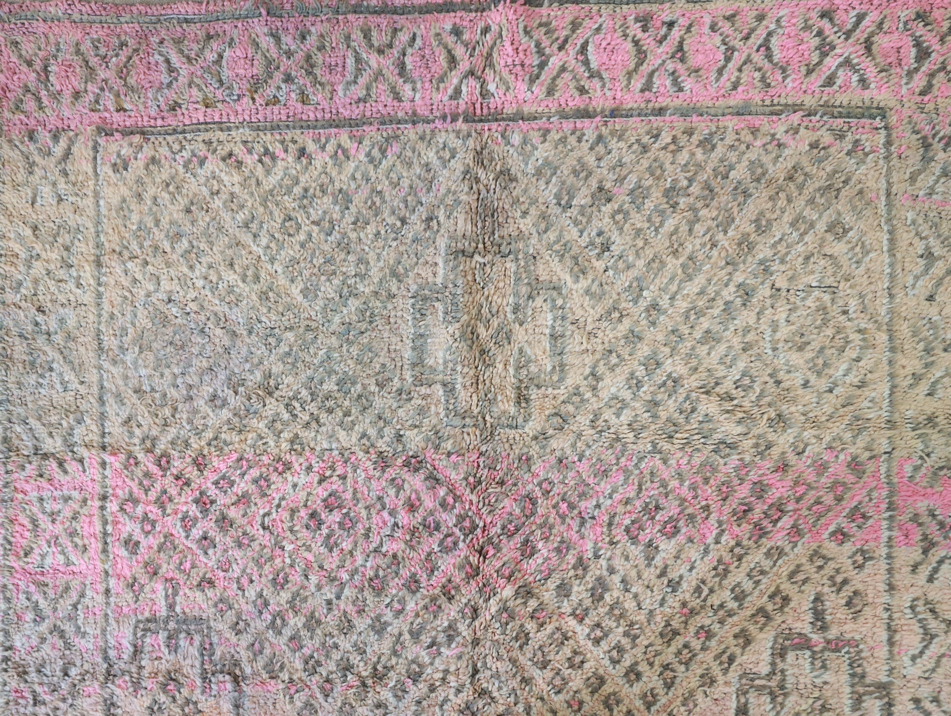 Wool, a sacred material for the Amazigh (Berber) people, forms the cornerstone of Moroccan rug design. Durable, long-lasting, and soft underfoot, wool is both functional and comfortable. In this piece, the wool pile is expertly knotted onto a wool foundation, adding substance and allowing it to gracefully embrace the floor.