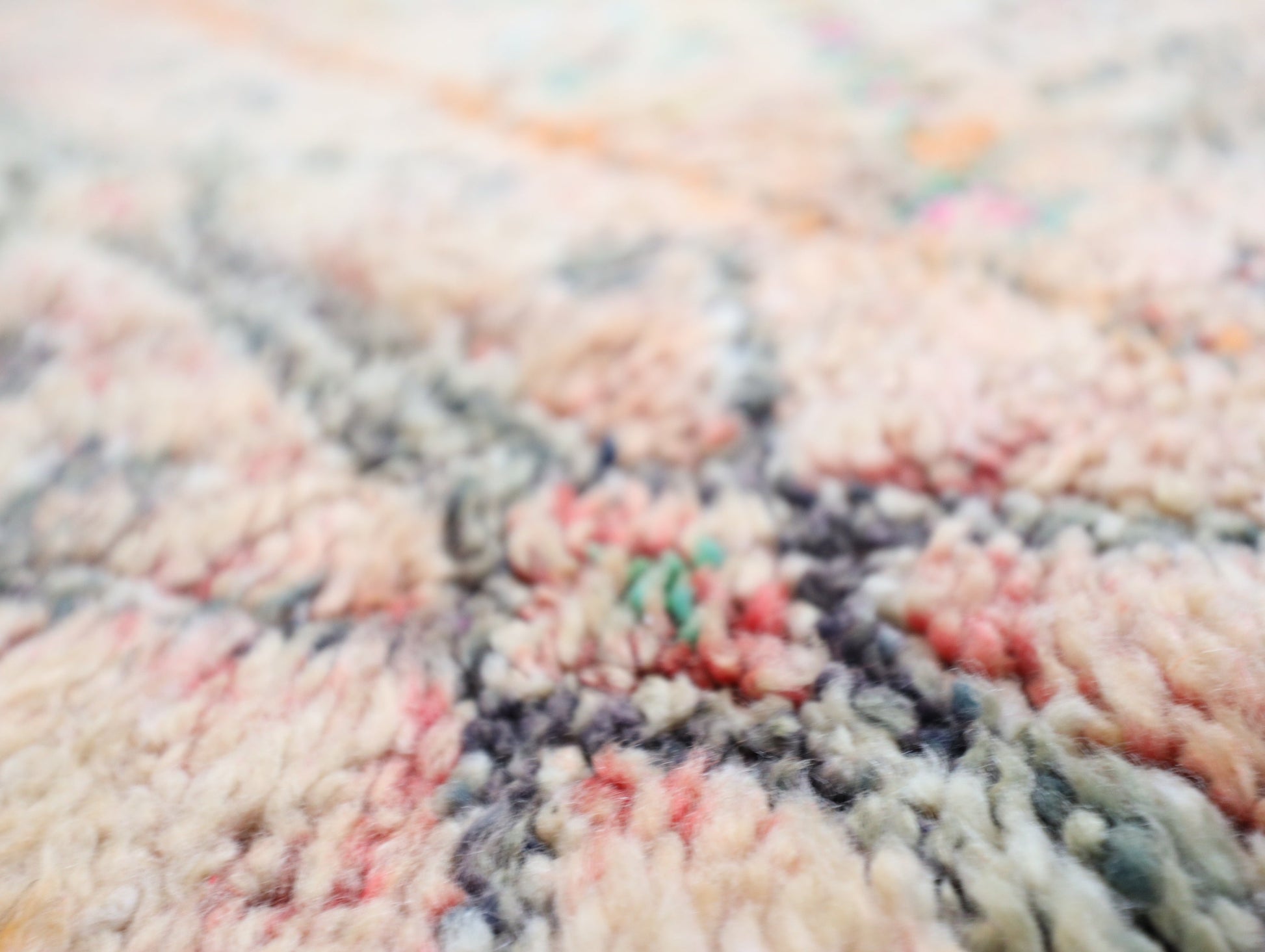 Originating in the Holy town of Boujad, these rugs, woven by diverse tribes, exhibit a wide spectrum of color, composition, and weave. Described as surreal, mystic, and mesmerizing, Boujad rugs transport us to a world beyond reality. Their construction, with twice as many horizontal as vertical knots, renders them floppy and easy to move.