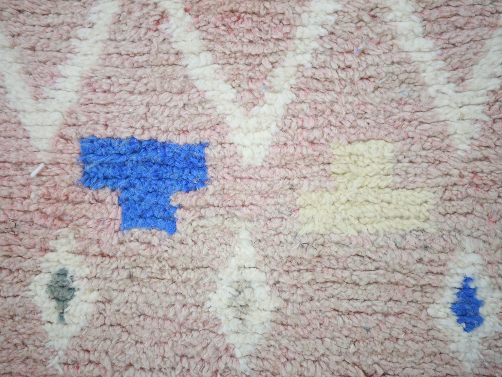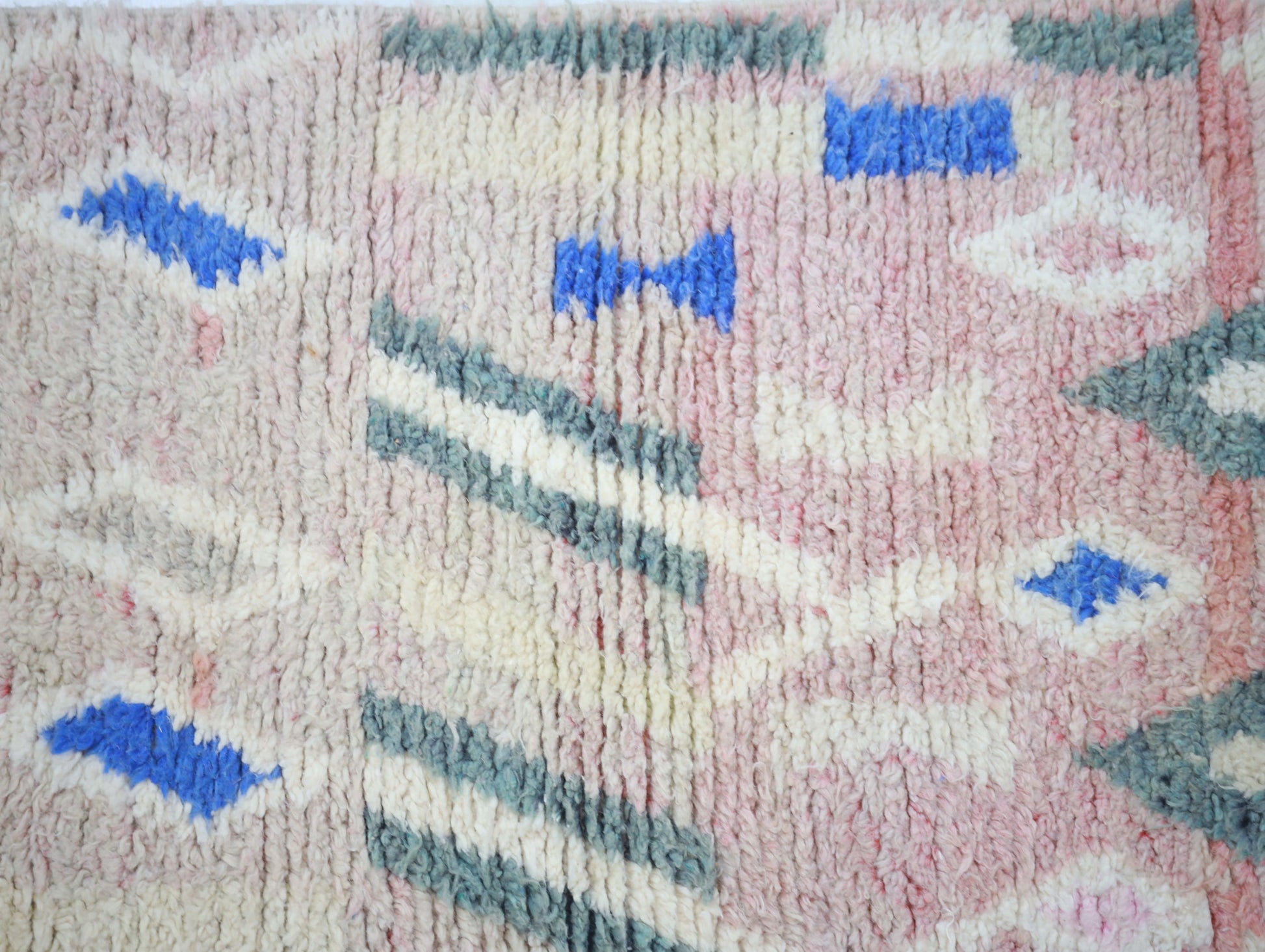 Wool, a sacred material for the Amazigh (Berber) people, forms the cornerstone of Moroccan rug design. Durable, long-lasting, and soft underfoot, wool is both functional and comfortable. In this piece, the wool pile is expertly knotted onto a wool foundation, adding substance and allowing it to gracefully embrace the floor.