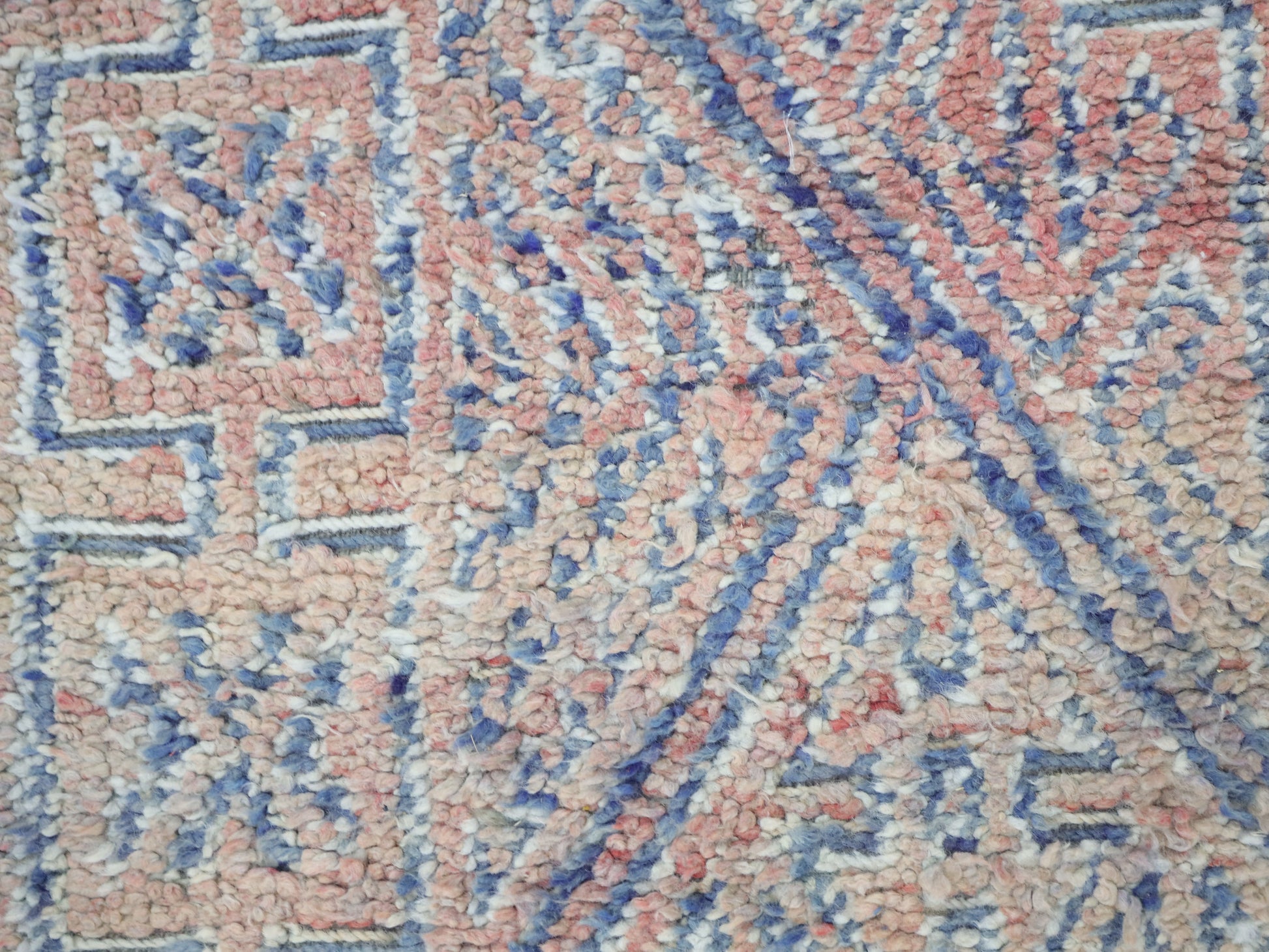 Originating in the Holy town of Boujad, these rugs, woven by diverse tribes, exhibit a wide spectrum of color, composition, and weave. Described as surreal, mystic, and mesmerizing, Boujad rugs transport us to a world beyond reality. Their construction, with twice as many horizontal as vertical knots, renders them floppy and easy to move.