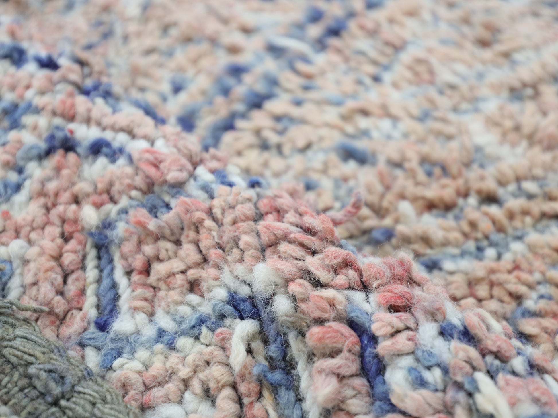 Wool, a sacred material for the Amazigh (Berber) people, forms the cornerstone of Moroccan rug design. Durable, long-lasting, and soft underfoot, wool is both functional and comfortable. In this piece, the wool pile is expertly knotted onto a wool foundation, adding substance and allowing it to gracefully embrace the floor.