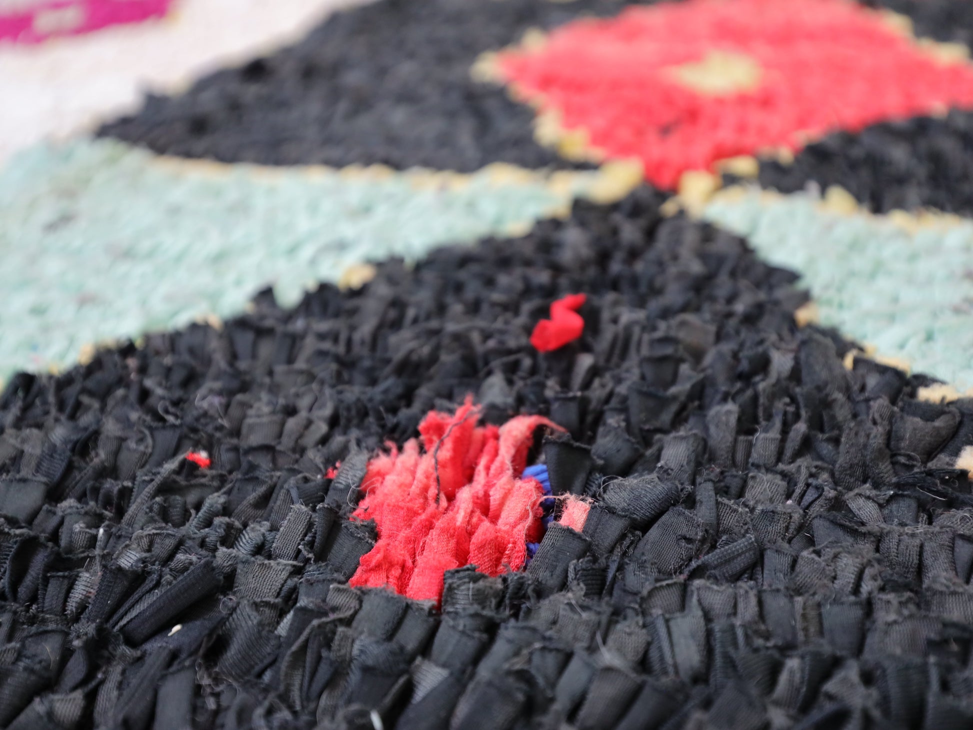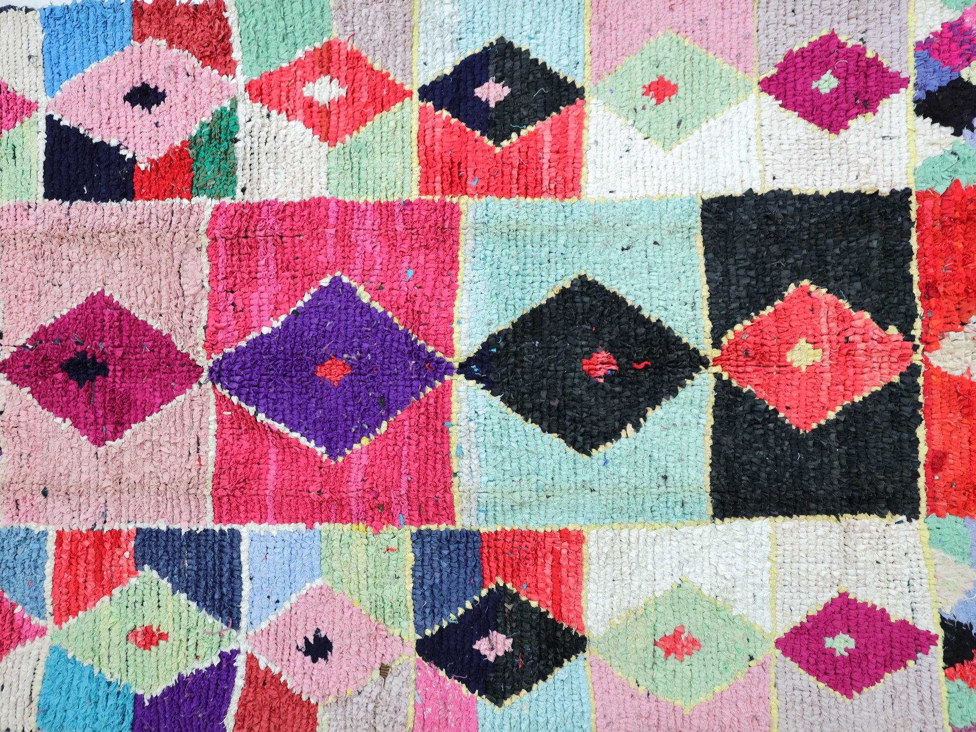 An unparalleled vintage masterpiece, carefully crafted by Berber Tribes in the Boucherouite style using upcycled textiles.