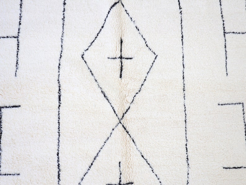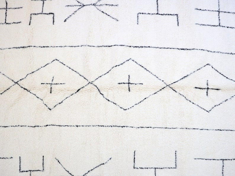 This unique rug, singular in its design, was intricately hand-knotted by the Beni Ourain tribes nestled in Morocco's Middle Atlas mountains.