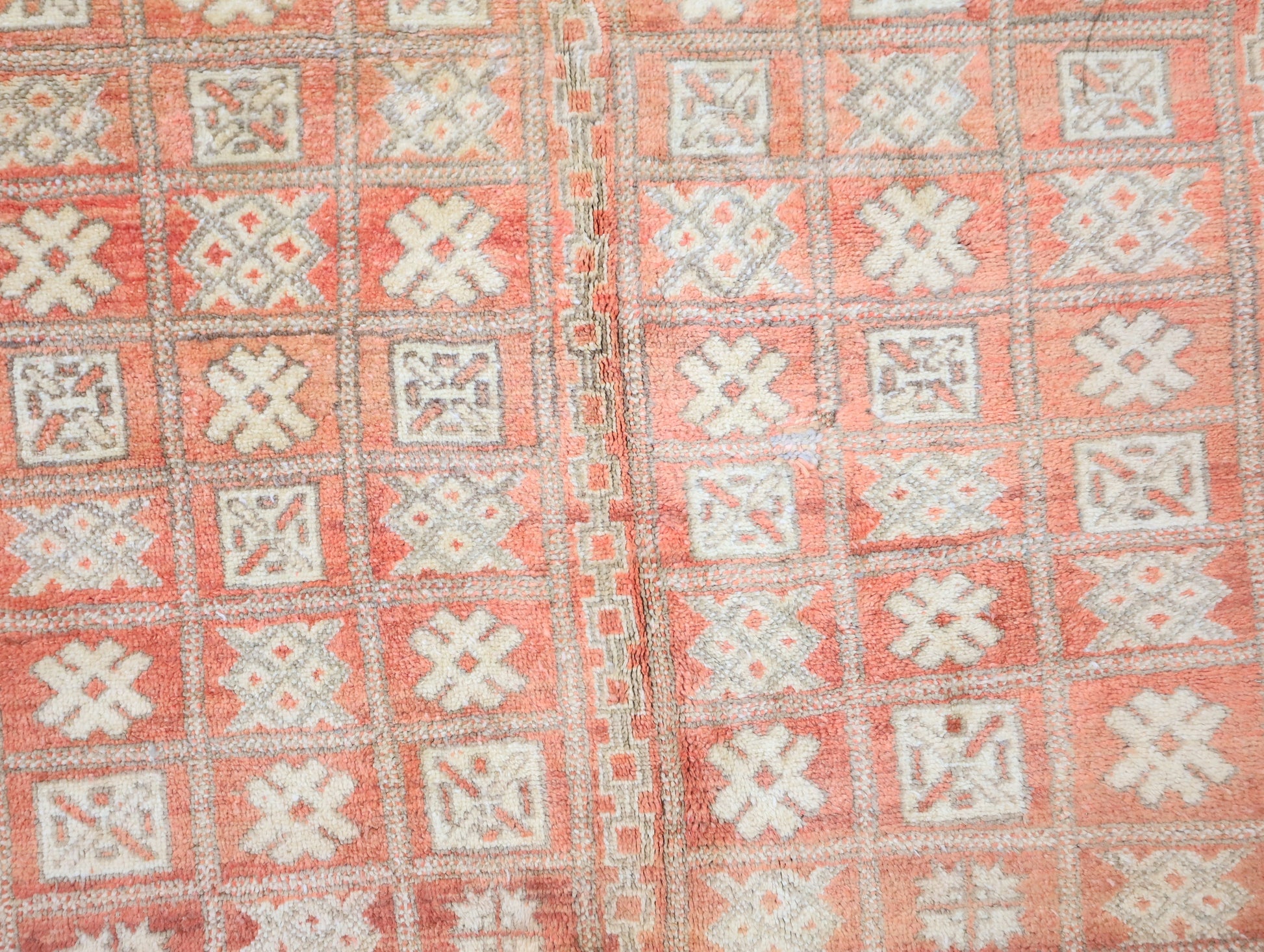 Originating in the Holy town of Boujad, these rugs, woven by diverse tribes, exhibit a wide spectrum of color, composition, and weave. Described as surreal, mystic, and mesmerizing, Boujad rugs transport us to a world beyond reality. Their construction, with twice as many horizontal as vertical knots, renders them floppy and easy to move.