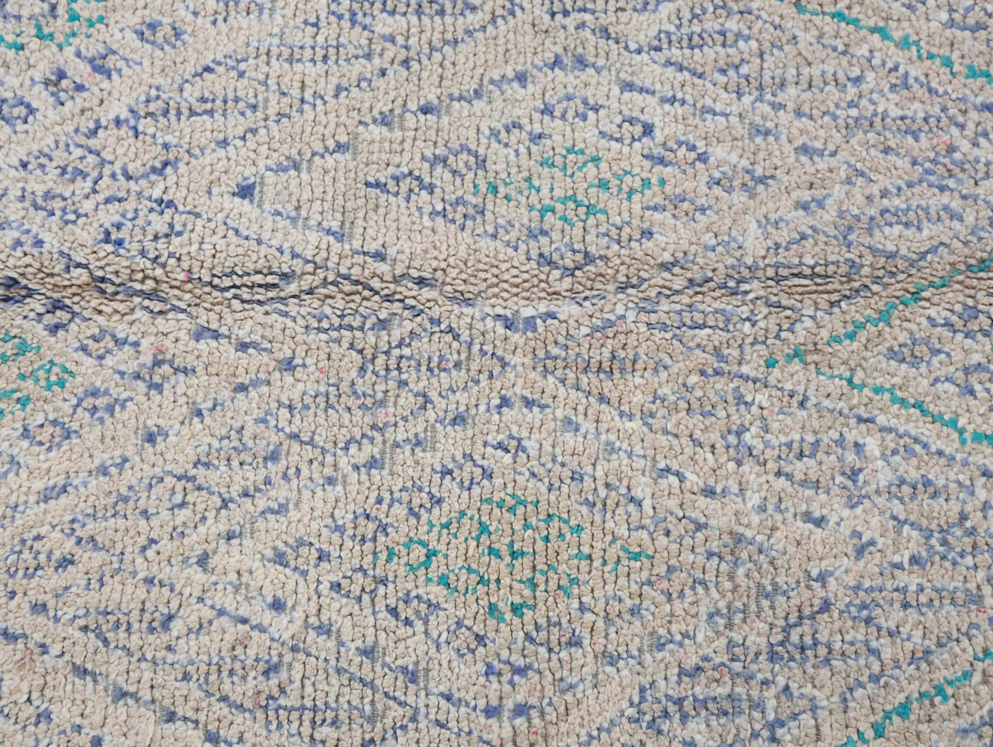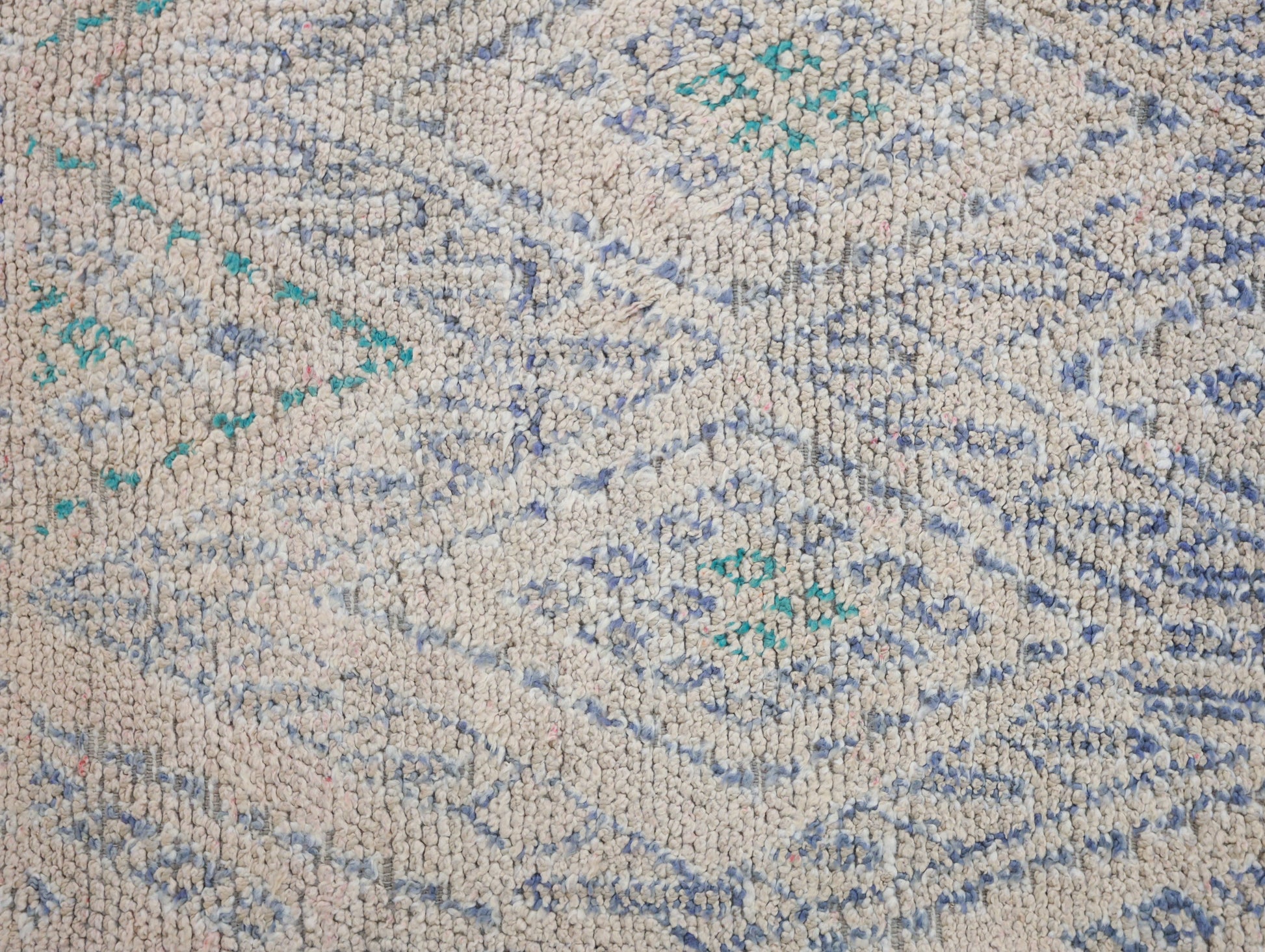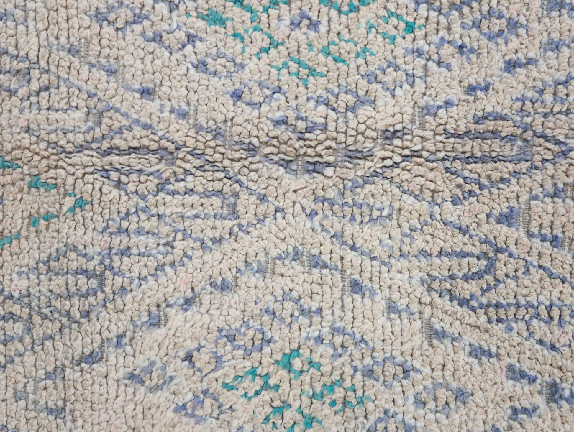 Wool, a sacred material for the Amazigh (Berber) people, forms the cornerstone of Moroccan rug design. Durable, long-lasting, and soft underfoot, wool is both functional and comfortable. In this piece, the wool pile is expertly knotted onto a wool foundation, adding substance and allowing it to gracefully embrace the floor.