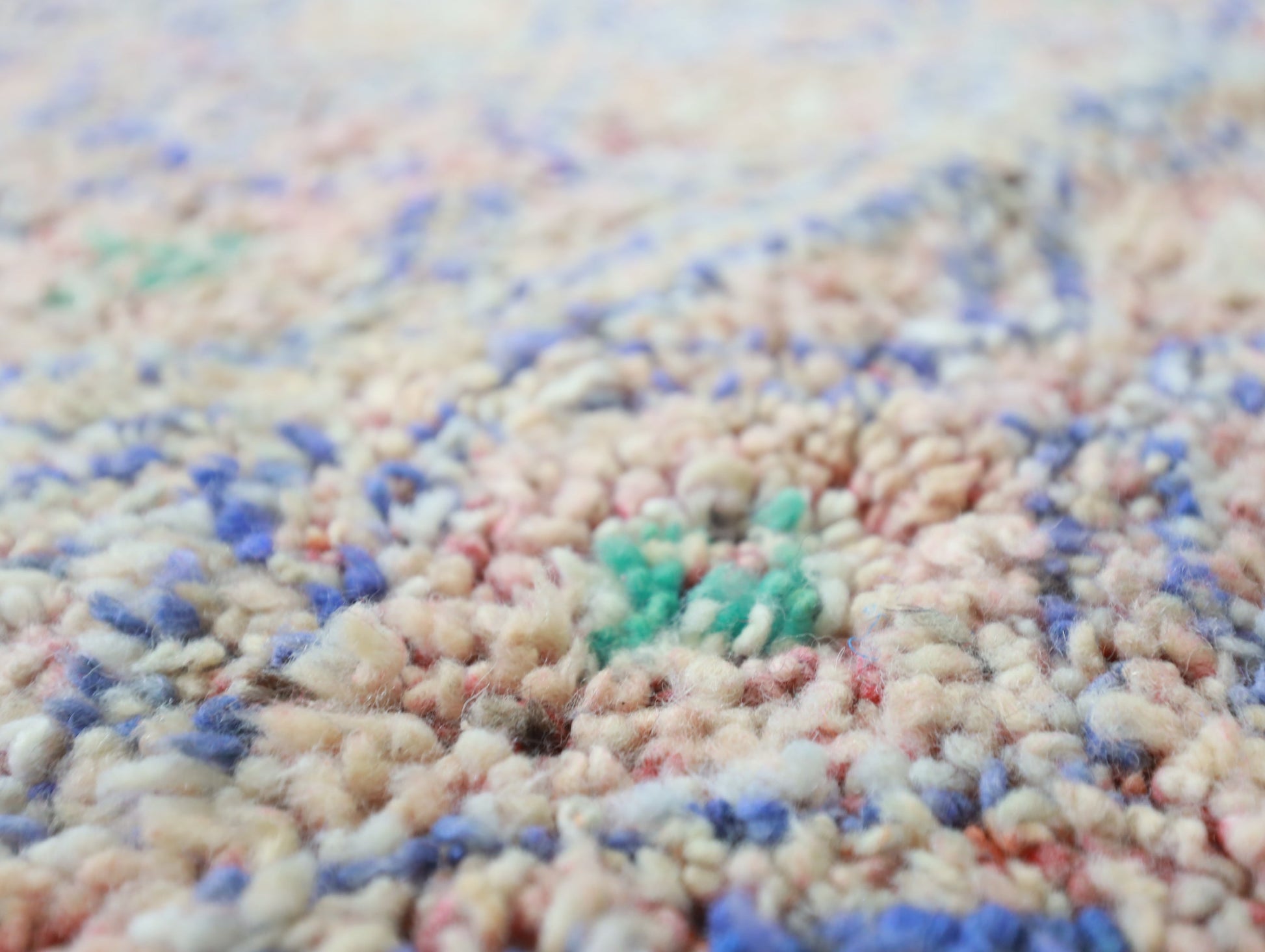 Wool, a sacred material for the Amazigh (Berber) people, forms the cornerstone of Moroccan rug design. Durable, long-lasting, and soft underfoot, wool is both functional and comfortable. In this piece, the wool pile is expertly knotted onto a wool foundation, adding substance and allowing it to gracefully embrace the floor.