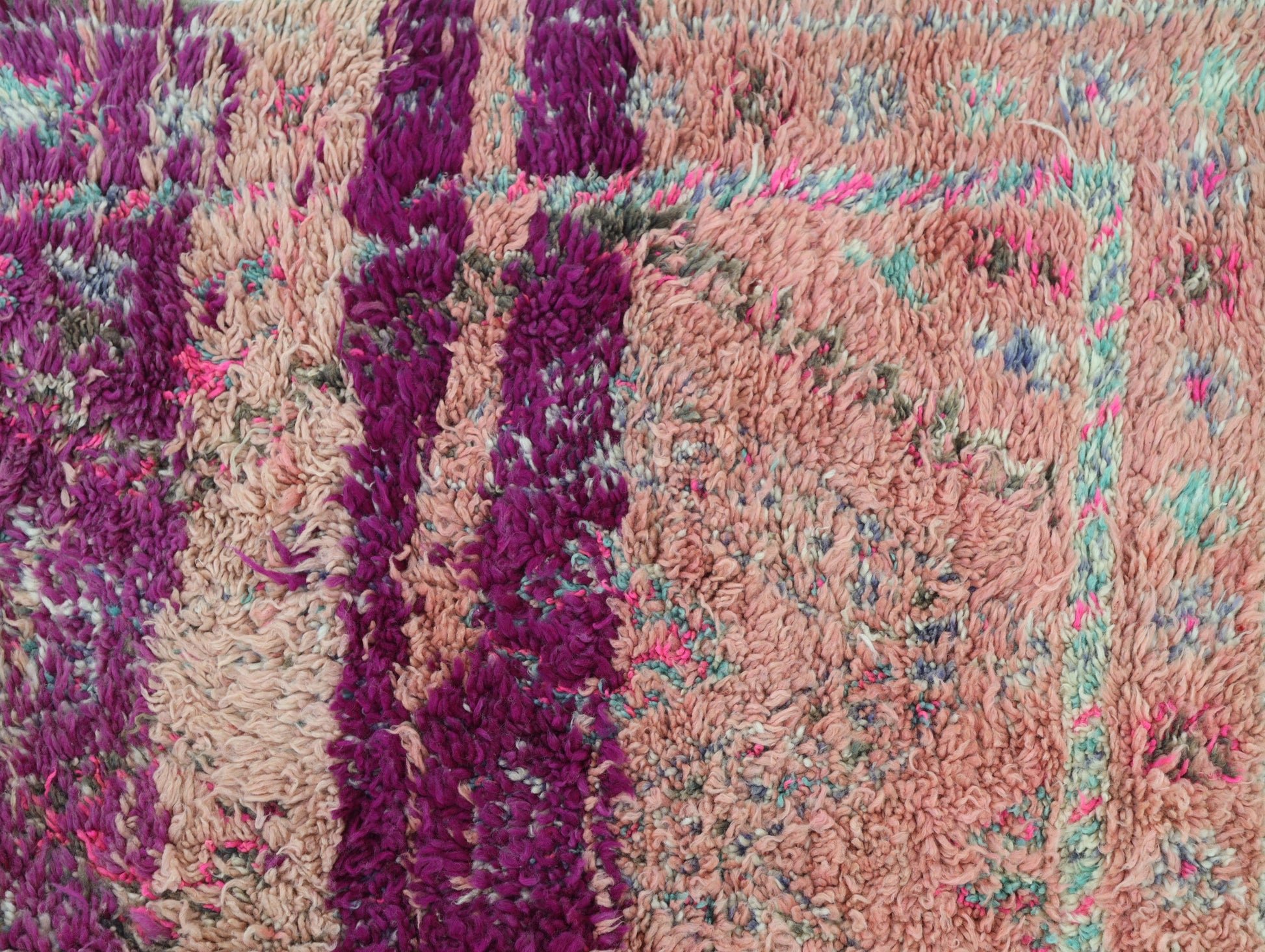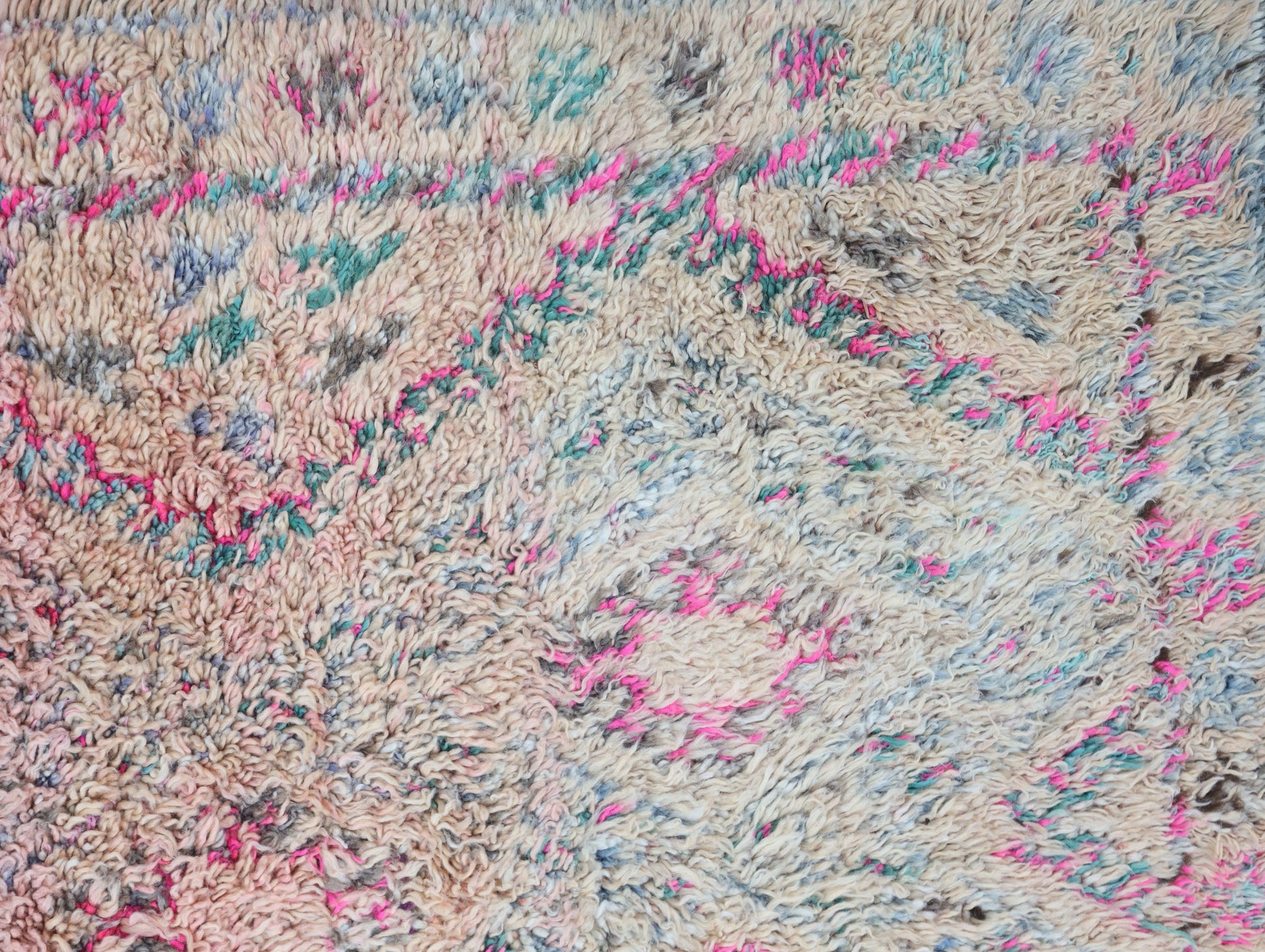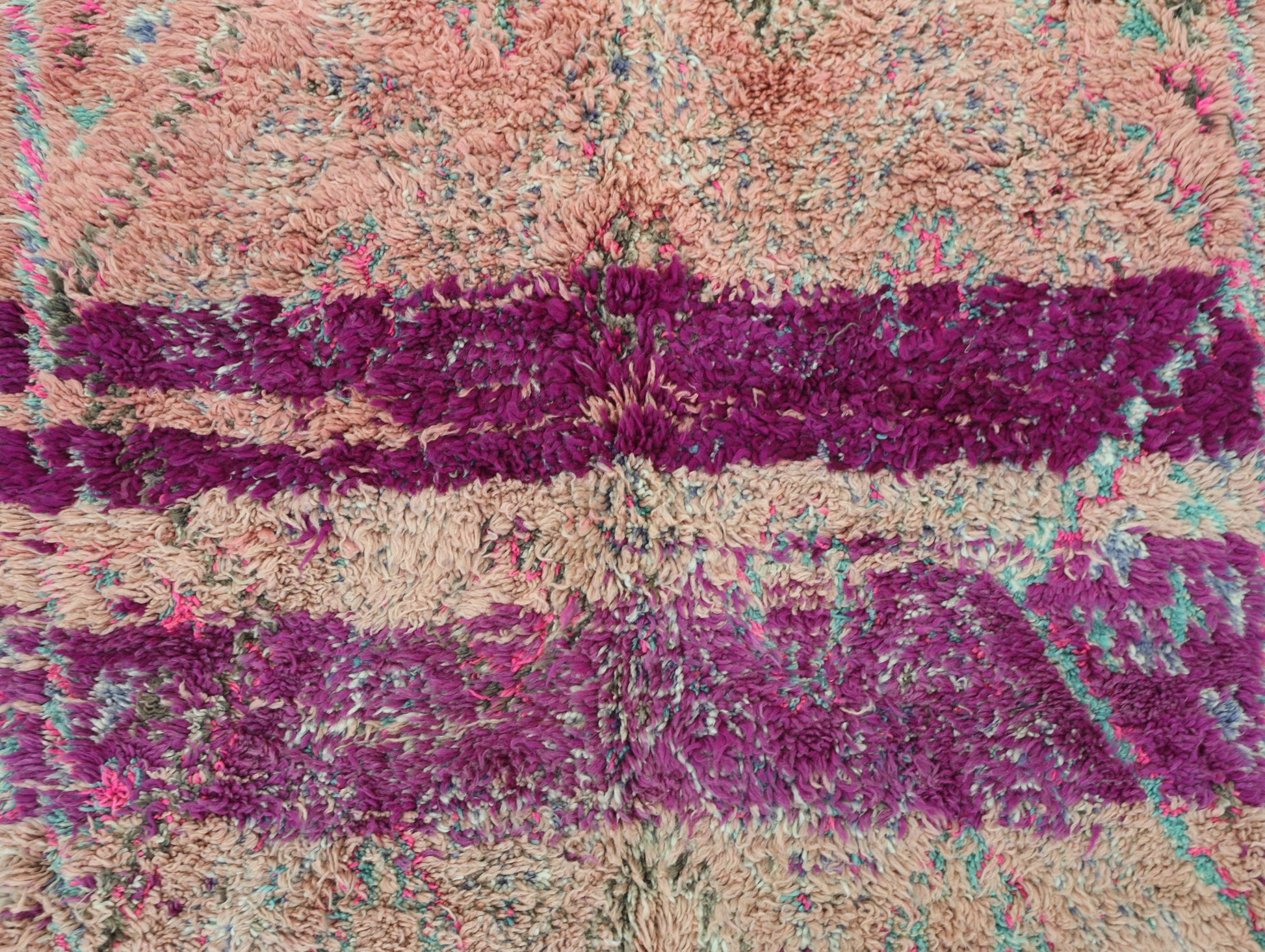 Originating in the Holy town of Boujad, these rugs, woven by diverse tribes, exhibit a wide spectrum of color, composition, and weave. Described as surreal, mystic, and mesmerizing, Boujad rugs transport us to a world beyond reality. Their construction, with twice as many horizontal as vertical knots, renders them floppy and easy to move.