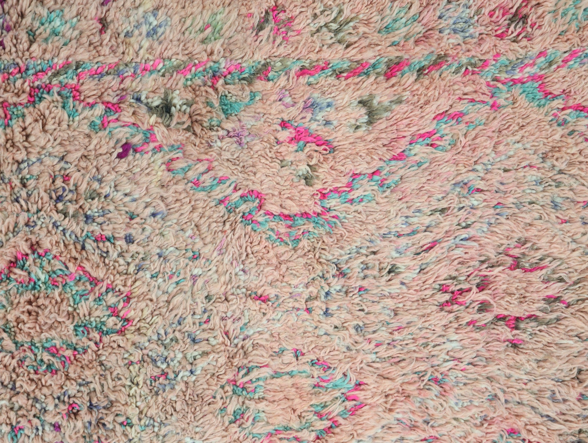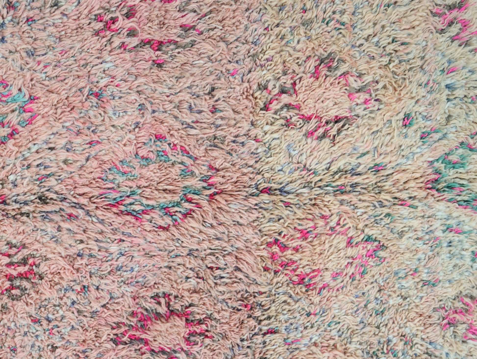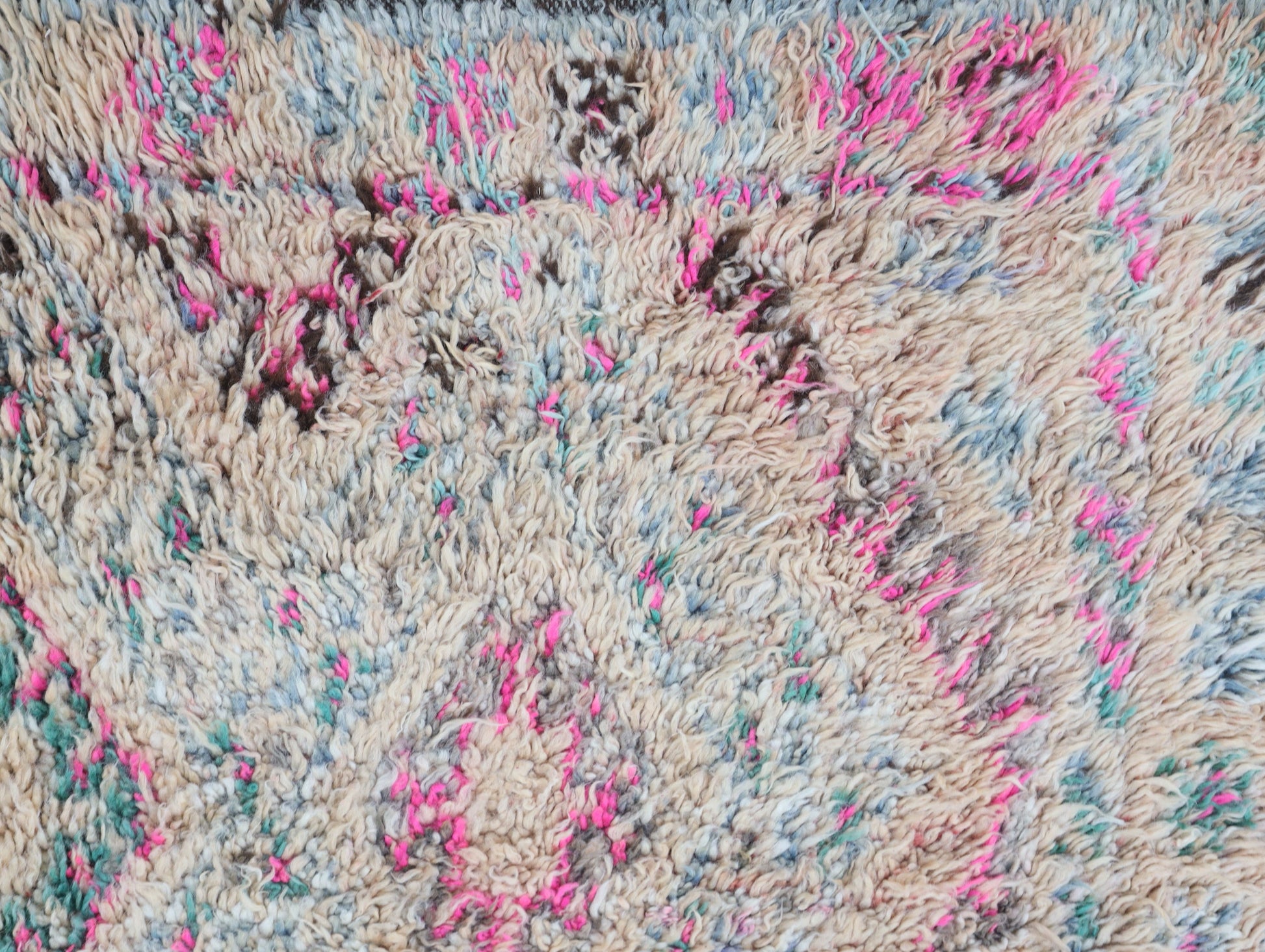 Originating in the Holy town of Boujad, these rugs, woven by diverse tribes, exhibit a wide spectrum of color, composition, and weave. Described as surreal, mystic, and mesmerizing, Boujad rugs transport us to a world beyond reality. Their construction, with twice as many horizontal as vertical knots, renders them floppy and easy to move.