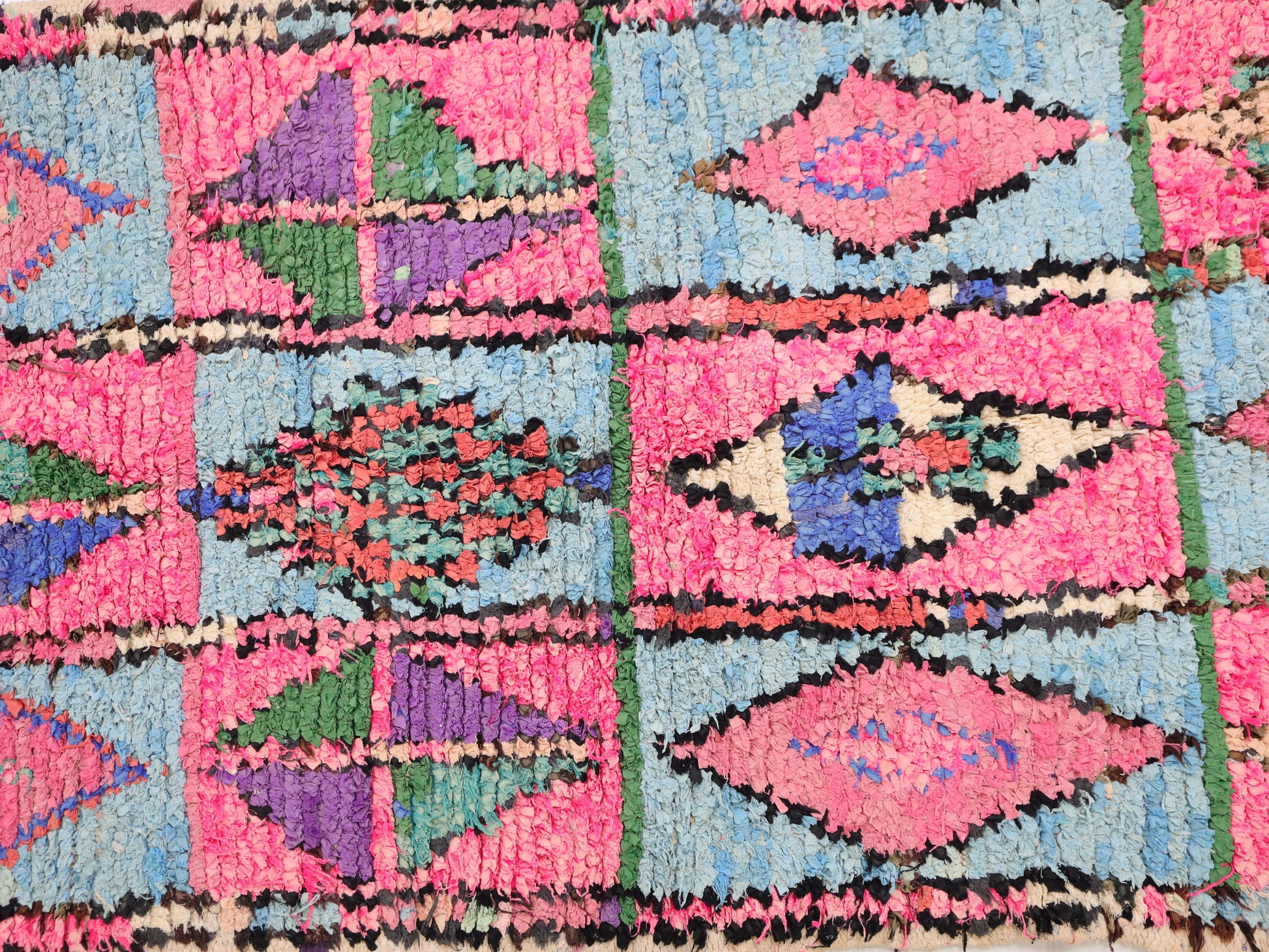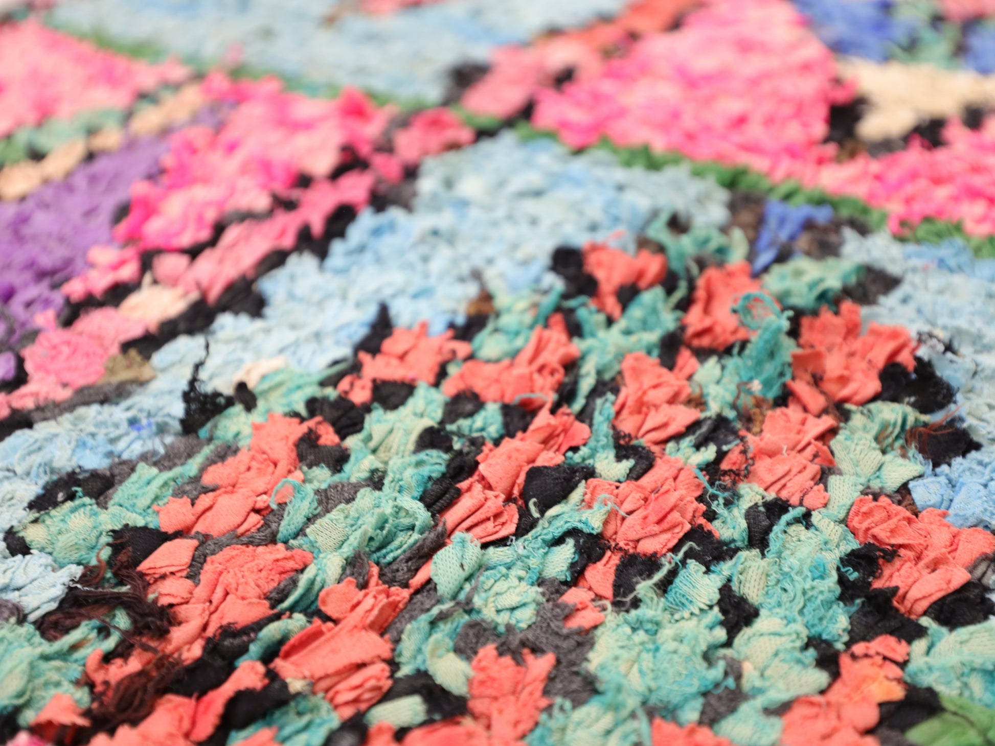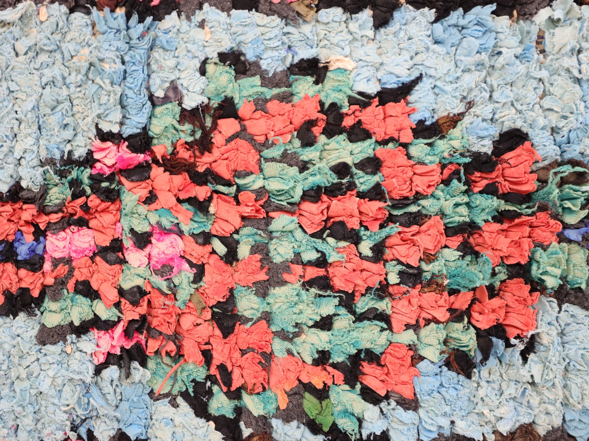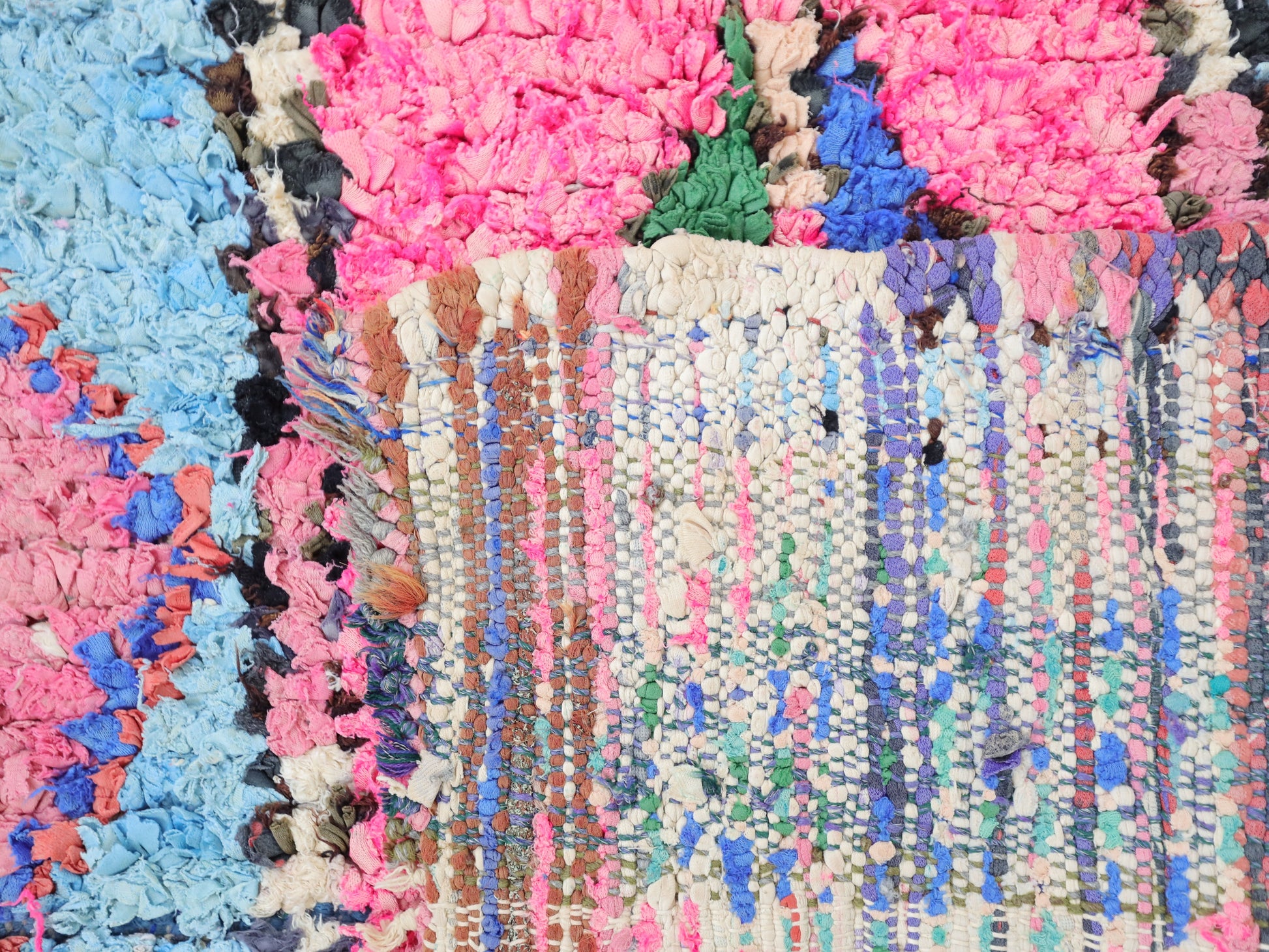 An unparalleled vintage masterpiece, carefully crafted by Berber Tribes in the Boucherouite style using upcycled textiles.