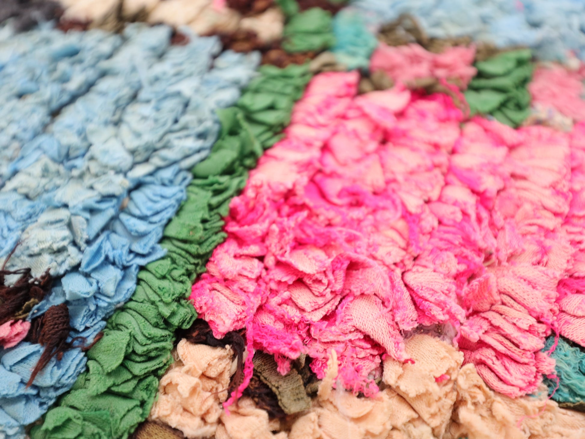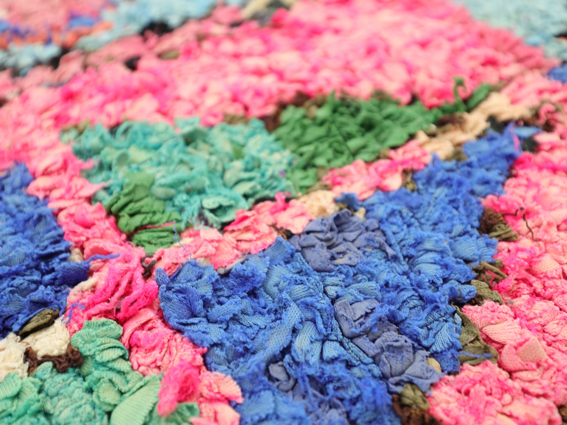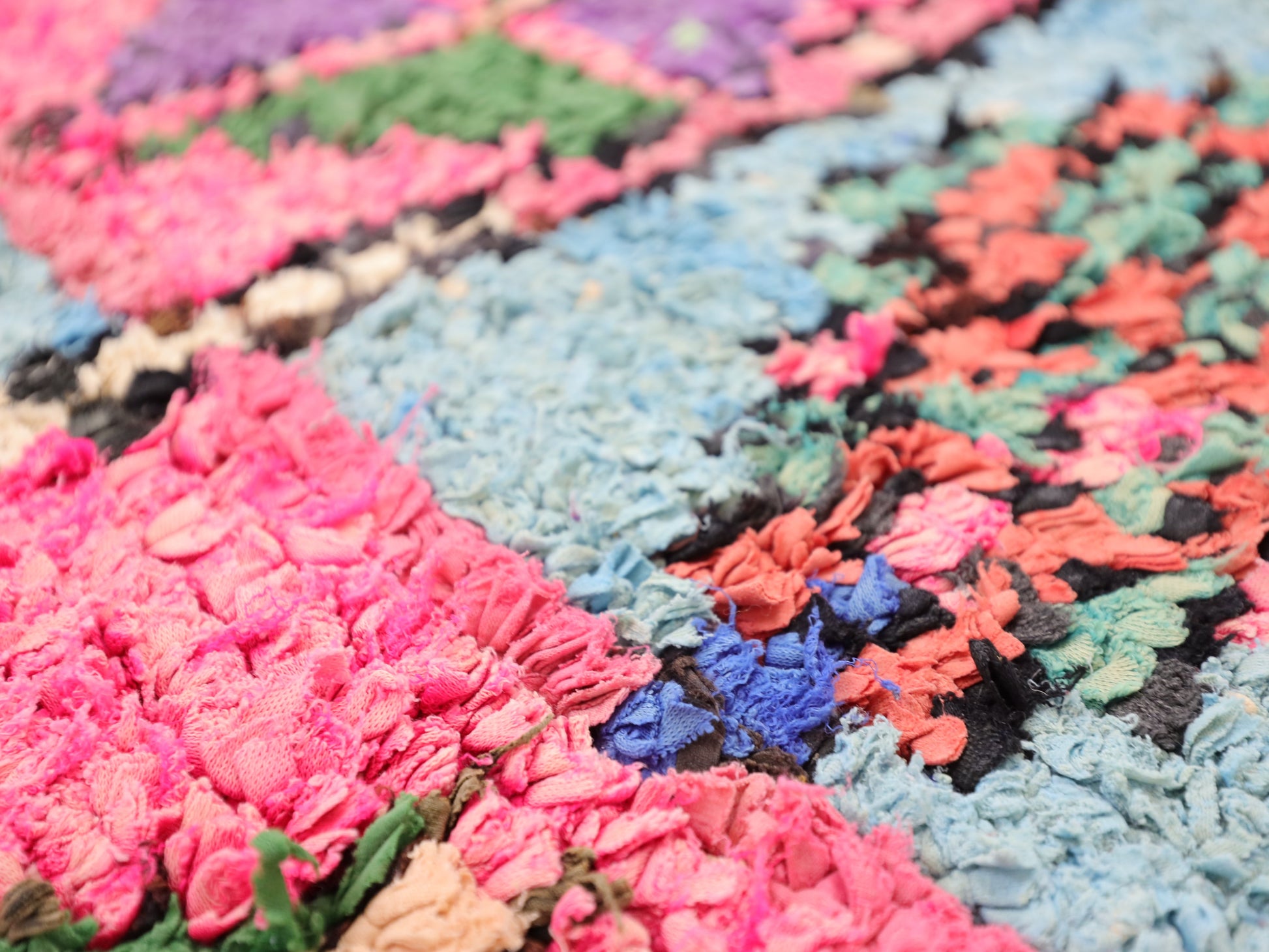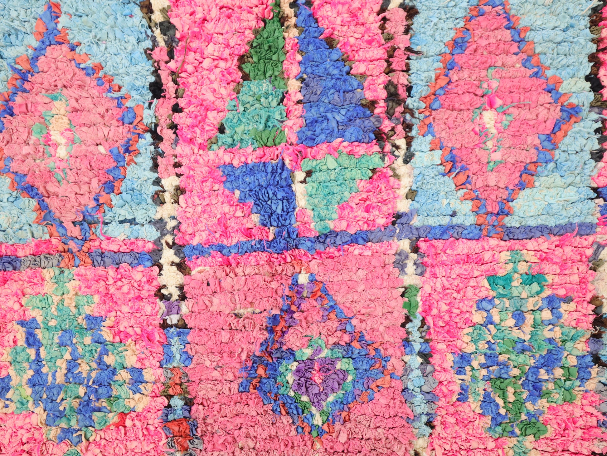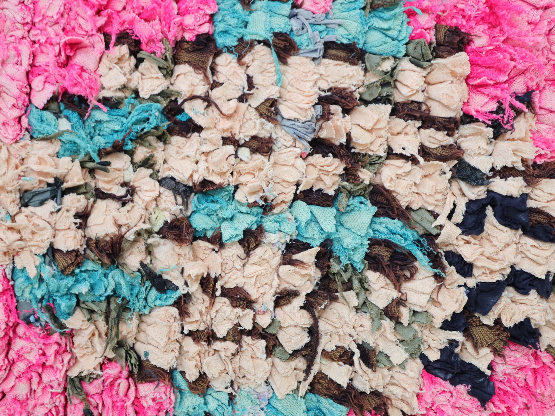 An unparalleled vintage masterpiece, carefully crafted by Berber Tribes in the Boucherouite style using upcycled textiles.