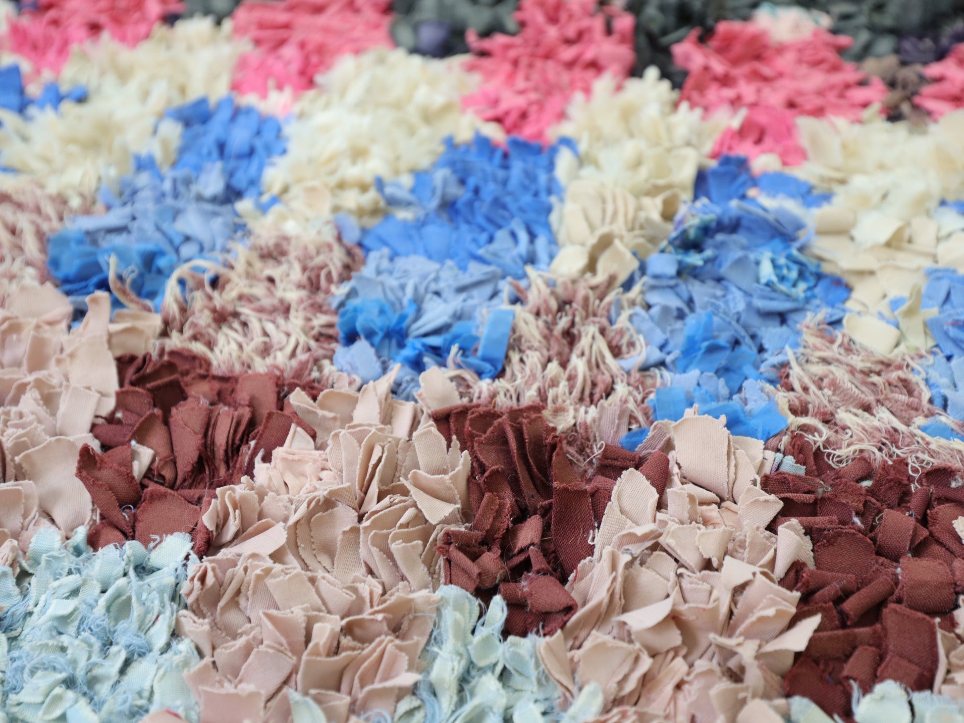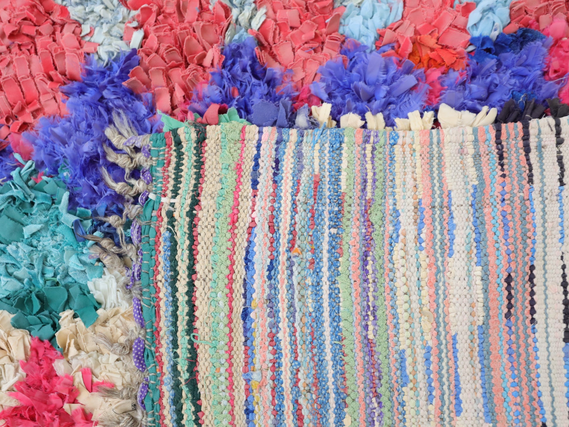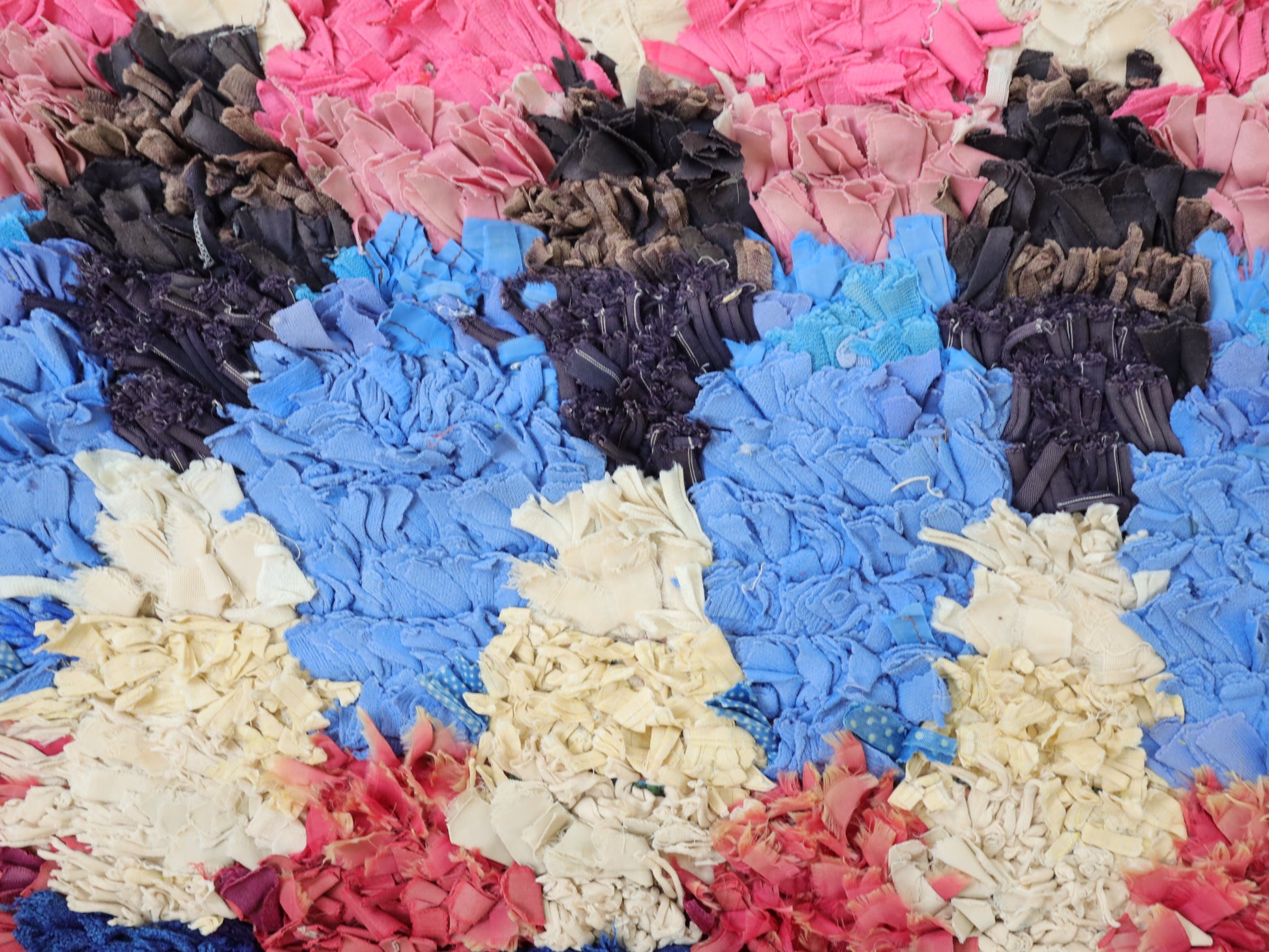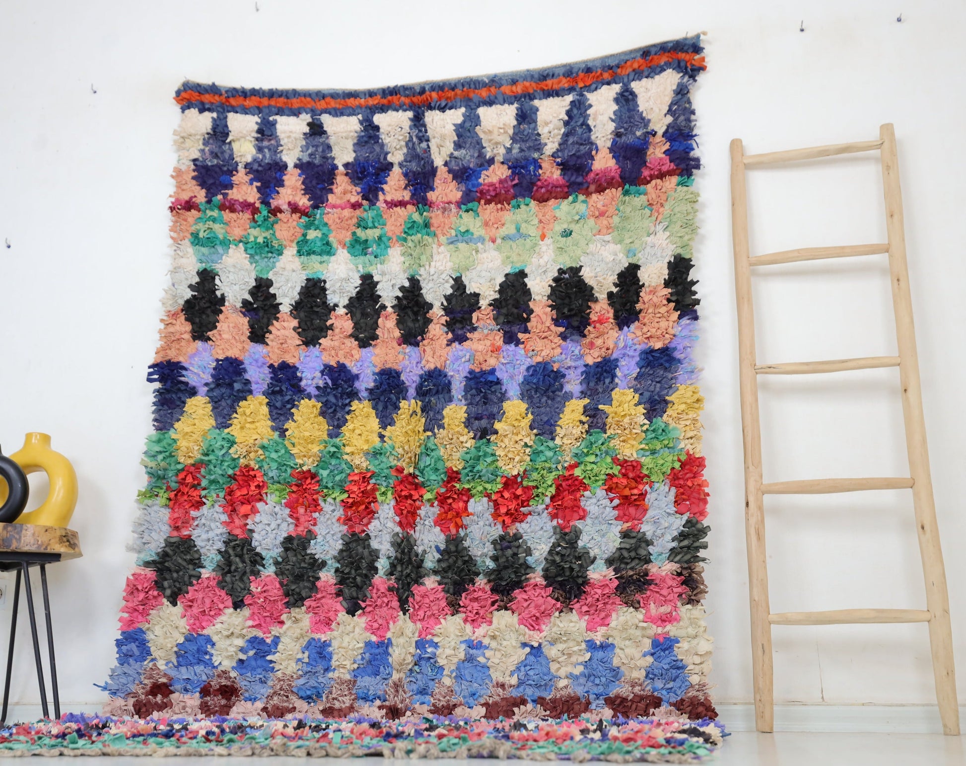 An unparalleled vintage masterpiece, carefully crafted by Berber Tribes in the Boucherouite style using upcycled textiles.