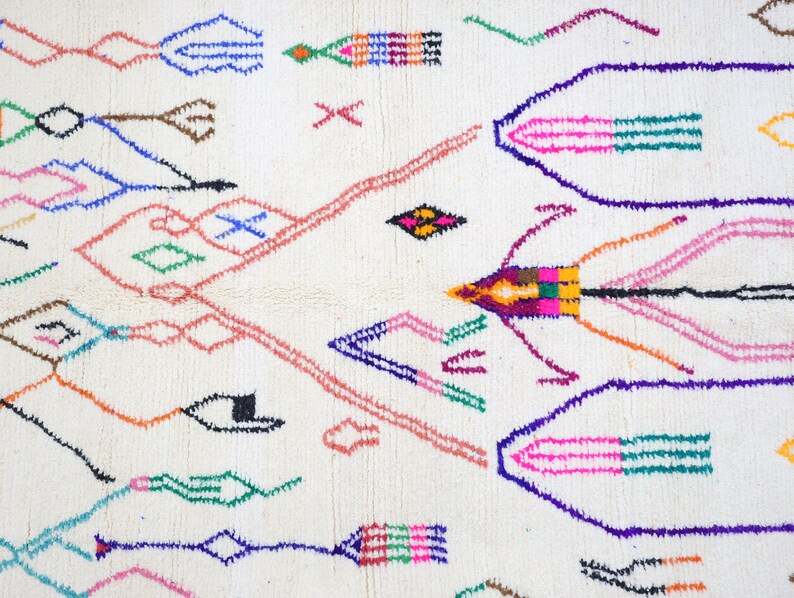 Azilal rugs boast abstract, painterly designs reminiscent of rugs from Ourika. What sets them apart is a vibrant color palette, achieved through the incorporation of cotton alongside wool.