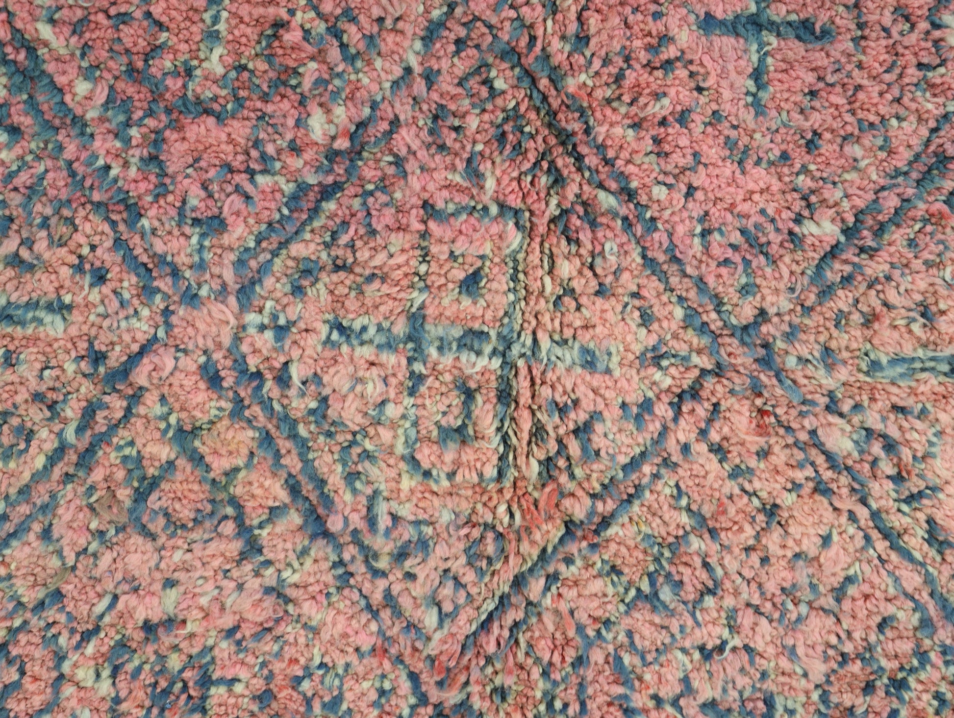 Originating in the Holy town of Boujad, these rugs, woven by diverse tribes, exhibit a wide spectrum of color, composition, and weave. Described as surreal, mystic, and mesmerizing, Boujad rugs transport us to a world beyond reality. Their construction, with twice as many horizontal as vertical knots, renders them floppy and easy to move.
