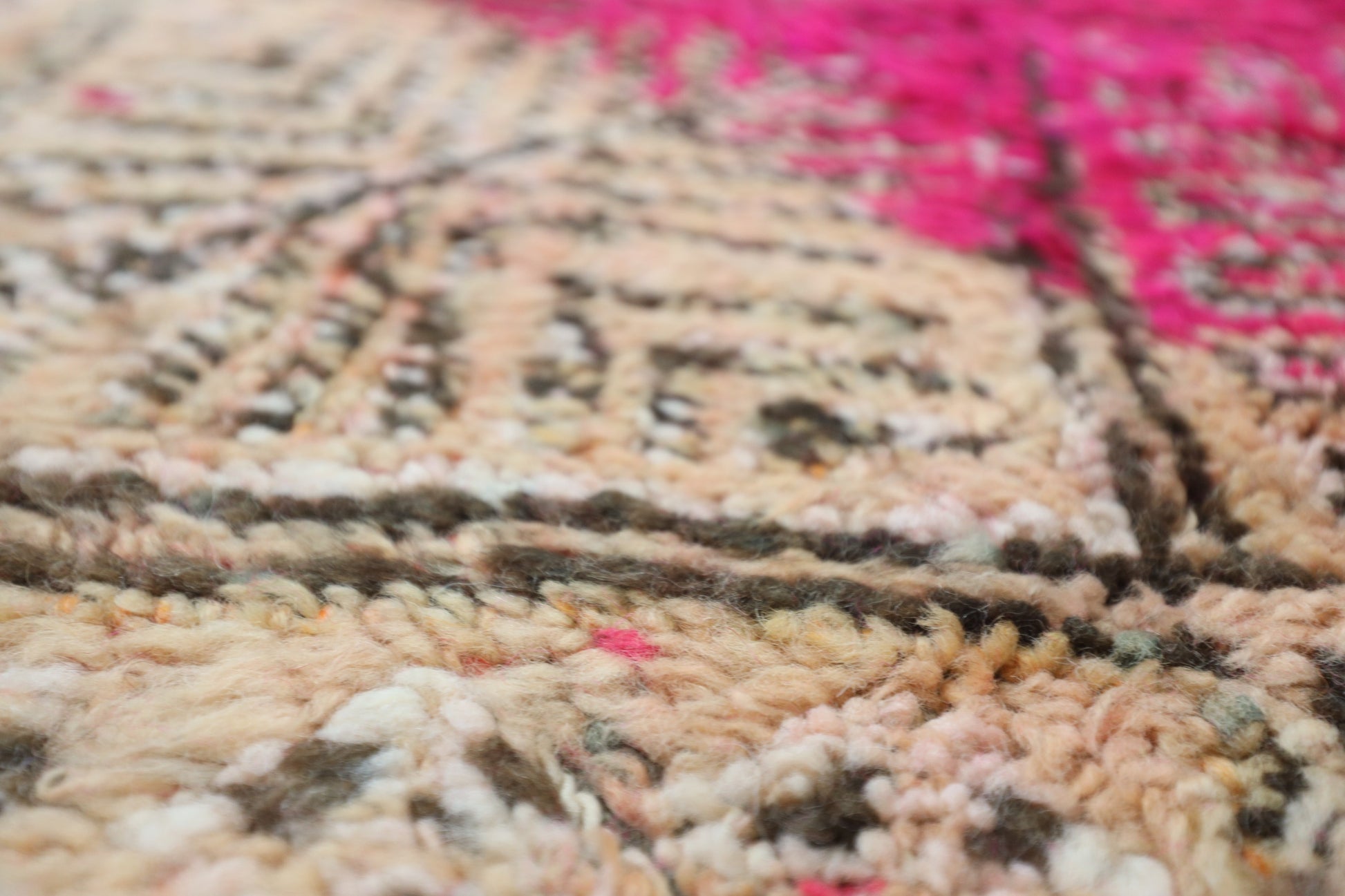 Wool, a sacred material for the Amazigh (Berber) people, forms the cornerstone of Moroccan rug design. Durable, long-lasting, and soft underfoot, wool is both functional and comfortable. In this piece, the wool pile is expertly knotted onto a wool foundation, adding substance and allowing it to gracefully embrace the floor.