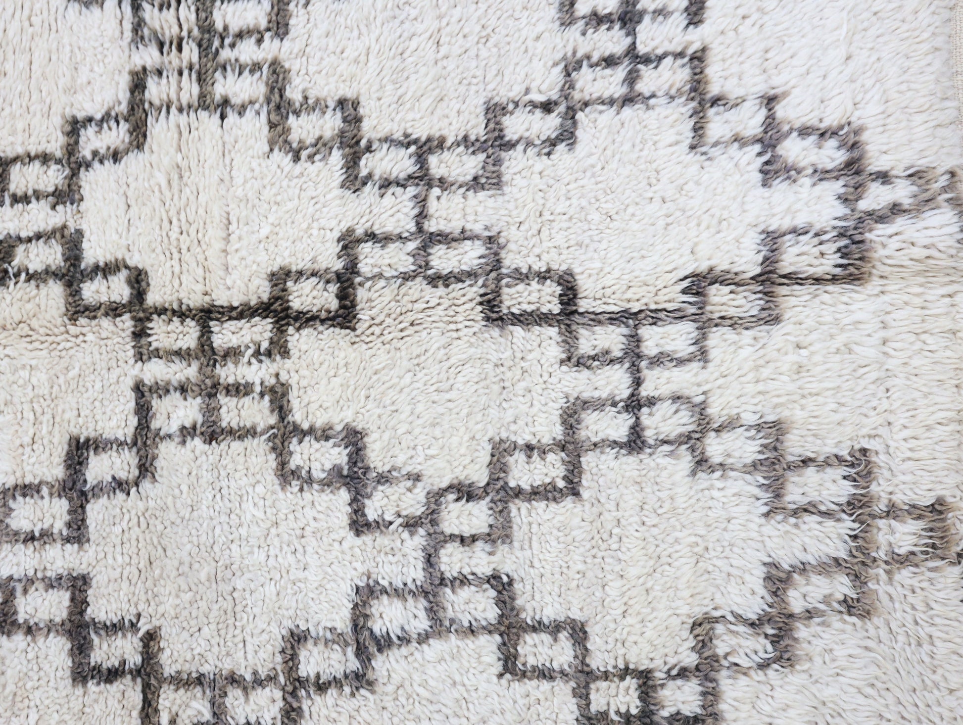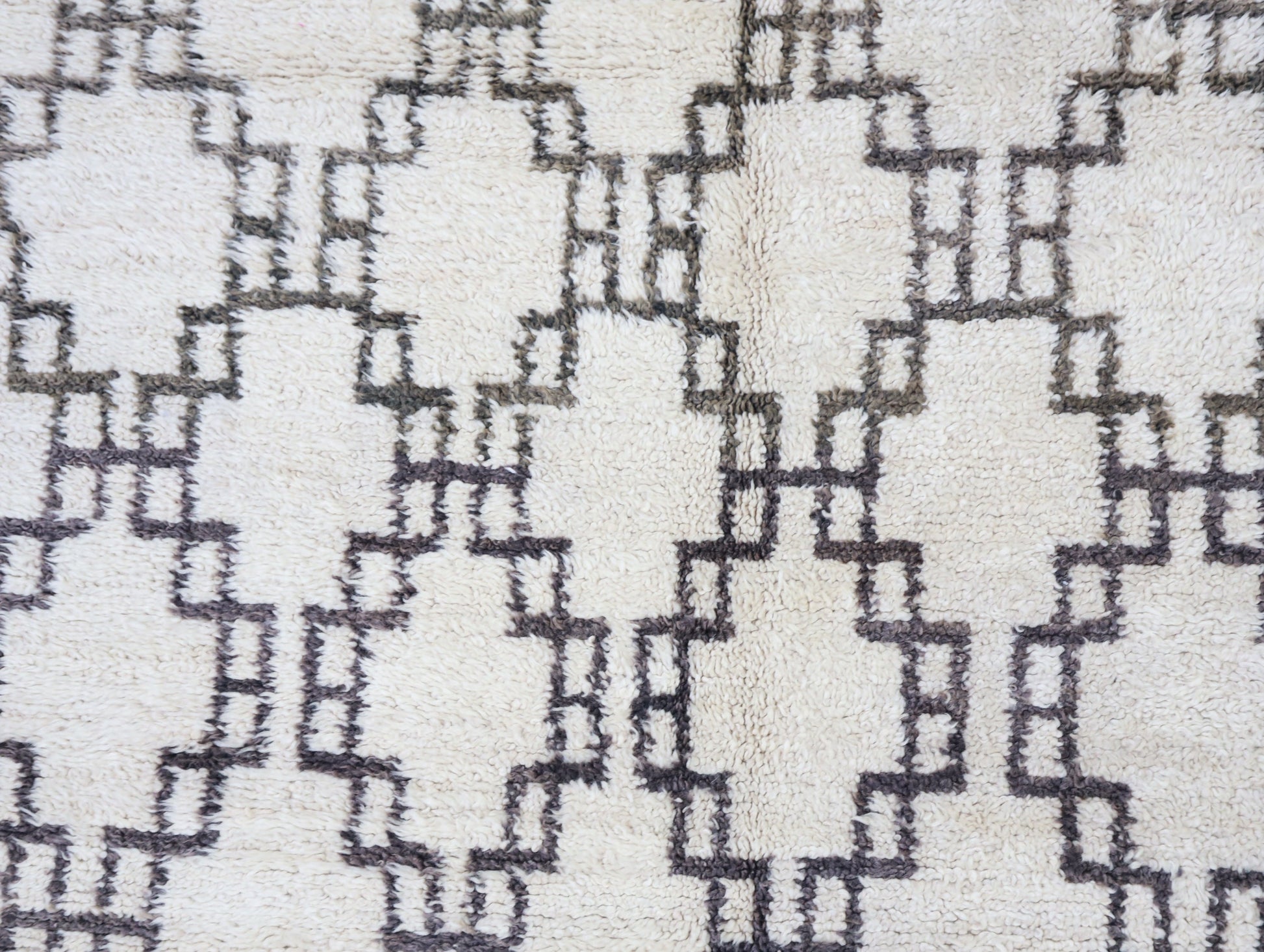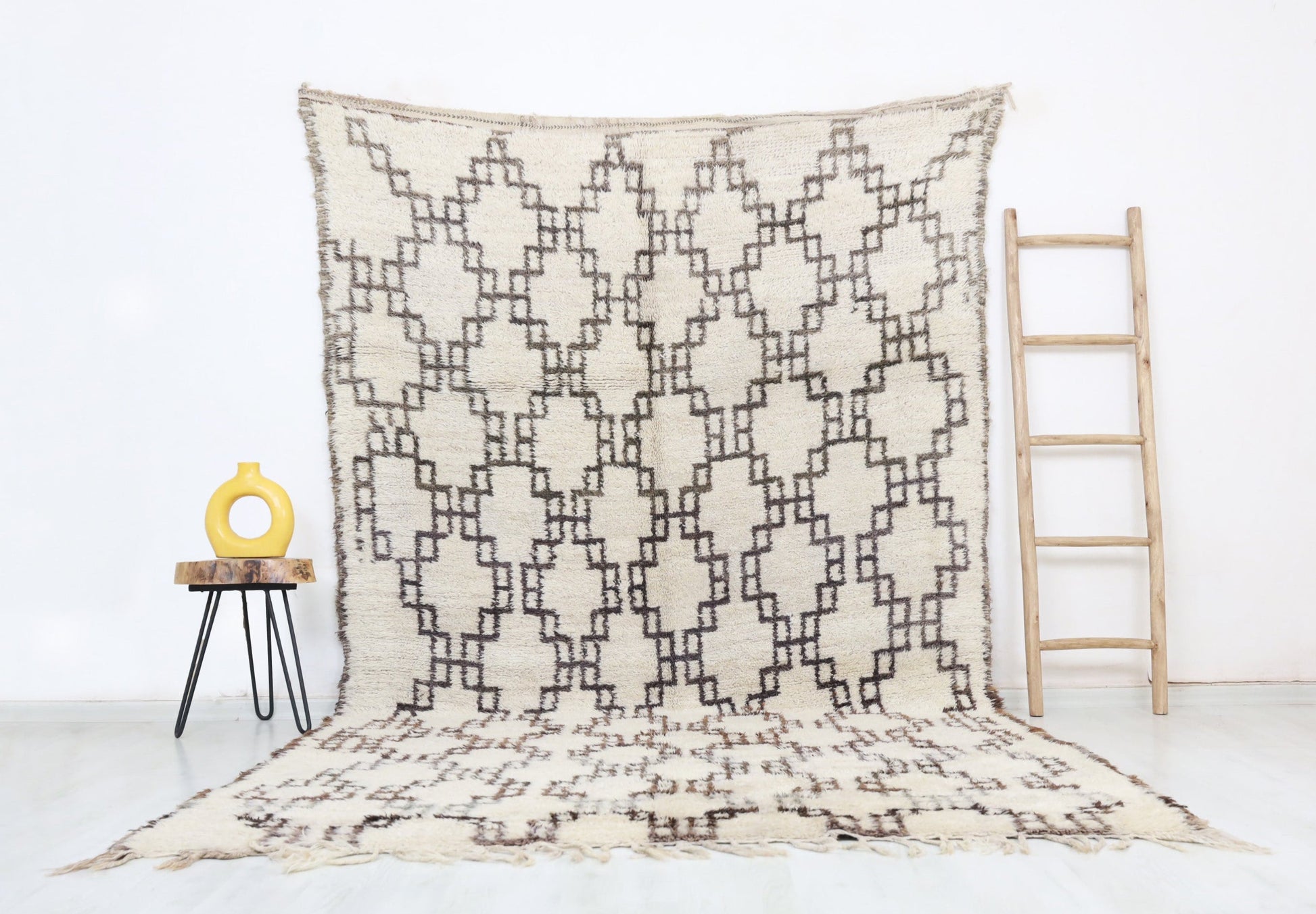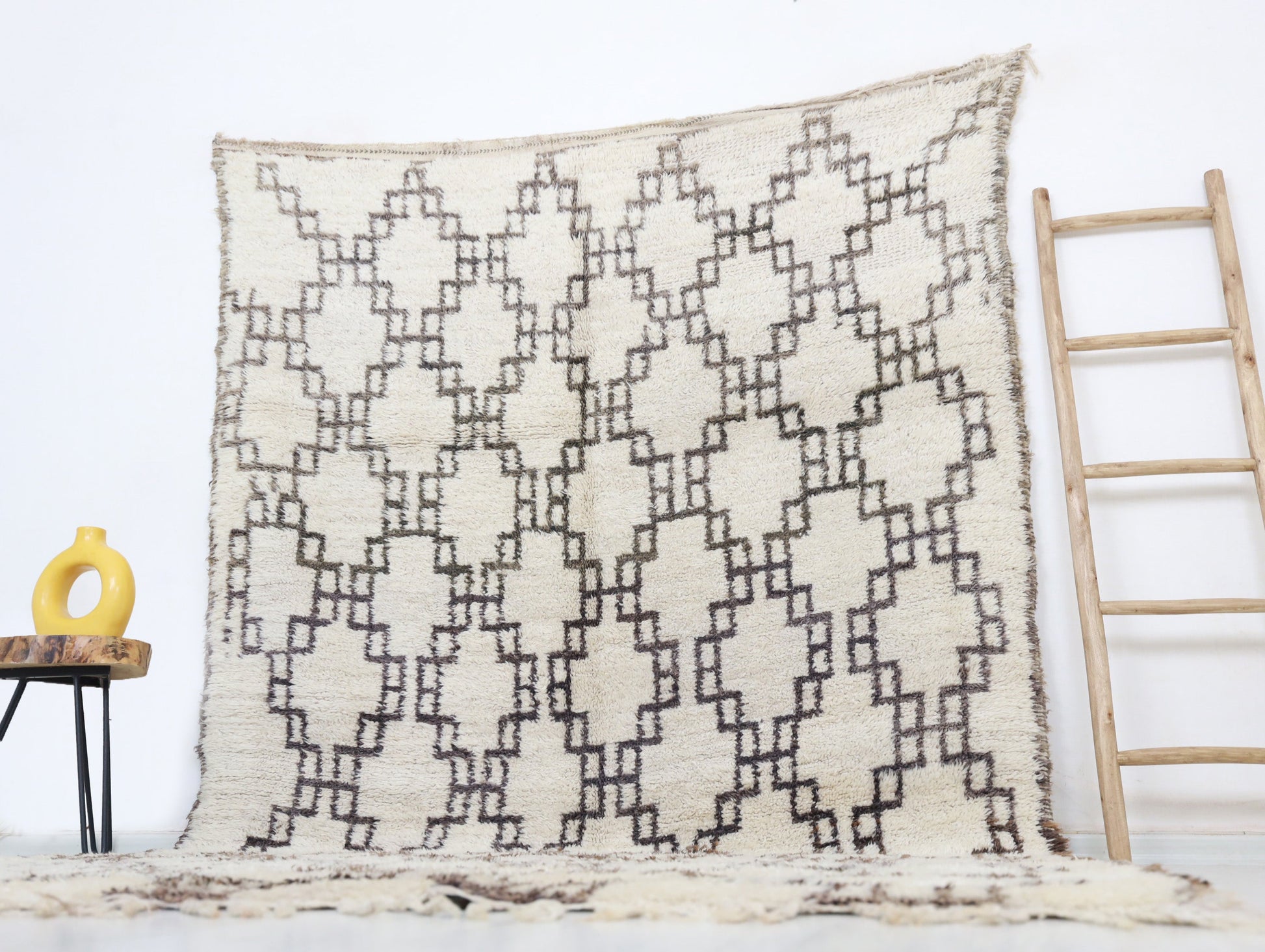 Wool, a sacred material for the Amazigh (Berber) people, forms the cornerstone of Moroccan rug design. Durable, long-lasting, and soft underfoot, wool is both functional and comfortable. In this piece, the wool pile is expertly knotted onto a wool foundation, adding substance and allowing it to gracefully embrace the floor.