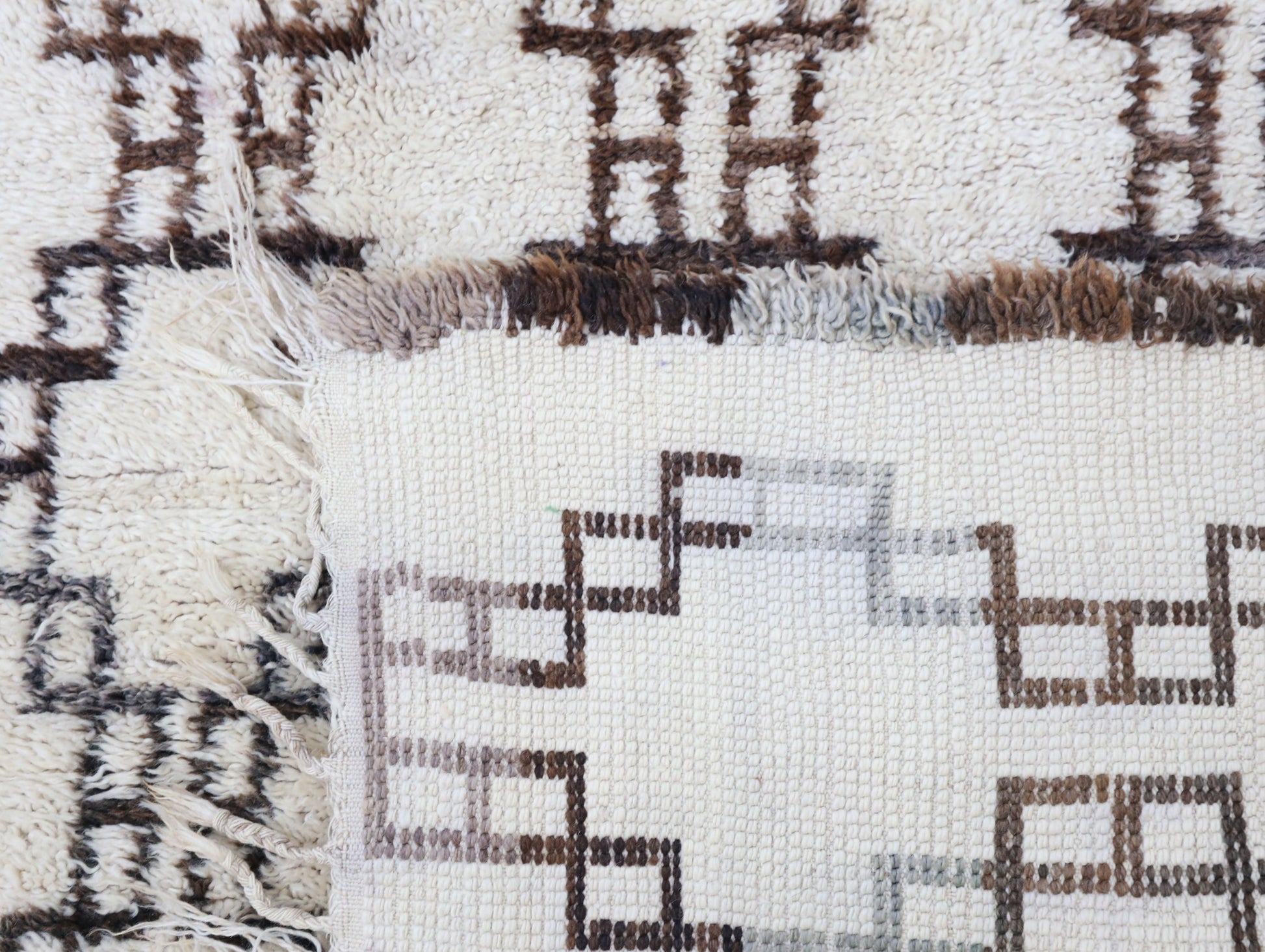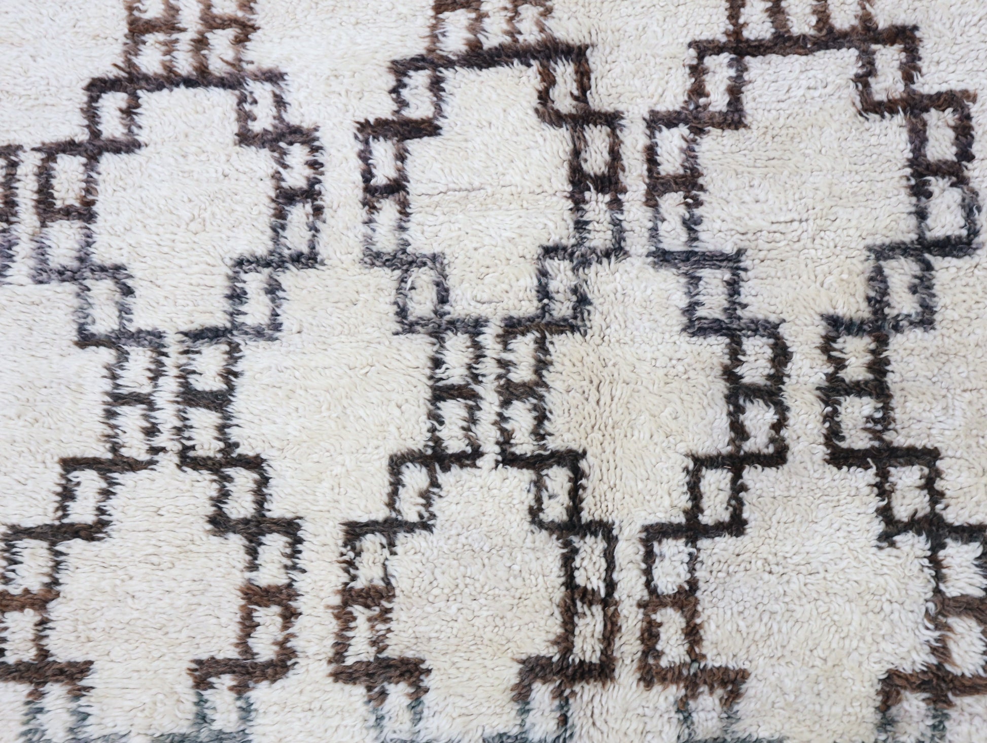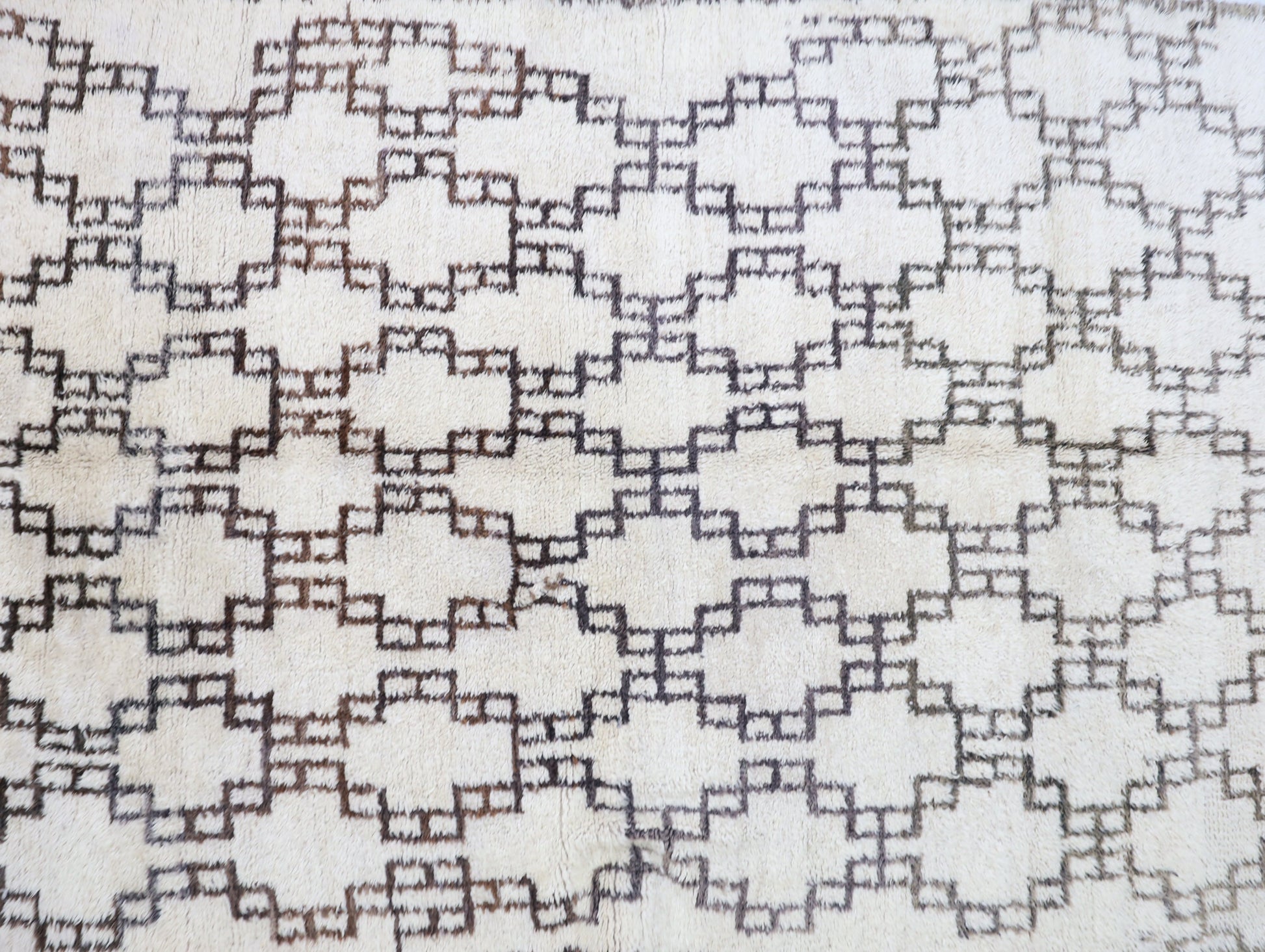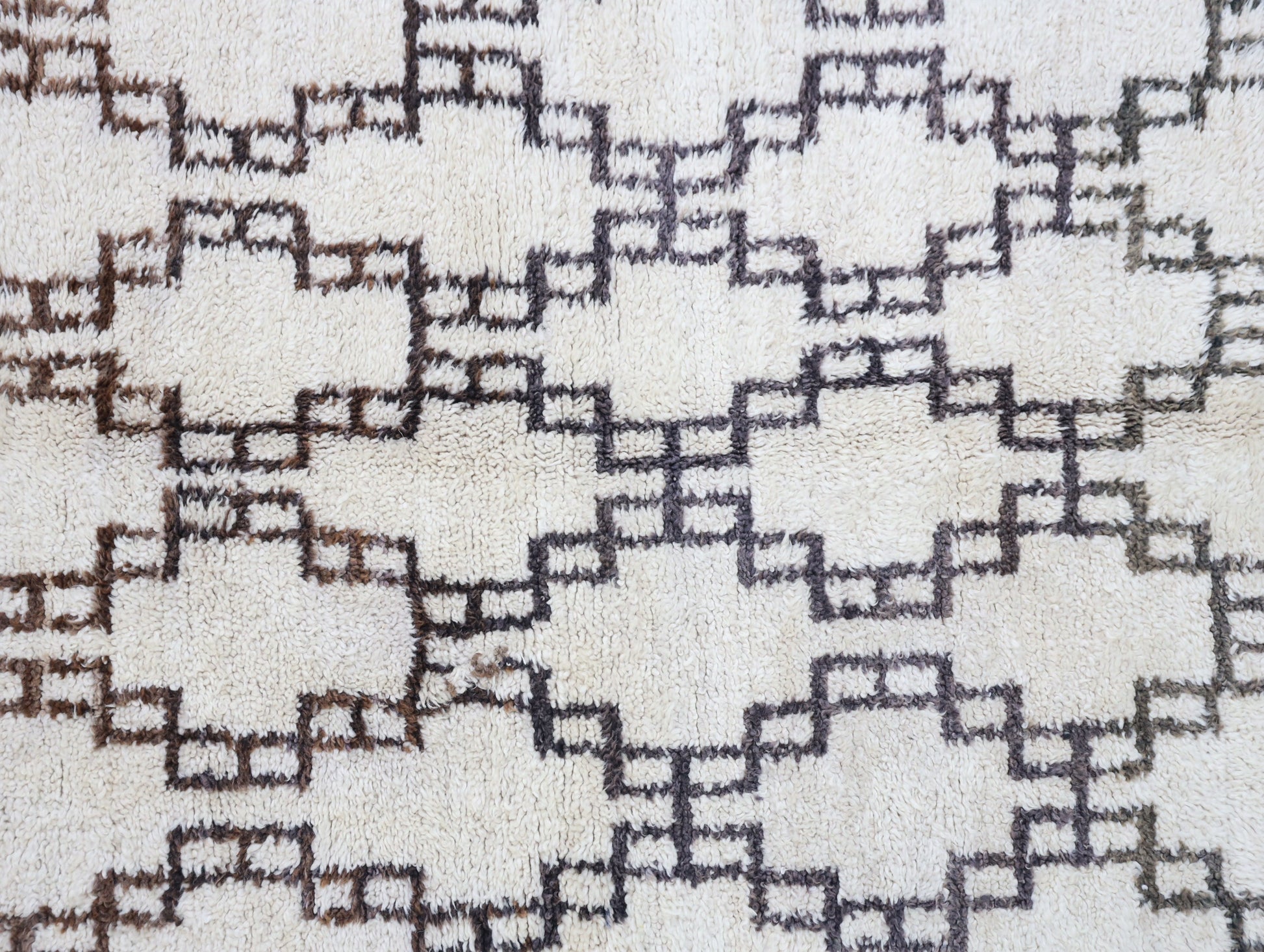 Wool, a sacred material for the Amazigh (Berber) people, forms the cornerstone of Moroccan rug design. Durable, long-lasting, and soft underfoot, wool is both functional and comfortable. In this piece, the wool pile is expertly knotted onto a wool foundation, adding substance and allowing it to gracefully embrace the floor.