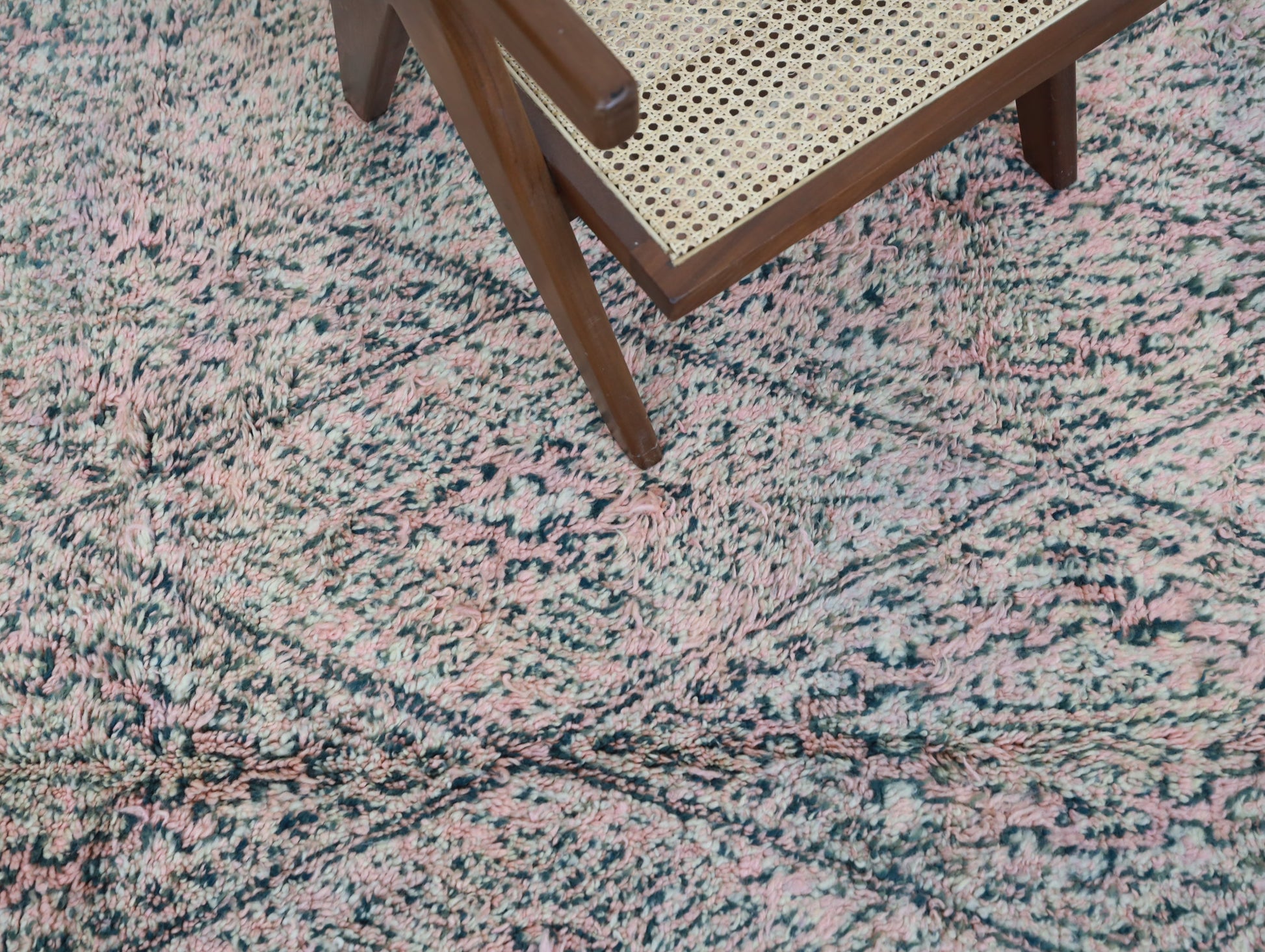 Originating in the Holy town of Boujad, these rugs, woven by diverse tribes, exhibit a wide spectrum of color, composition, and weave. Described as surreal, mystic, and mesmerizing, Boujad rugs transport us to a world beyond reality. Their construction, with twice as many horizontal as vertical knots, renders them floppy and easy to move.