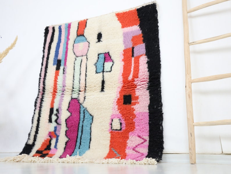 This unique rug, singular in its design, was intricately hand-knotted by the Beni Ourain tribes nestled in Morocco's Middle Atlas mountains.