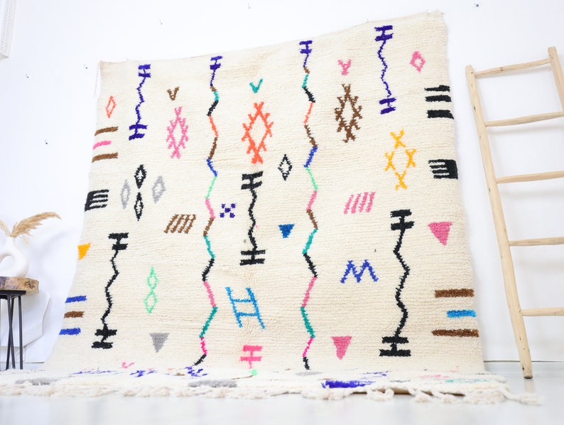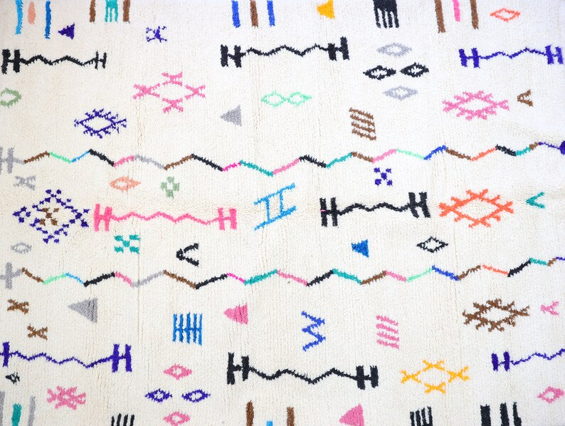 Azilal rugs boast abstract, painterly designs reminiscent of rugs from Ourika. What sets them apart is a vibrant color palette, achieved through the incorporation of cotton alongside wool.
