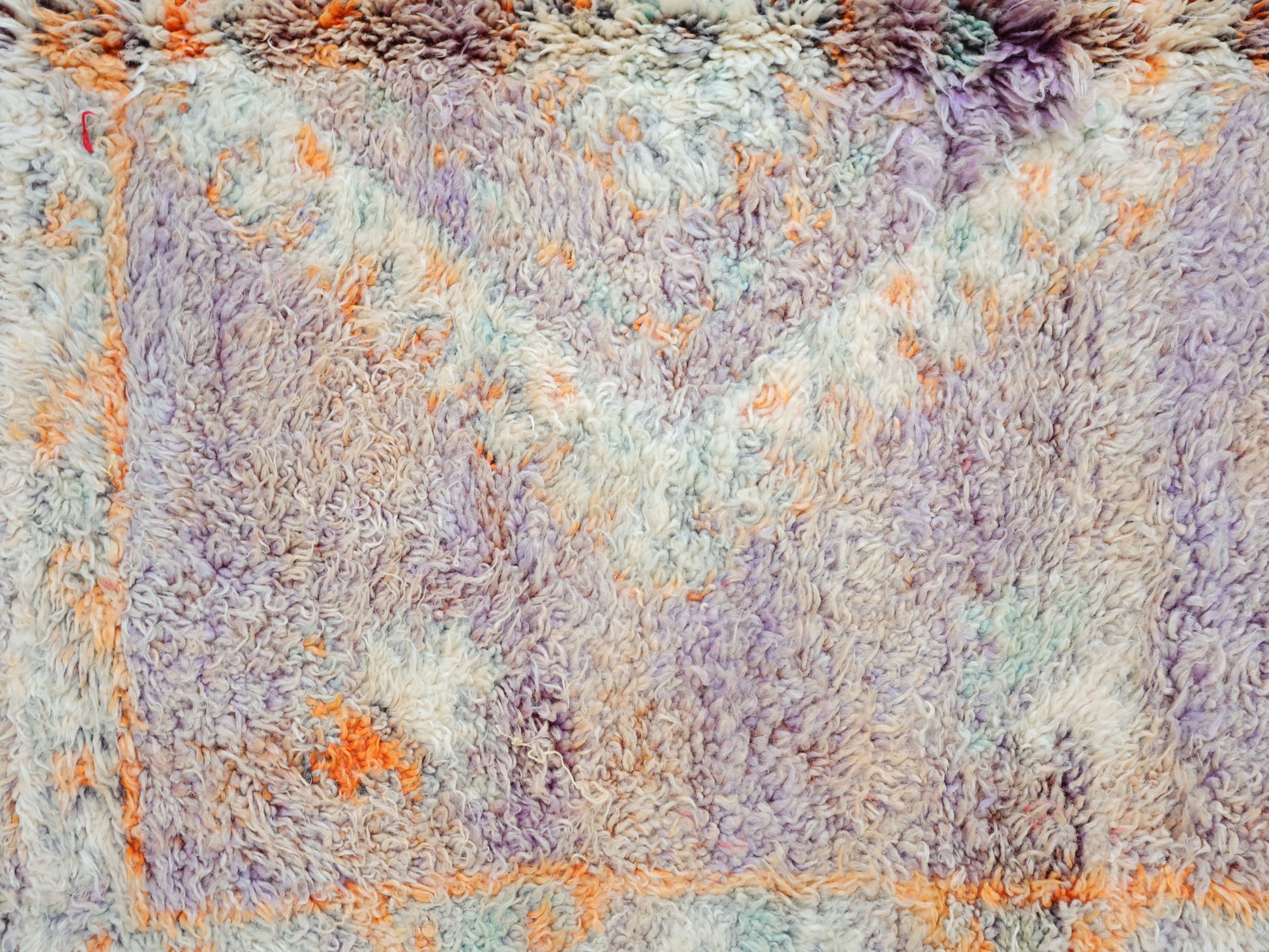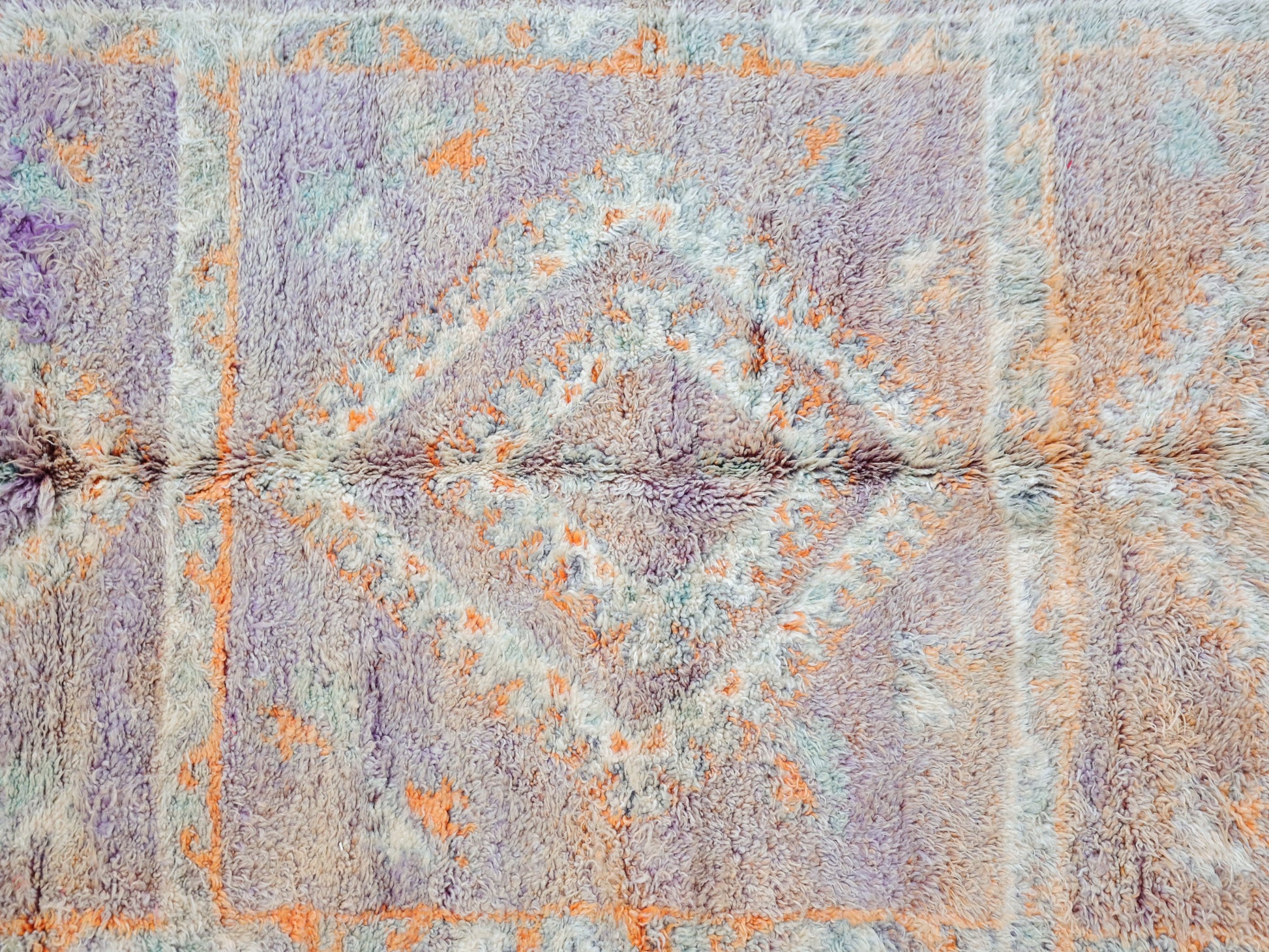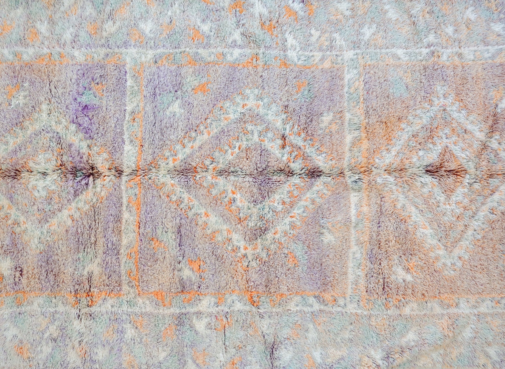 Originating in the Holy town of Boujad, these rugs, woven by diverse tribes, exhibit a wide spectrum of color, composition, and weave. Described as surreal, mystic, and mesmerizing, Boujad rugs transport us to a world beyond reality. Their construction, with twice as many horizontal as vertical knots, renders them floppy and easy to move.