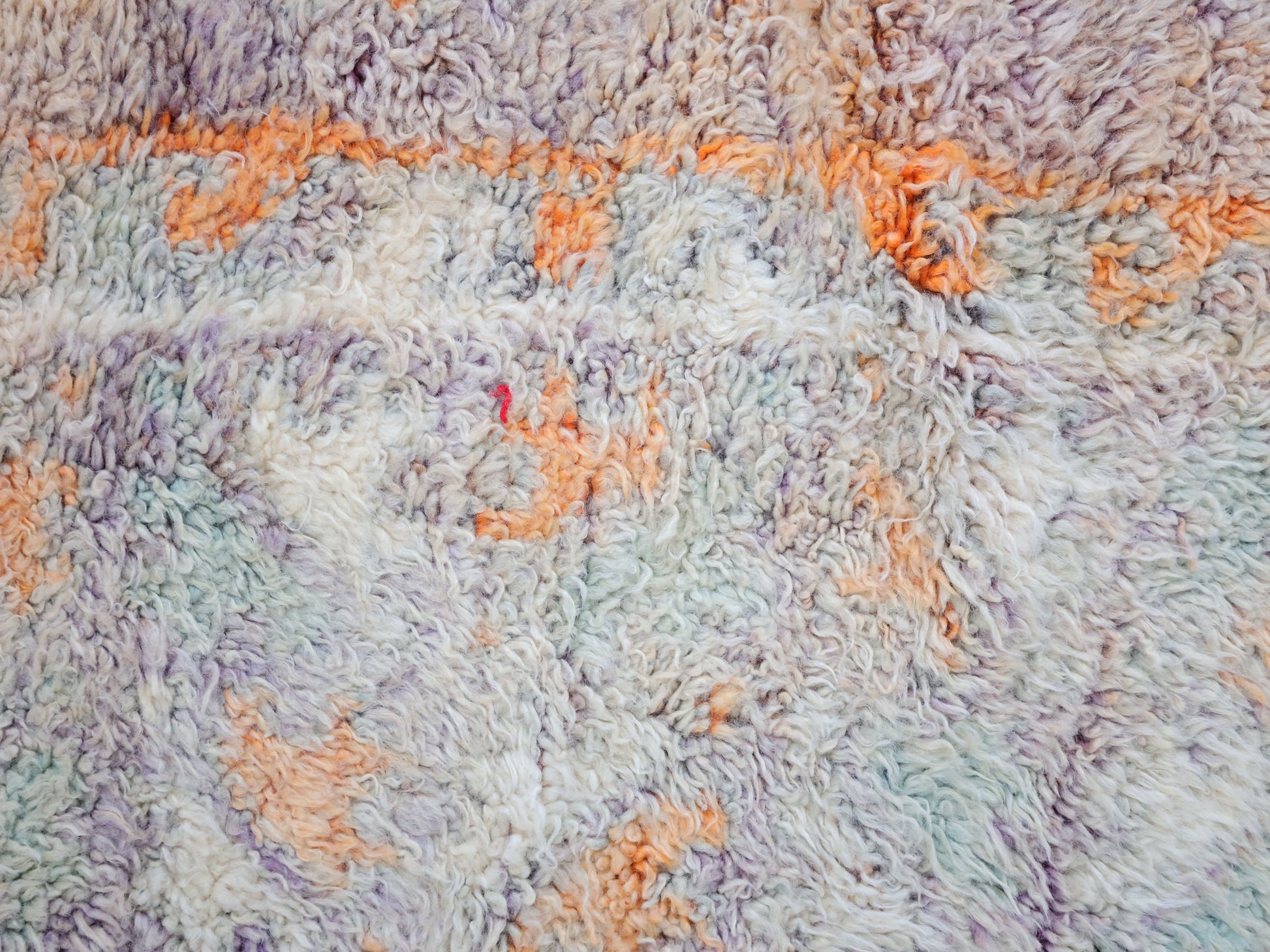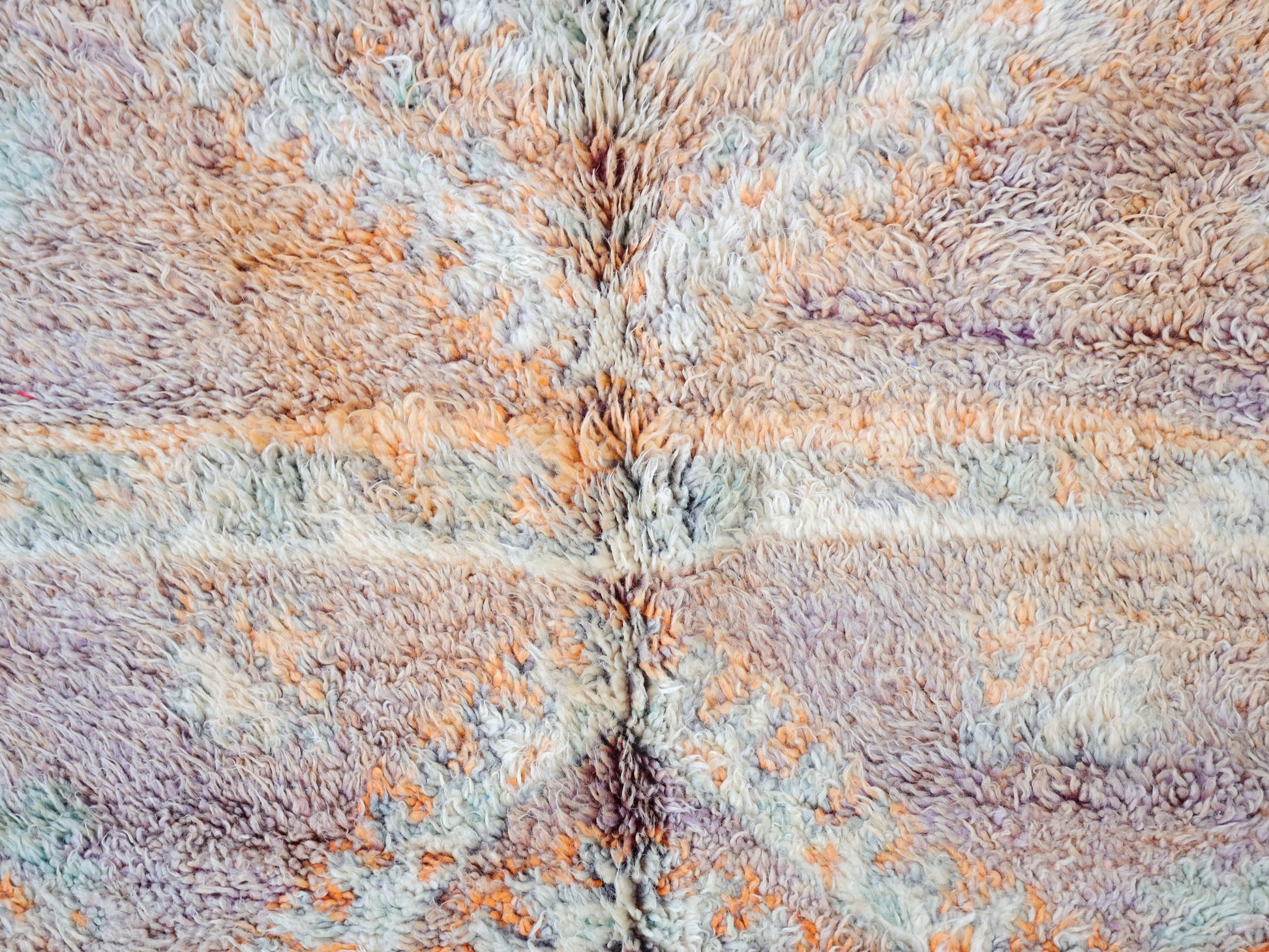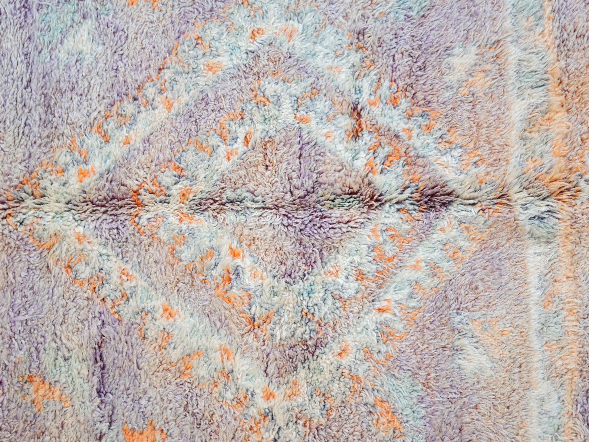 Wool, a sacred material for the Amazigh (Berber) people, forms the cornerstone of Moroccan rug design. Durable, long-lasting, and soft underfoot, wool is both functional and comfortable. In this piece, the wool pile is expertly knotted onto a wool foundation, adding substance and allowing it to gracefully embrace the floor.