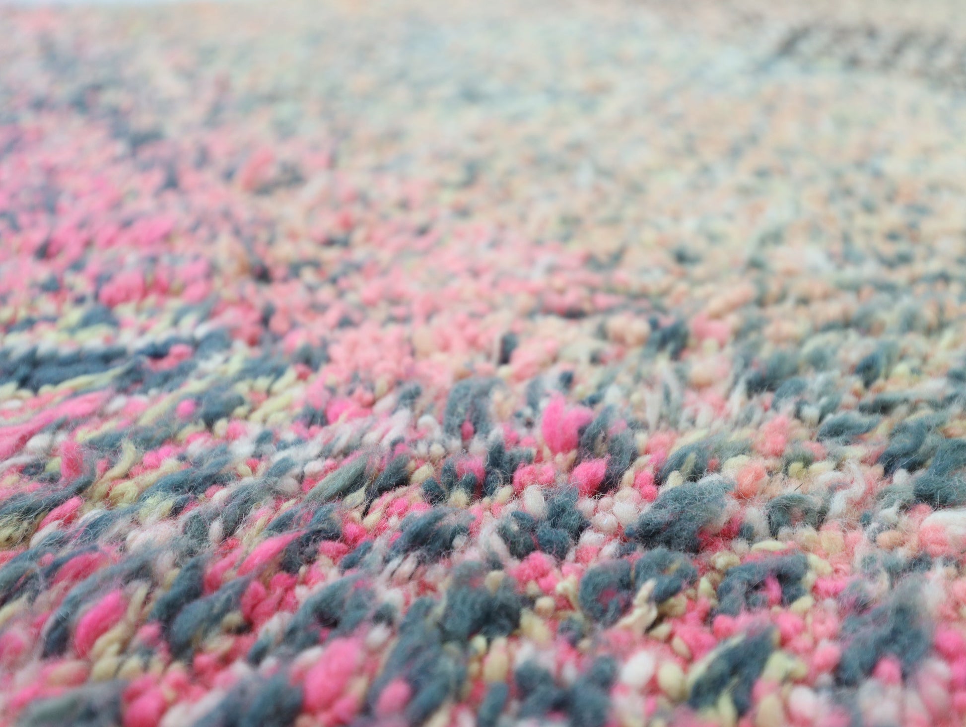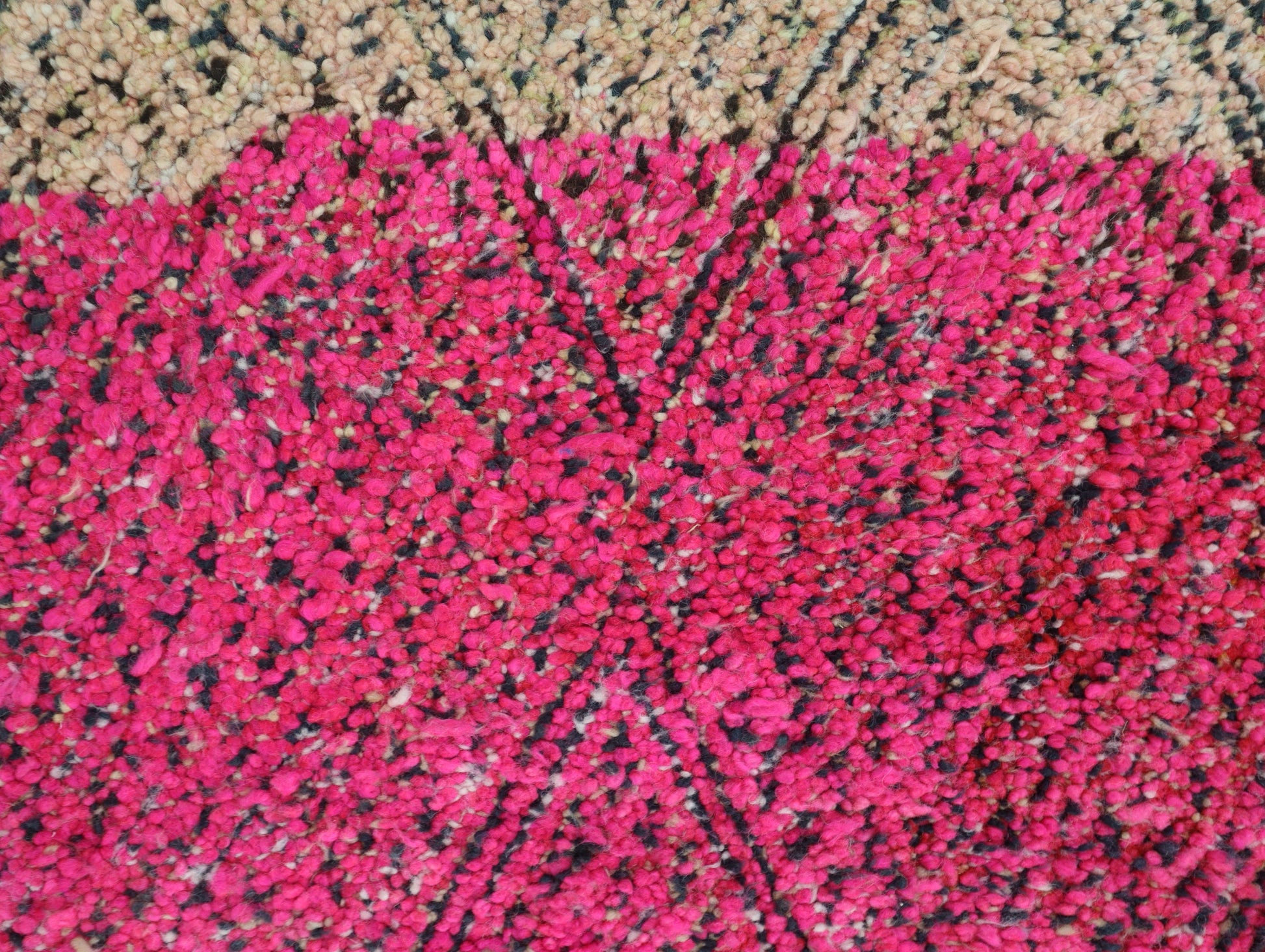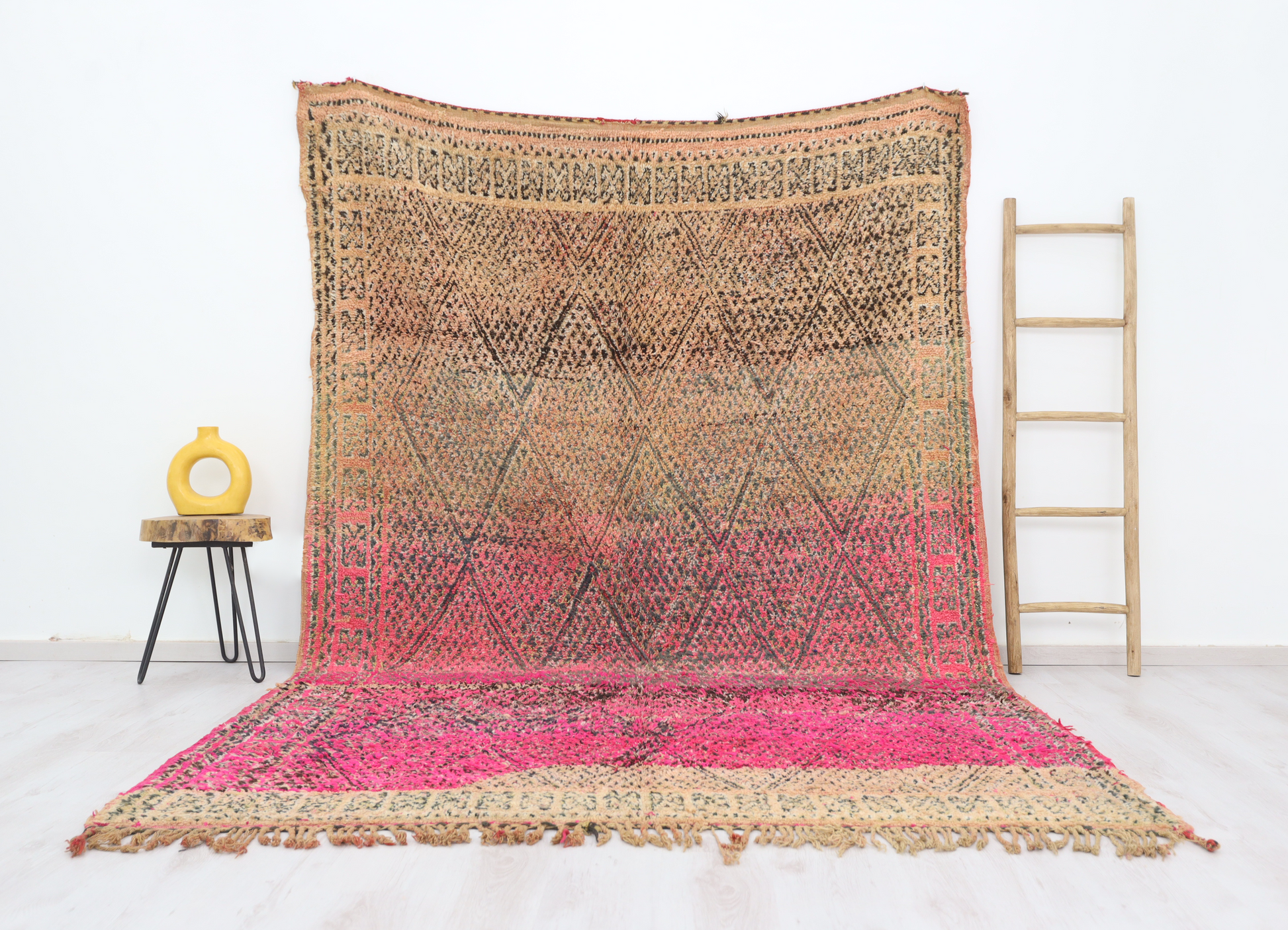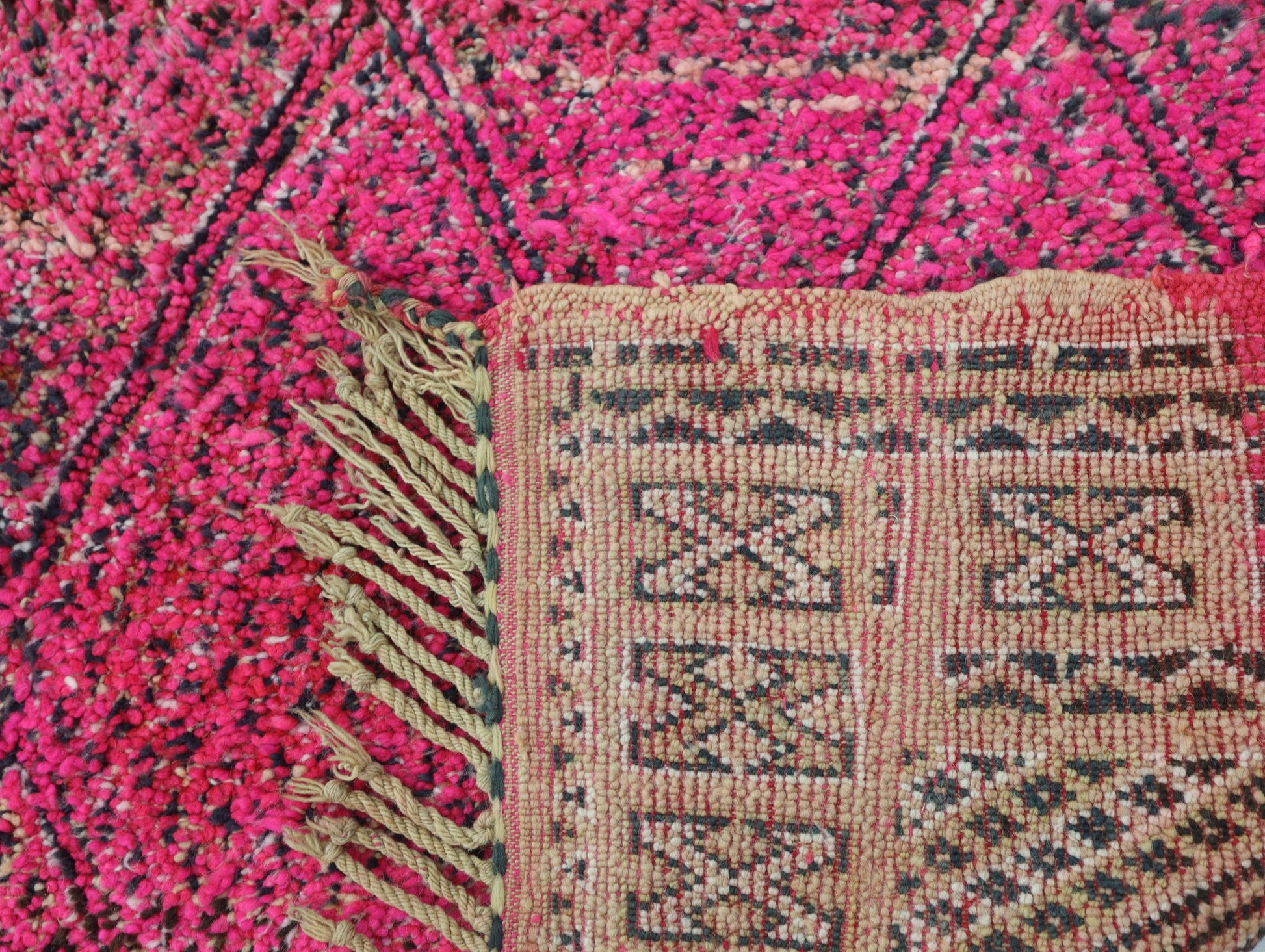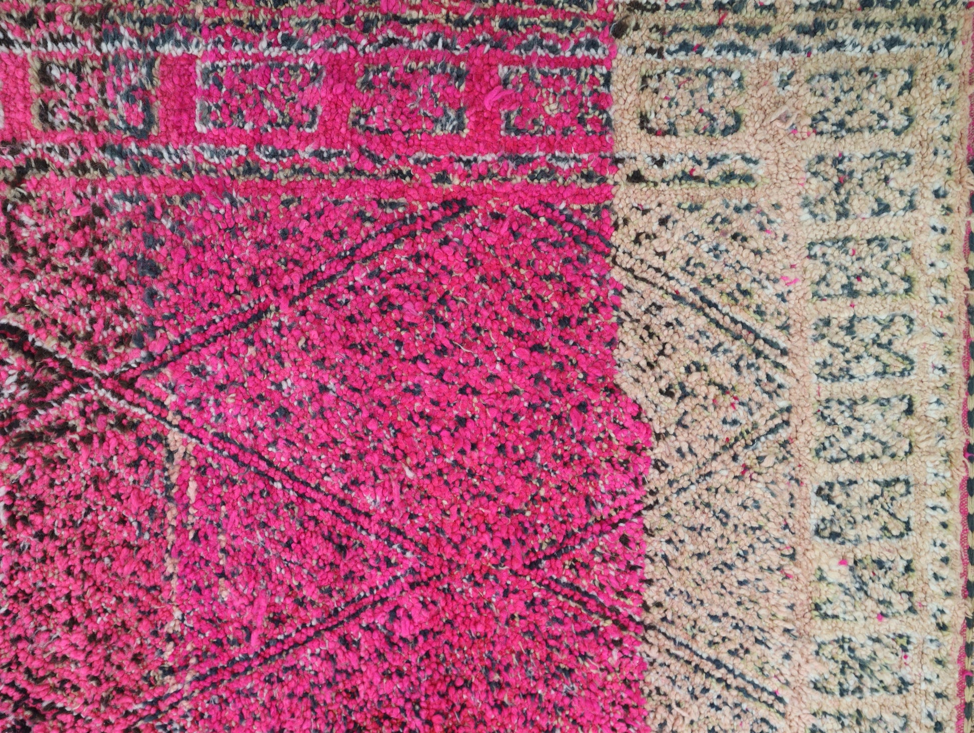Wool, a sacred material for the Amazigh (Berber) people, forms the cornerstone of Moroccan rug design. Durable, long-lasting, and soft underfoot, wool is both functional and comfortable. In this piece, the wool pile is expertly knotted onto a wool foundation, adding substance and allowing it to gracefully embrace the floor.