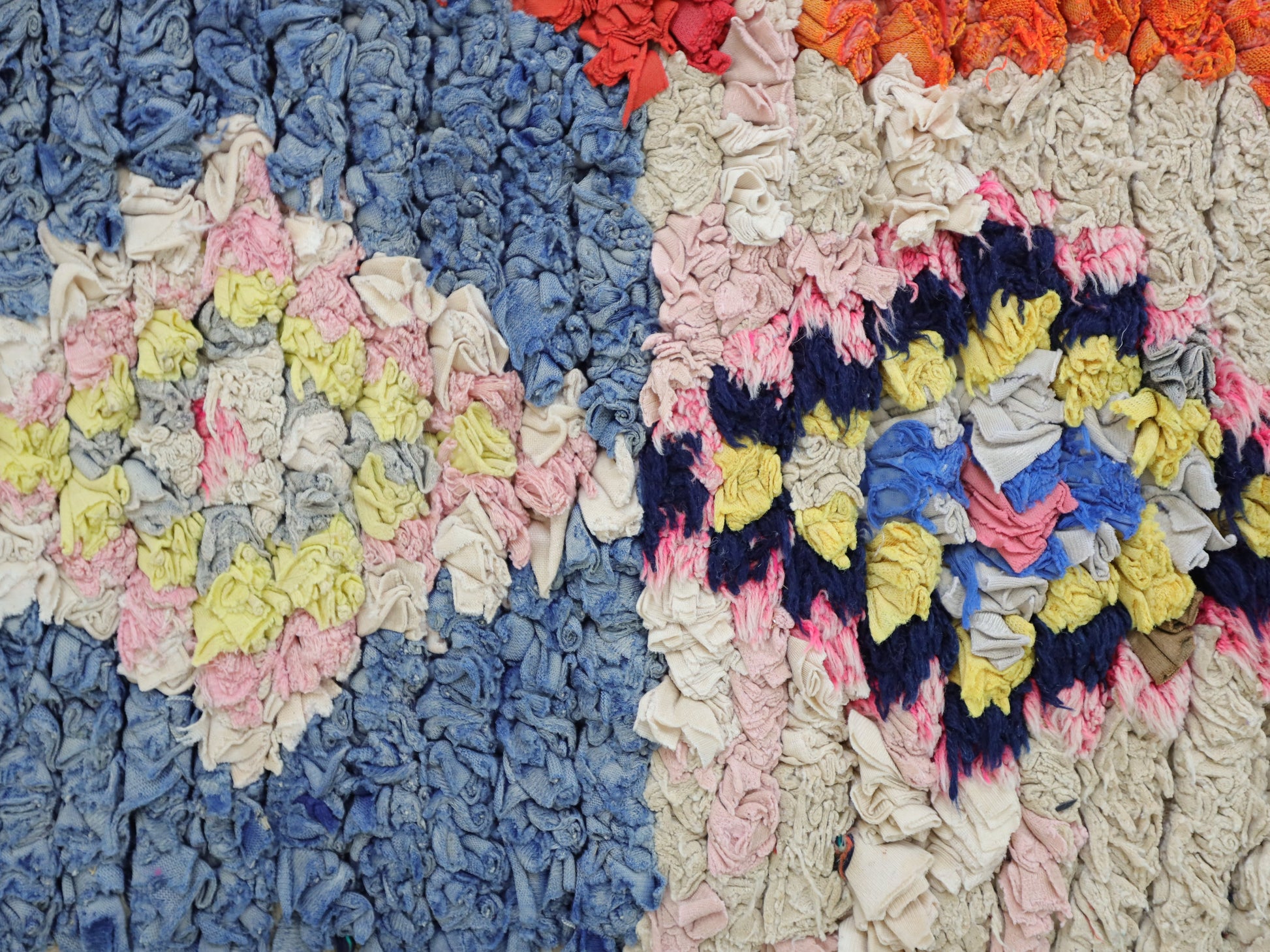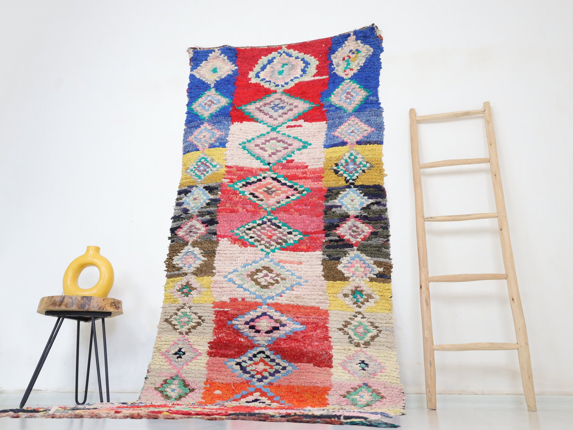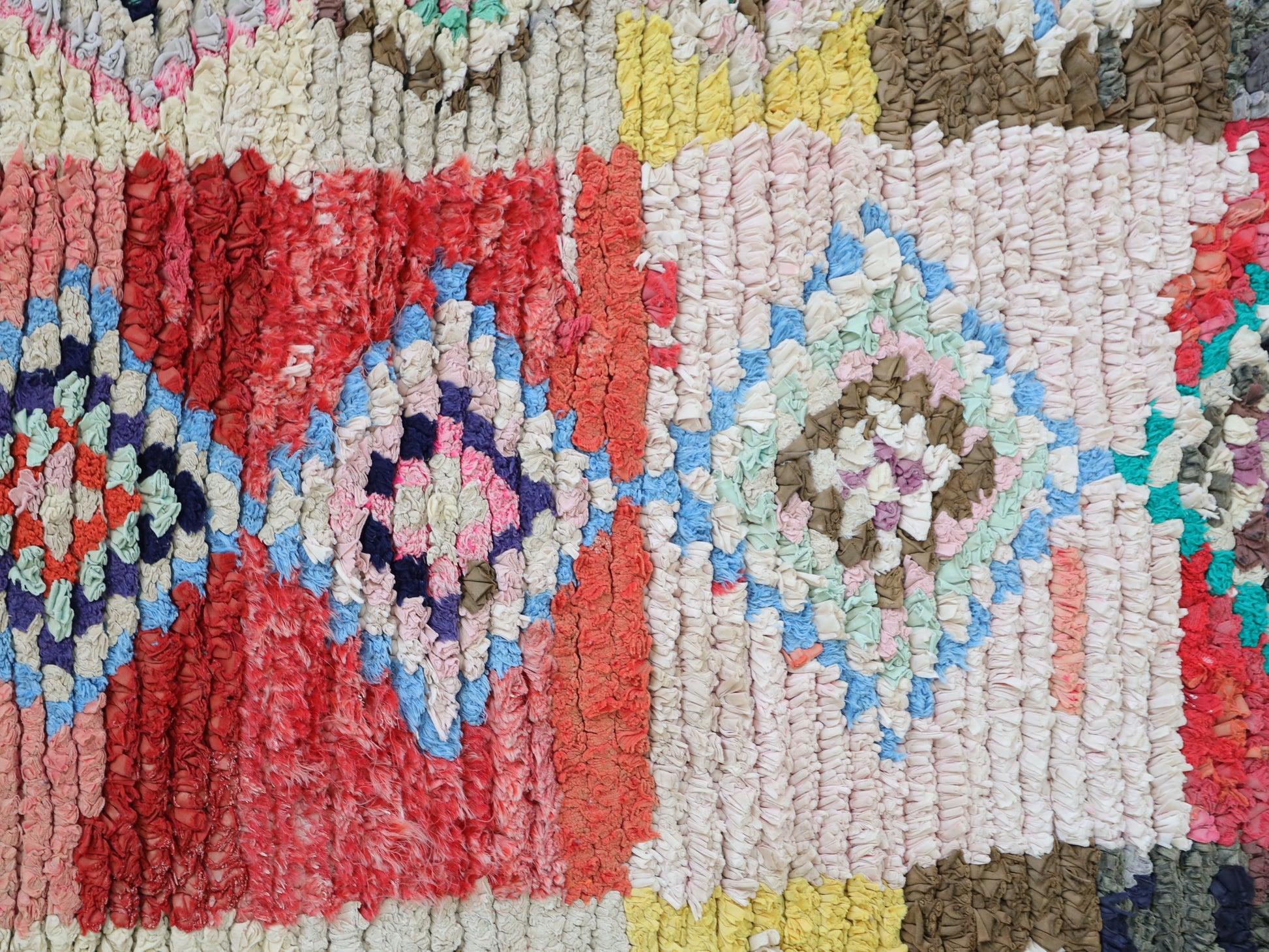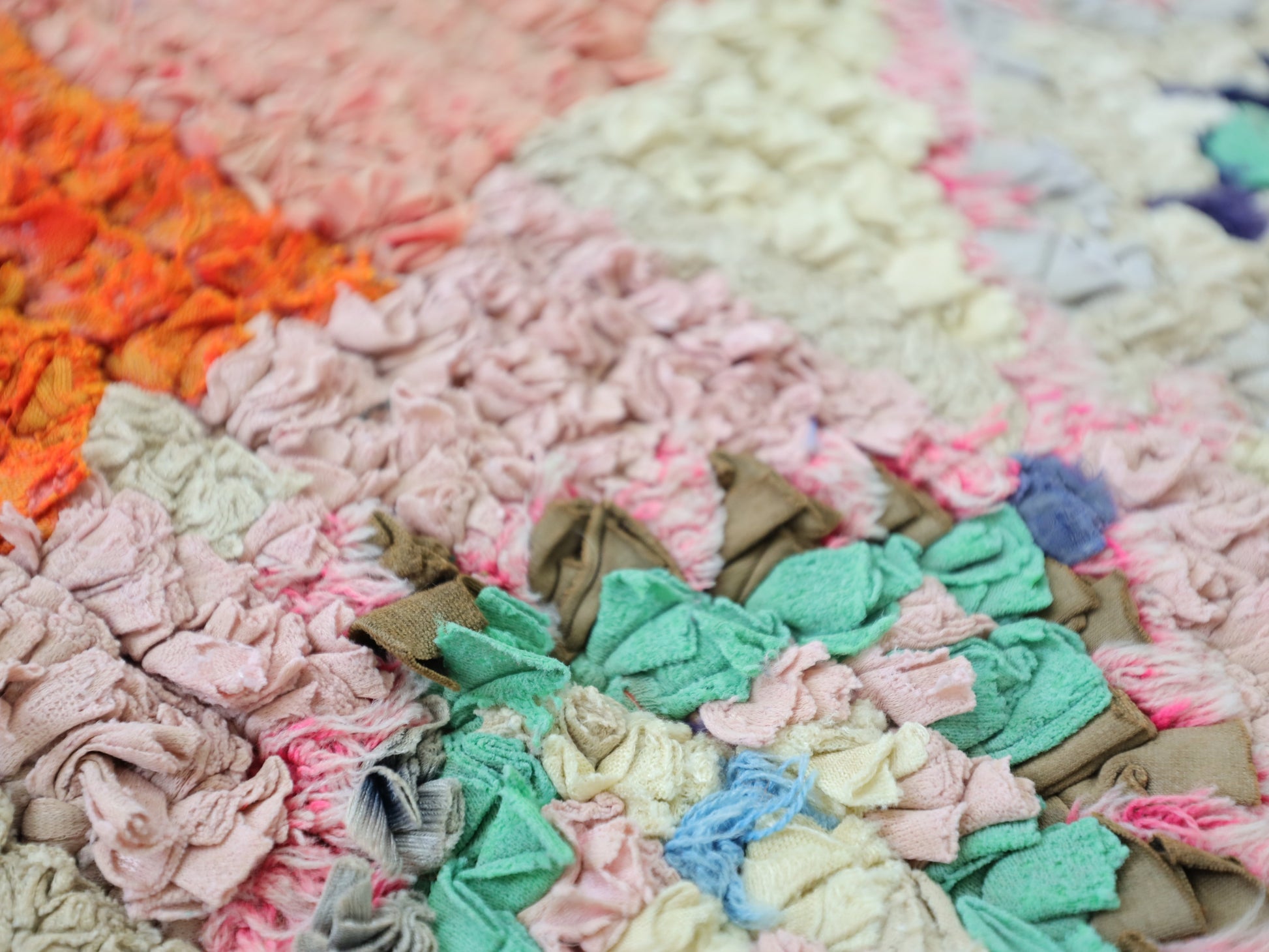 An unparalleled vintage masterpiece, carefully crafted by Berber Tribes in the Boucherouite style using upcycled textiles.