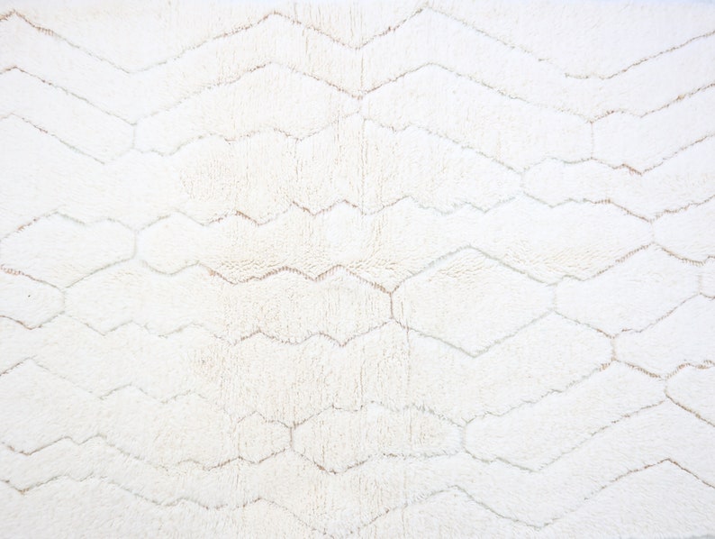 This unique rug, singular in its design, was intricately hand-knotted by the Beni Ourain tribes nestled in Morocco's Middle Atlas mountains.