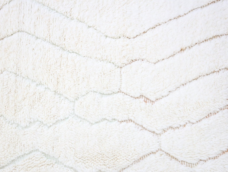 Sourced locally, Moroccan wool produces a dense, sturdy pile that feels soft and fluffy underfoot. While a touch of shedding is natural, it's a small price to pay for the cherished wild, tousled texture of the high pile—a comfort beloved for its durability, longevity, and the soft embrace it offers with every step.