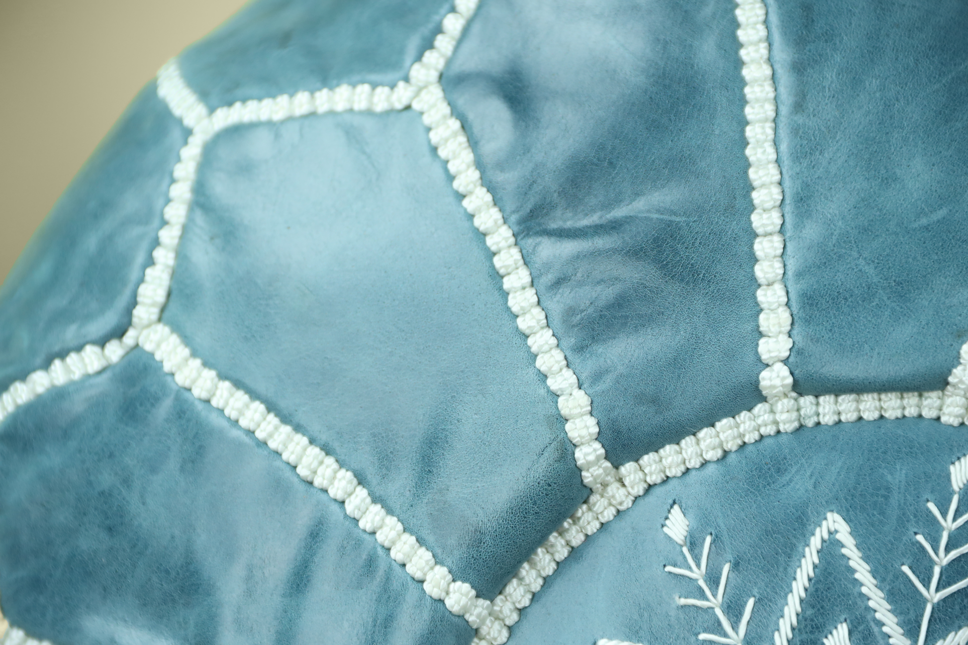 Each leather pouf is intricately handwoven by skilled Moroccan artisans.