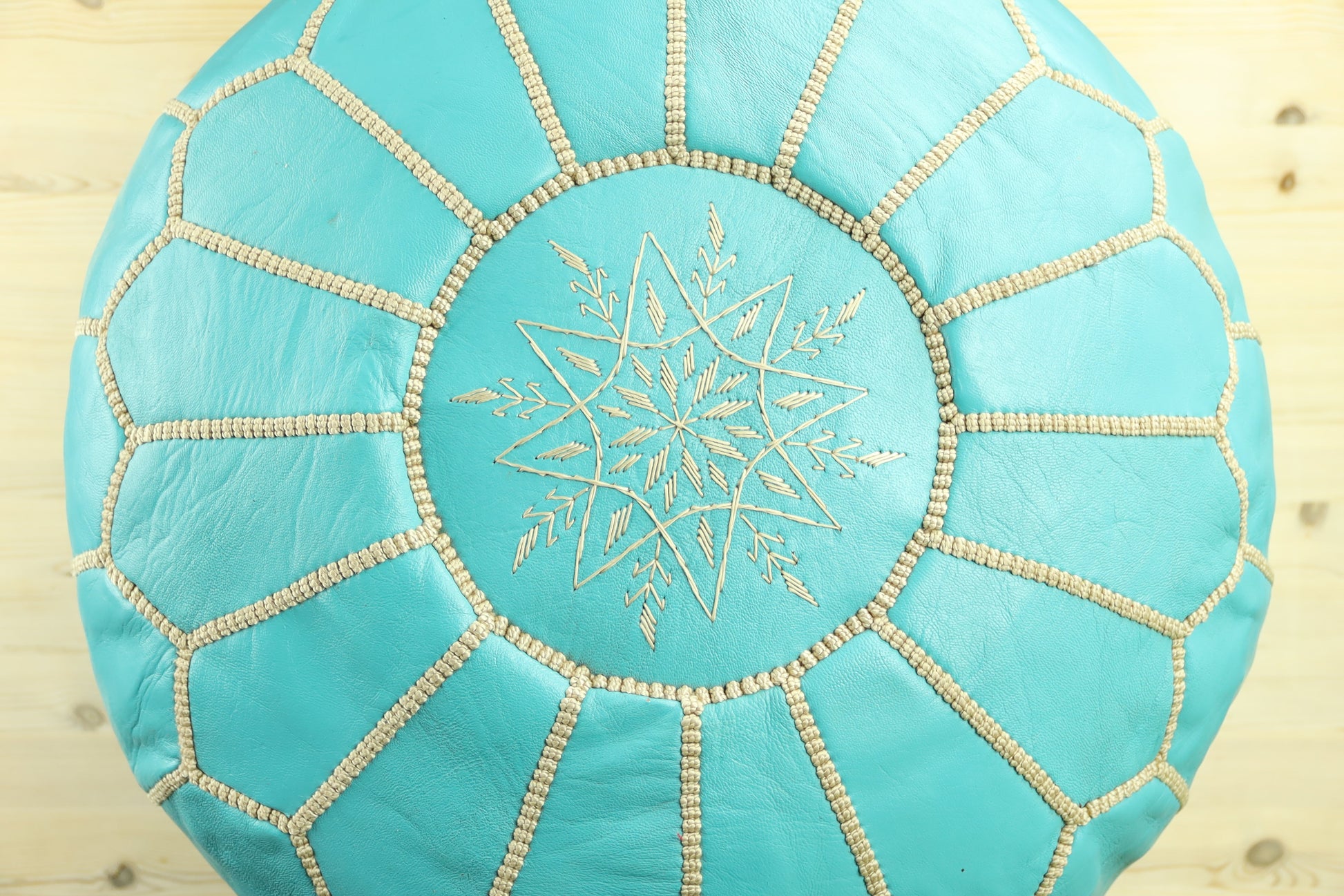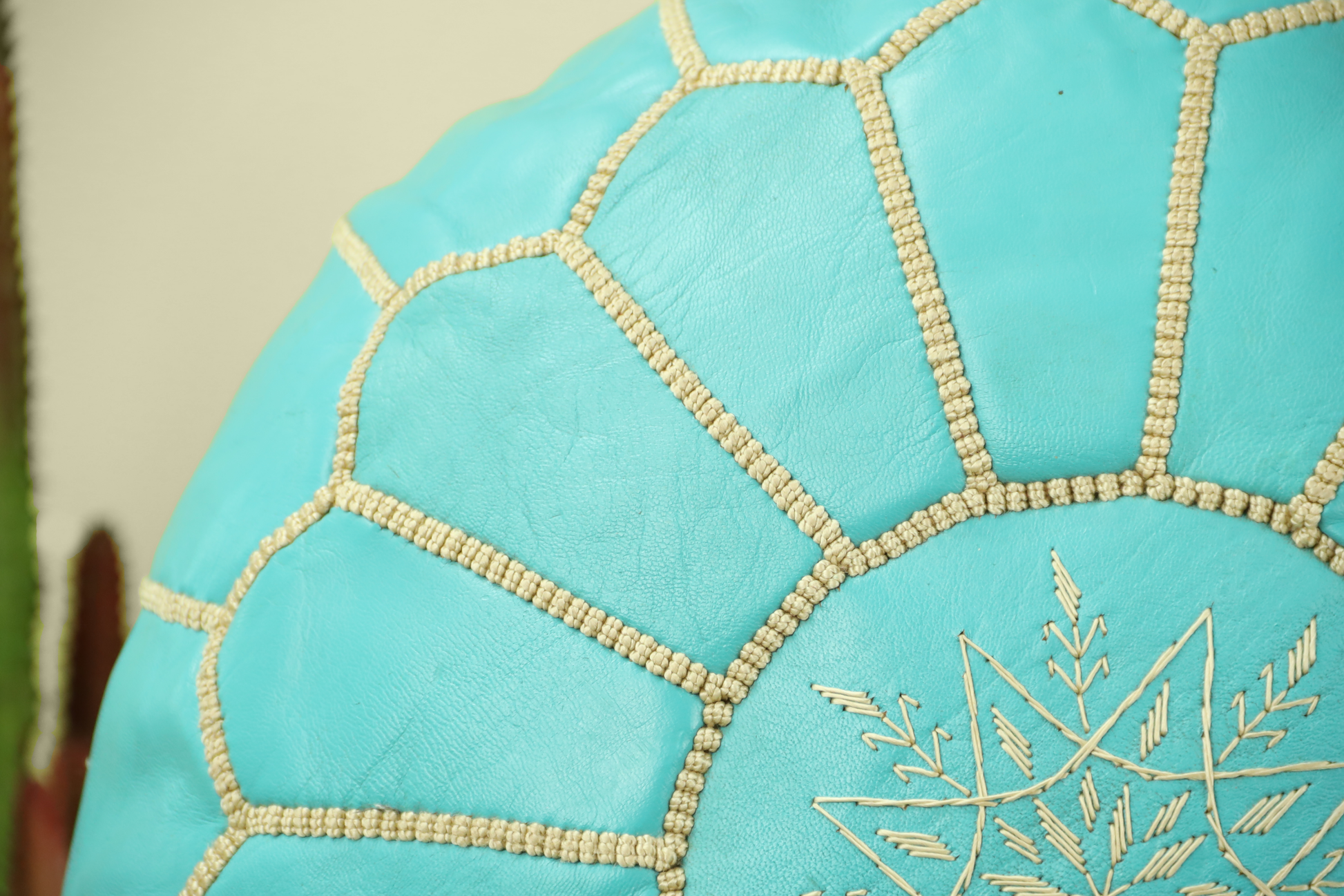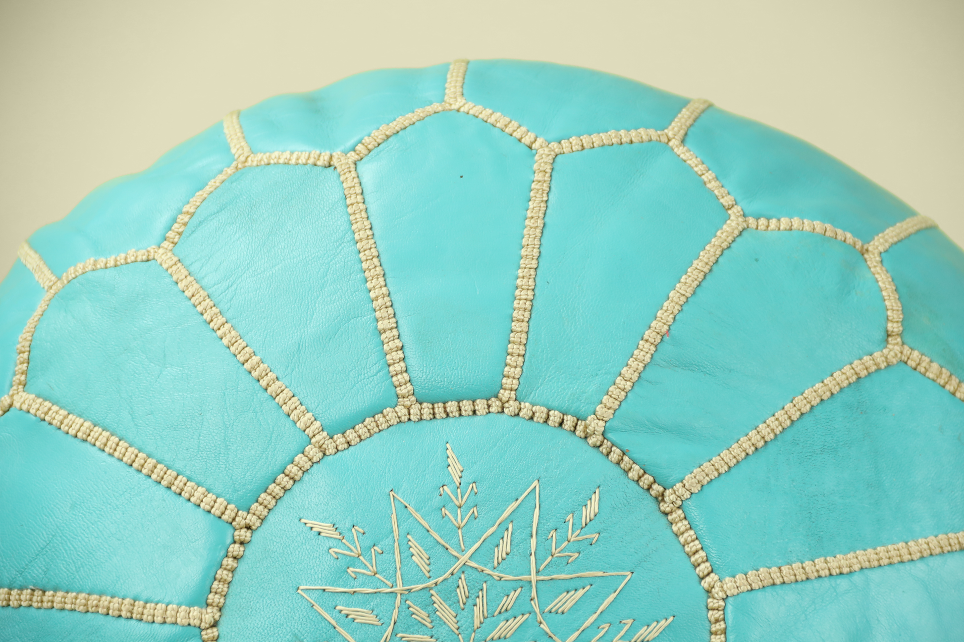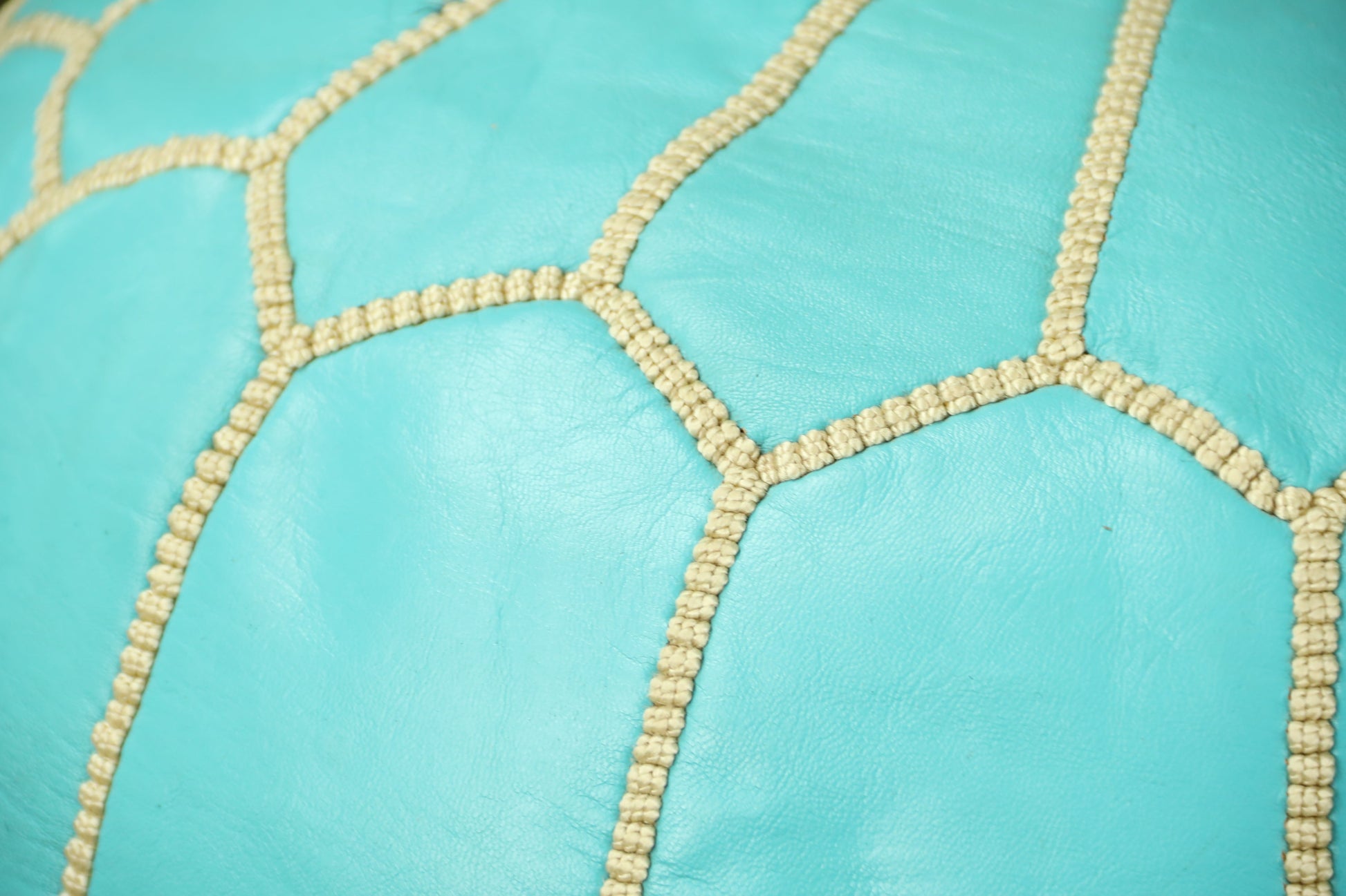 Each leather pouf is intricately handwoven by skilled Moroccan artisans.