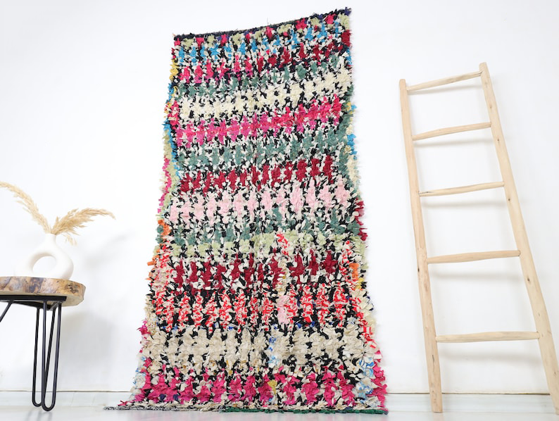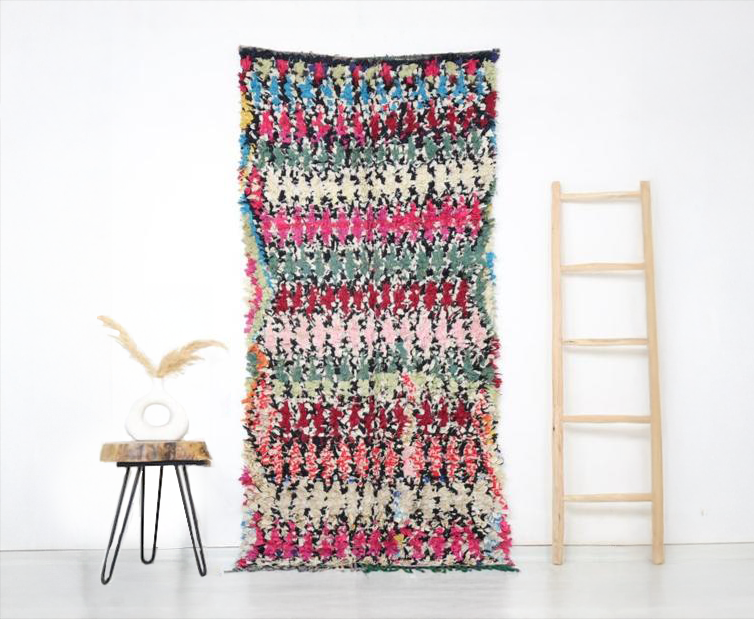 An unparalleled vintage masterpiece, carefully crafted by Berber Tribes in the Boucherouite style using upcycled textiles.