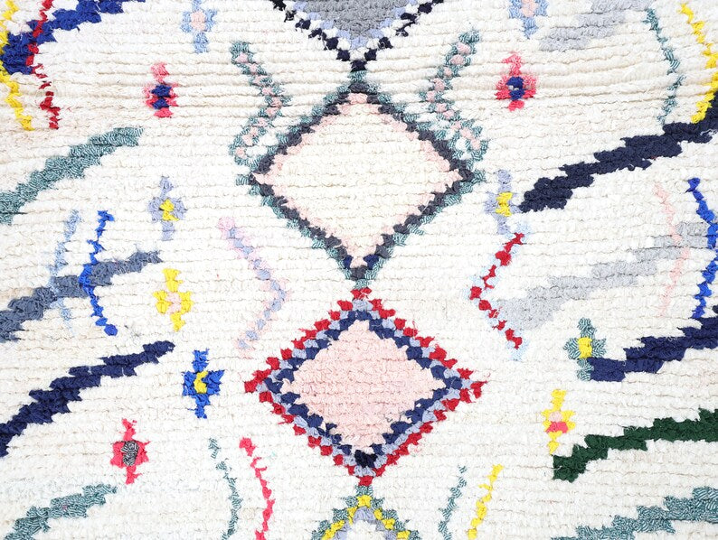 Azilal rugs boast abstract, painterly designs reminiscent of rugs from Ourika. What sets them apart is a vibrant color palette, achieved through the incorporation of cotton alongside wool..
