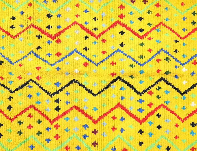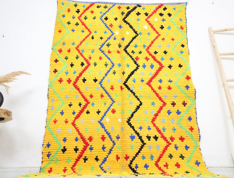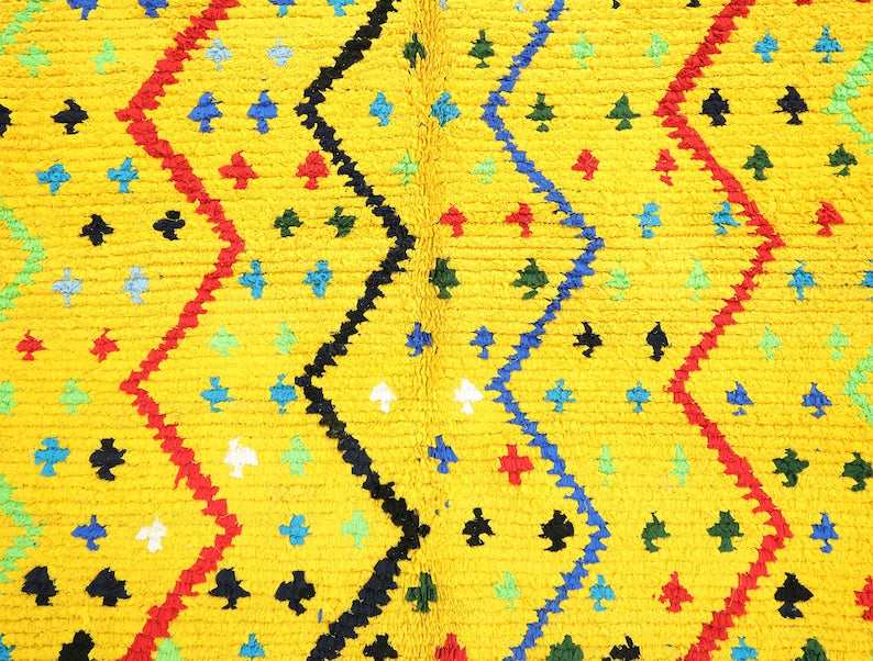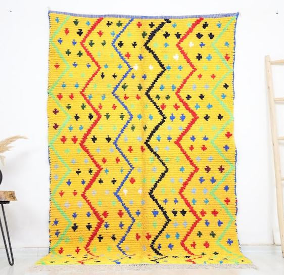 Azilal rugs boast abstract, painterly designs reminiscent of rugs from Ourika. What sets them apart is a vibrant color palette, achieved through the incorporation of cotton alongside wool..