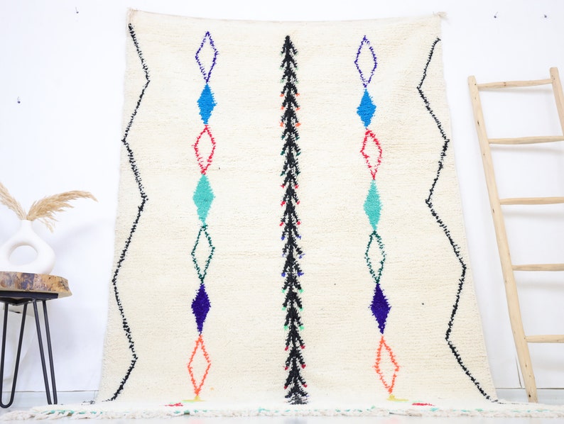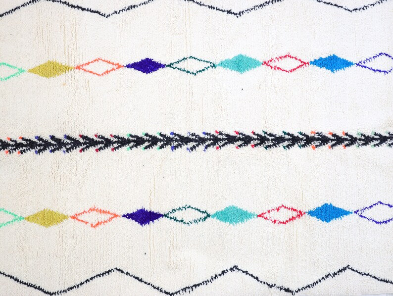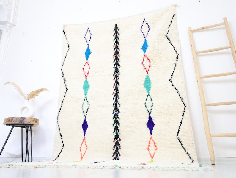 Azilal rugs boast abstract, painterly designs reminiscent of rugs from Ourika. What sets them apart is a vibrant color palette, achieved through the incorporation of cotton alongside wool.
