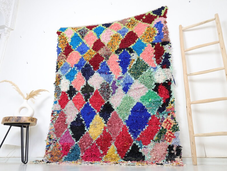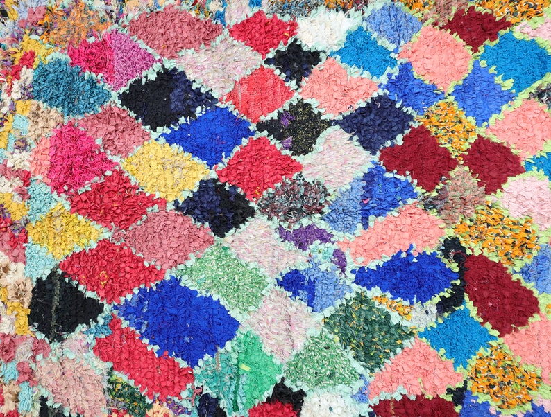 An unparalleled vintage masterpiece, carefully crafted by Berber Tribes in the Boucherouite style using upcycled textiles.
