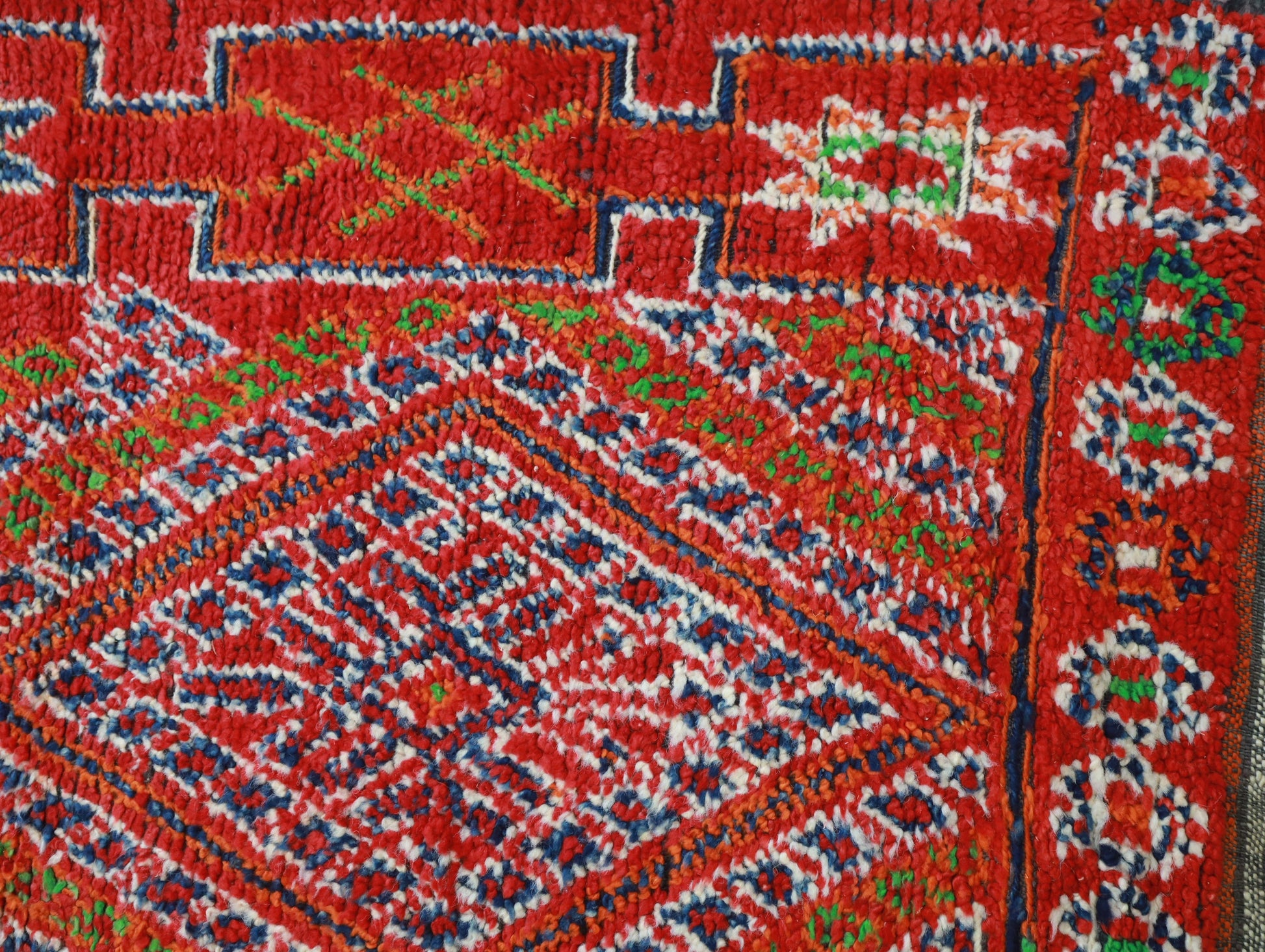 Wool, a sacred material for the Amazigh (Berber) people, forms the cornerstone of Moroccan rug design. Durable, long-lasting, and soft underfoot, wool is both functional and comfortable. In this piece, the wool pile is expertly knotted onto a wool foundation, adding substance and allowing it to gracefully embrace the floor.